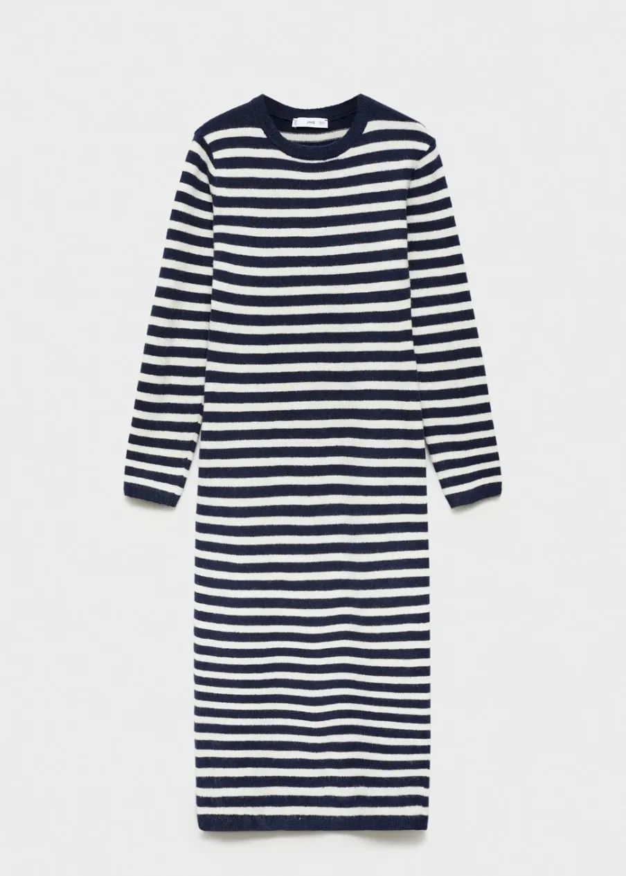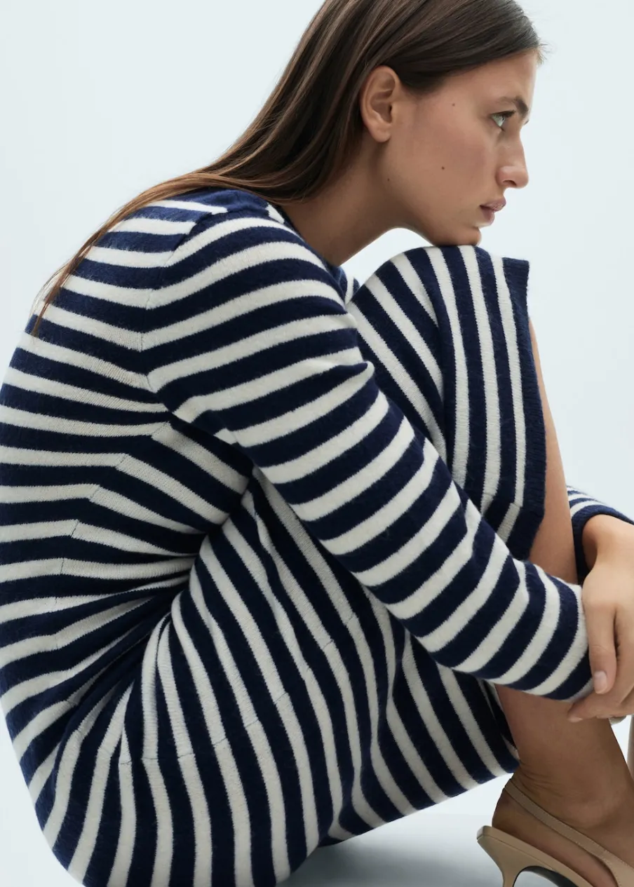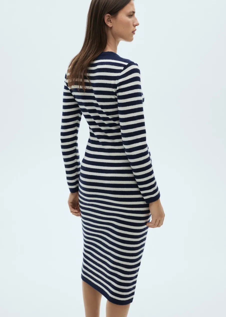 Dzianina średniej grubości. Wzór w pasy. Model prosty. Krój do kolan. Okrągły dekolt. Długi rękaw. Modelka ma 177 cm wzrostu i nosi rozmiar S/36.