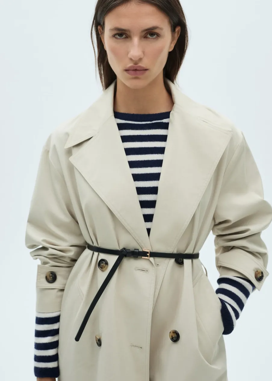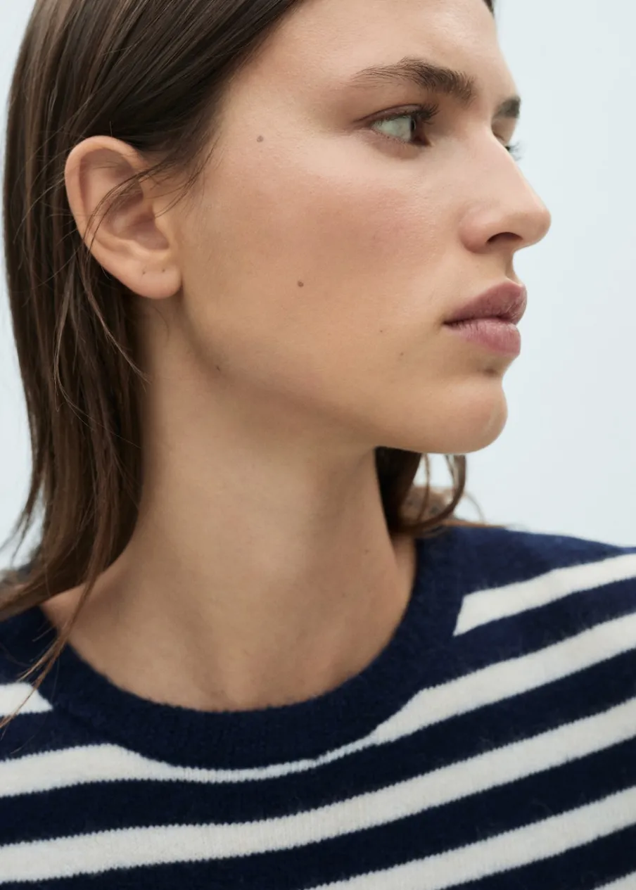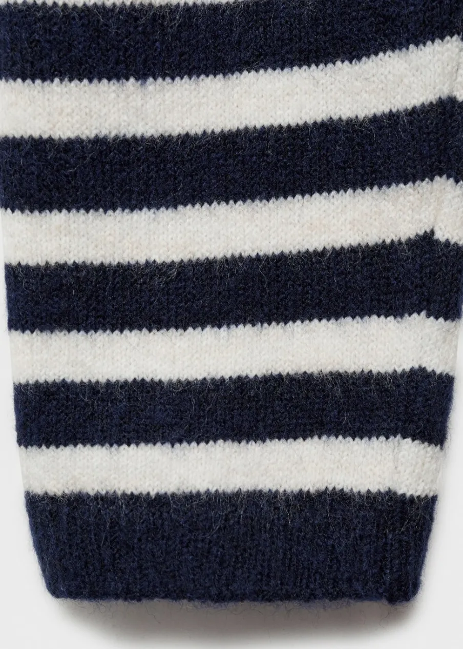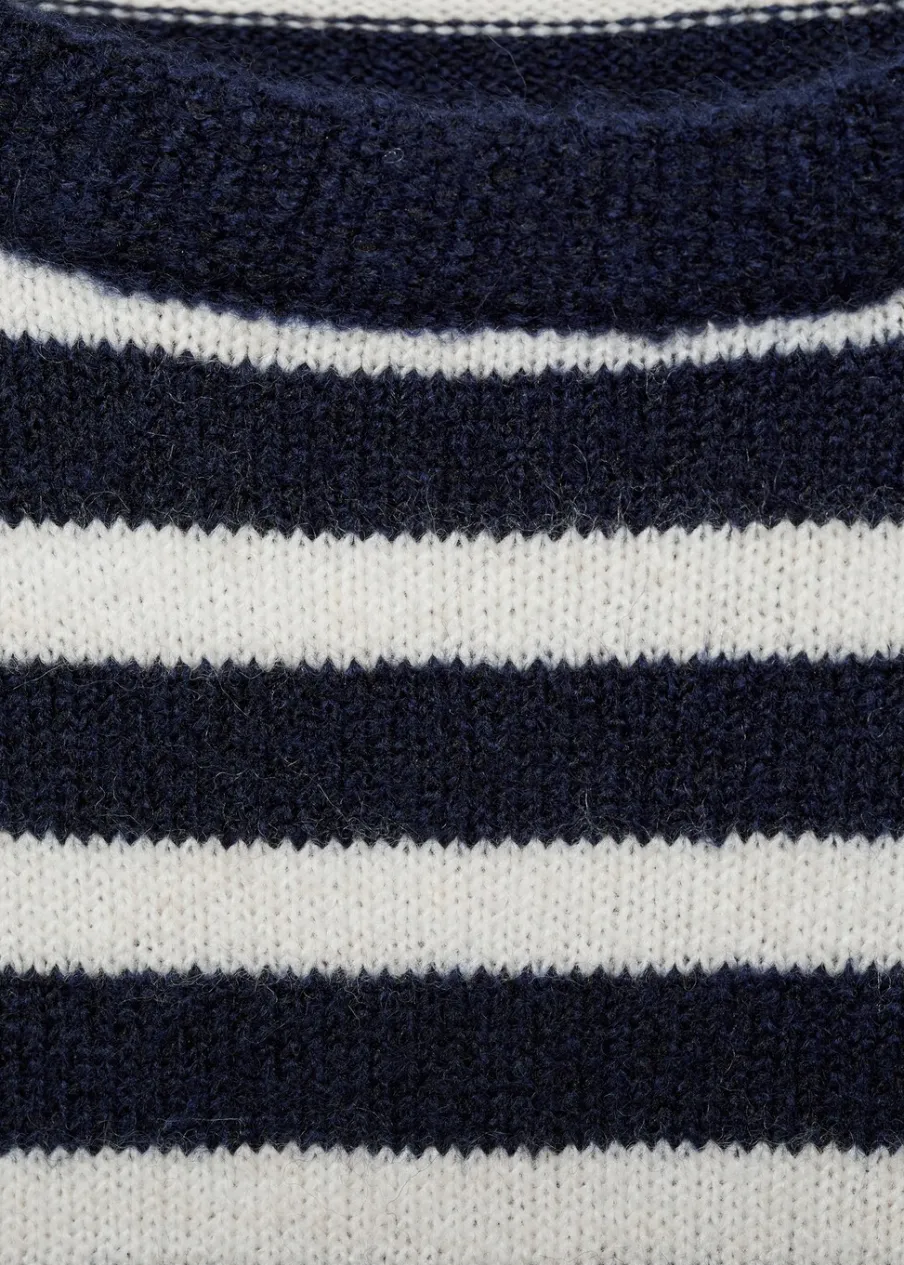 Dzianina średniej grubości. Wzór w pasy. Model prosty. Krój do kolan. Okrągły dekolt. Długi rękaw. Modelka ma 177 cm wzrostu i nosi rozmiar S/36.