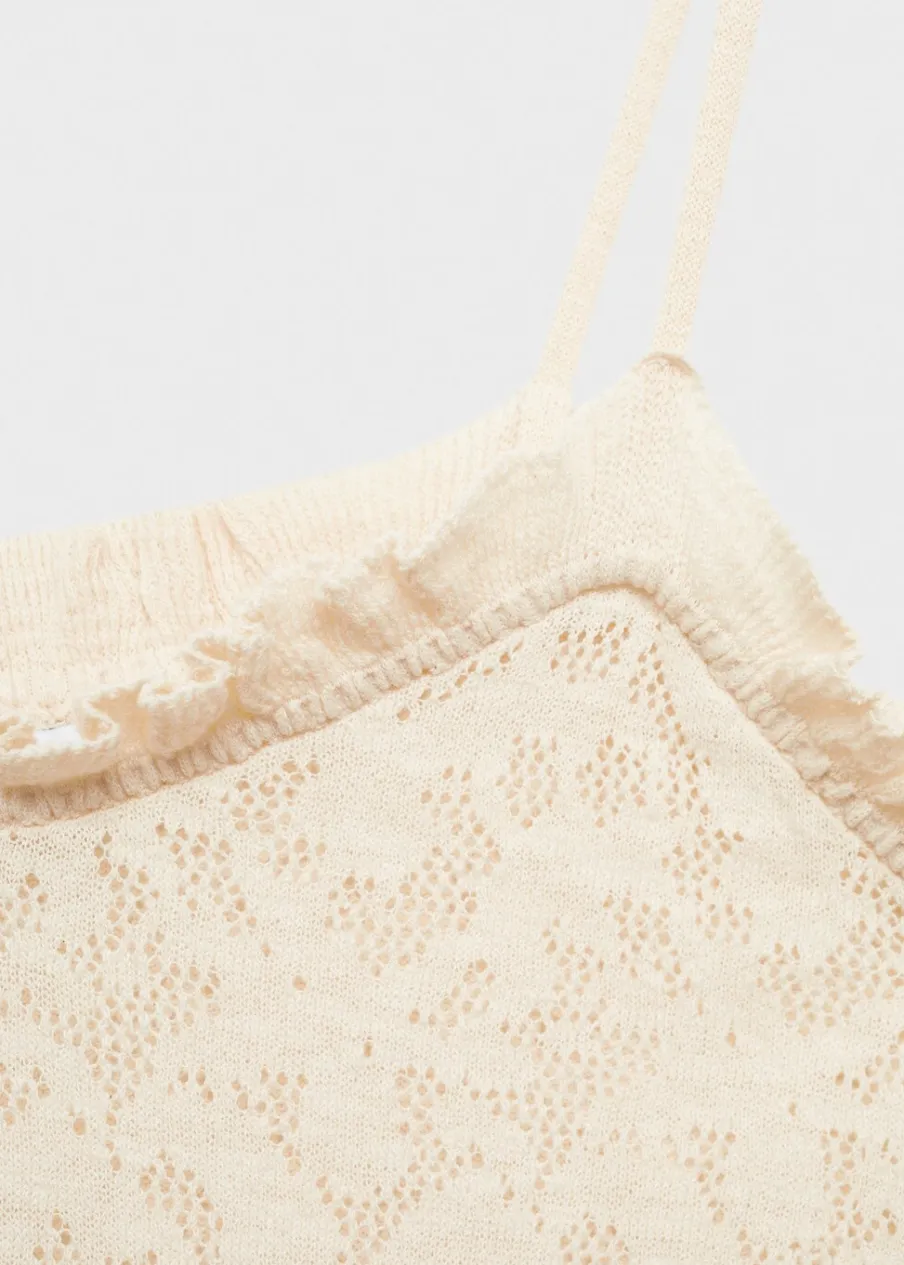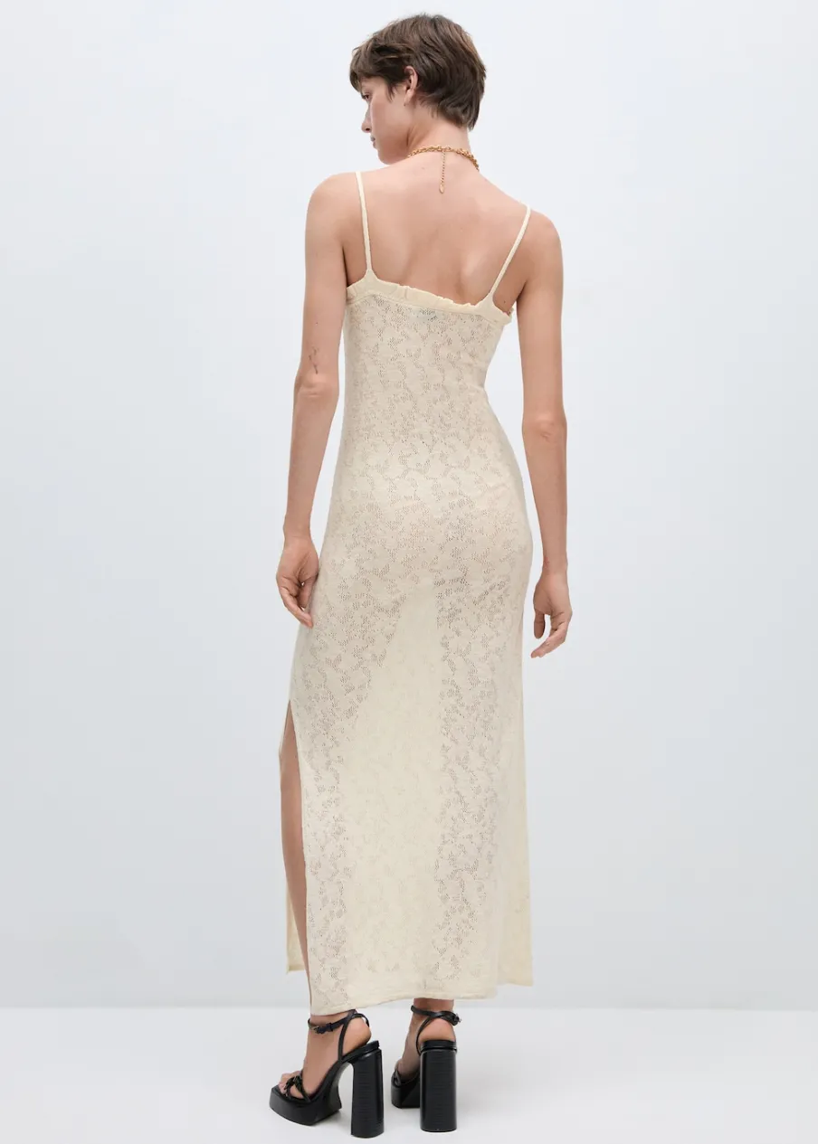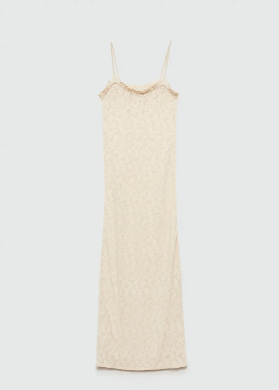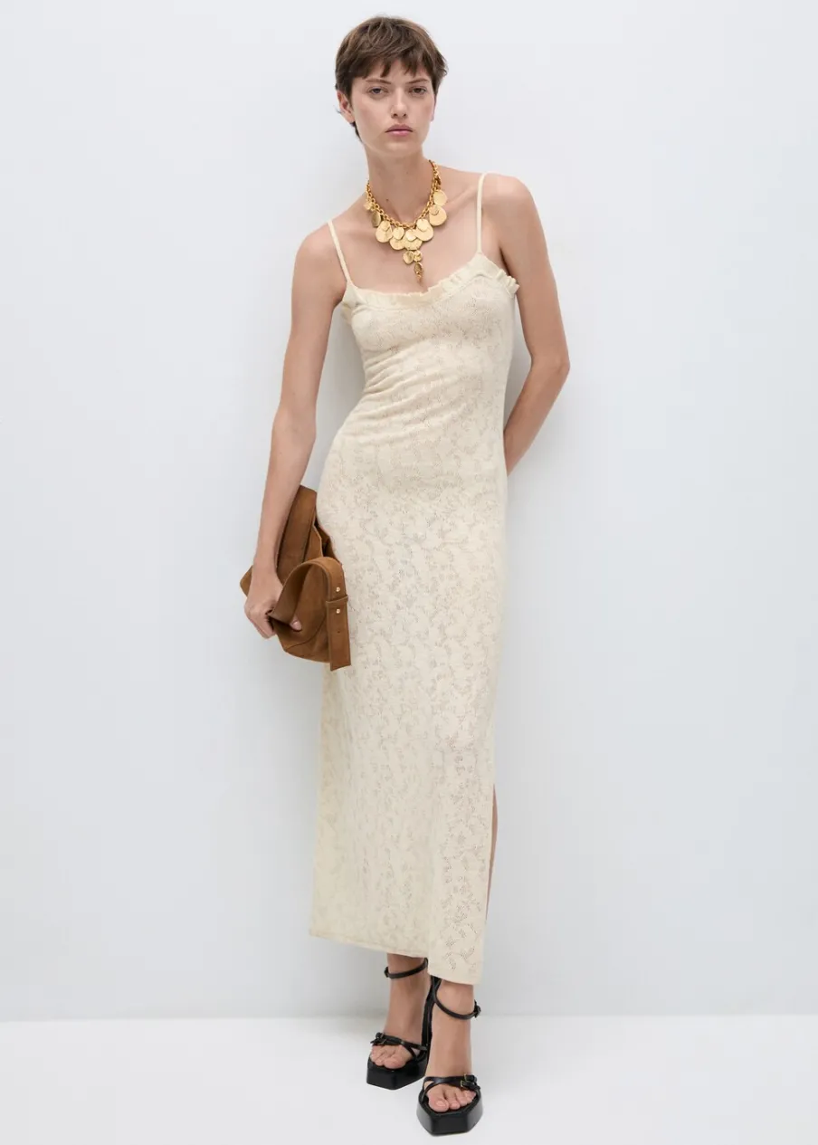 Tkanina z cienkiej dzianiny. Tkanina mieszanka bawełny. Model długi. Dekolt. Cienkie ramiączka. Ażurowe detale. Wykończenie z falbankami. Model wcięty.