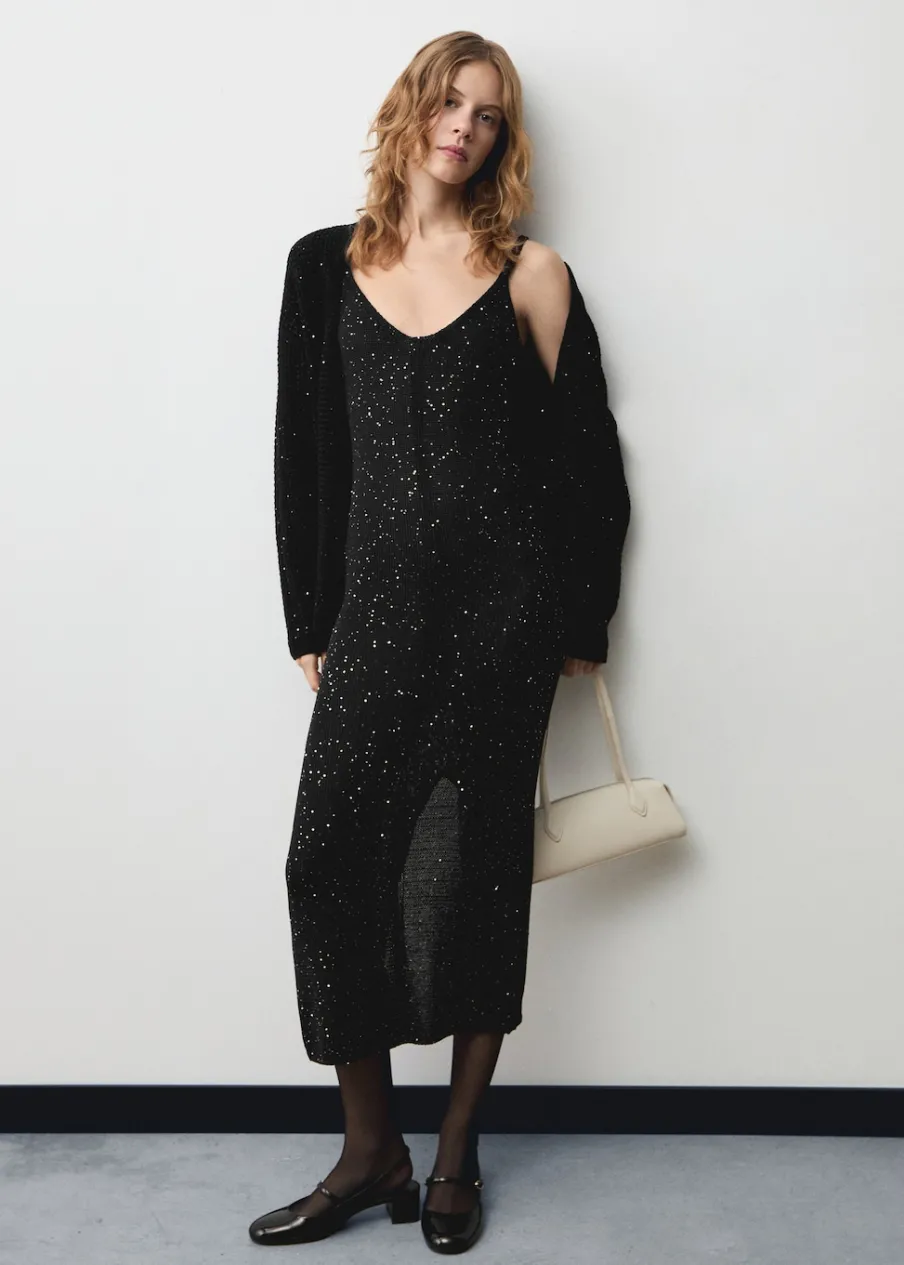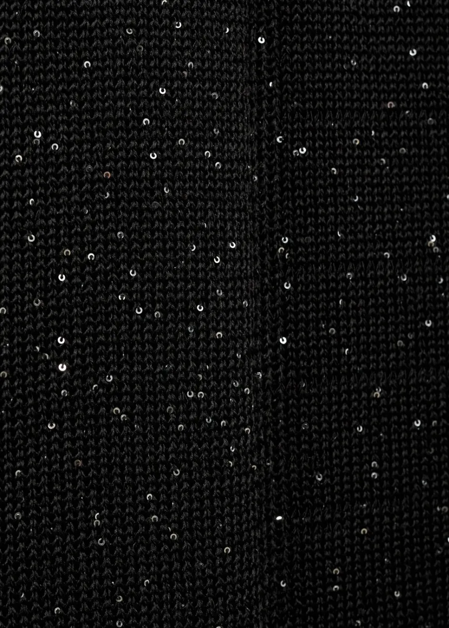Dzianina średniej grubości. Tkanina z cekinami. Krój do kolan. Model wcięty. Dekolt V. Cienkie ramiączka. Kolekcja wizytowa. Modelka ma 179 cm wzrostu i nosi rozmiar S/36.