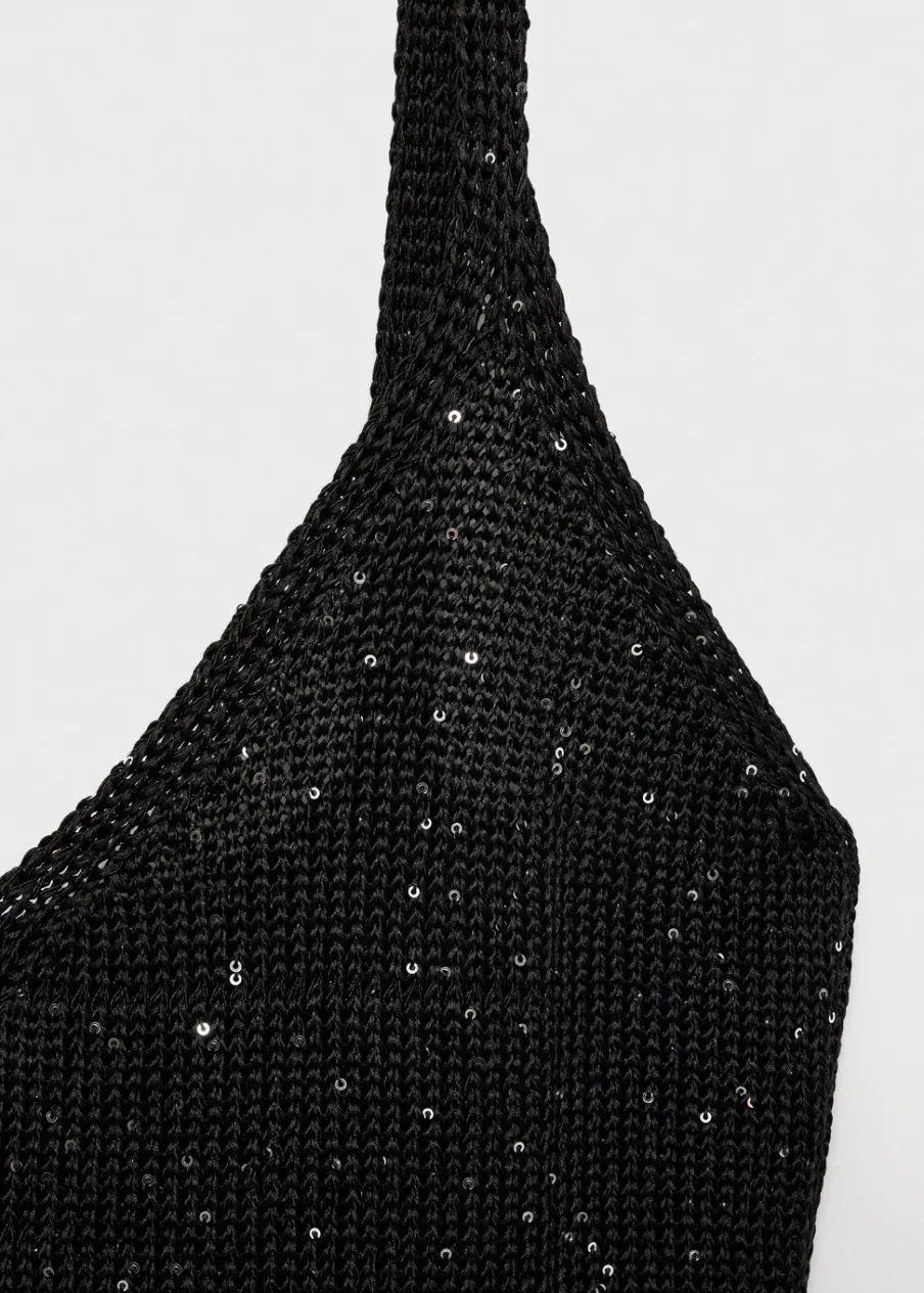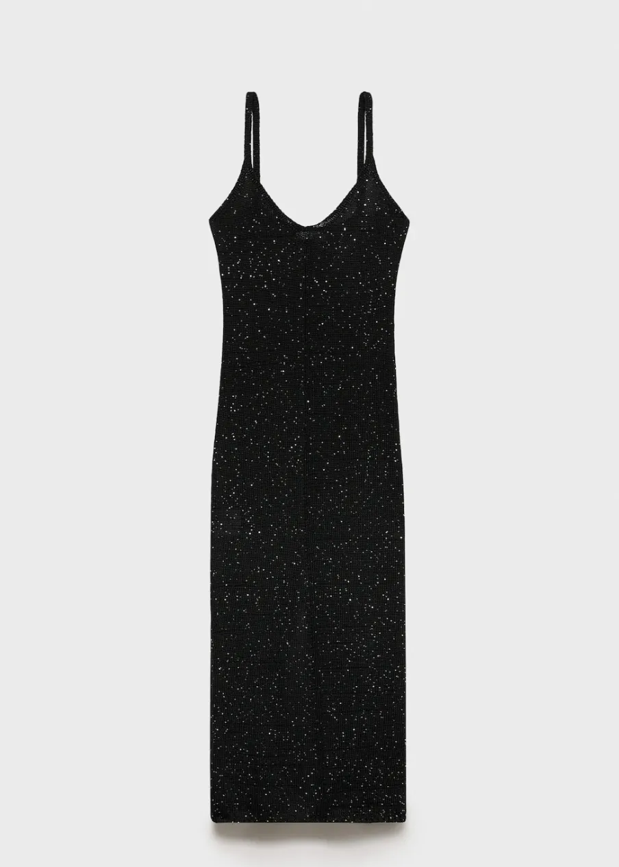 OpisDzianina średniej grubości. Tkanina z cekinami. Krój do kolan. Model wcięty. Dekolt V. Cienkie ramiączka. Kolek…