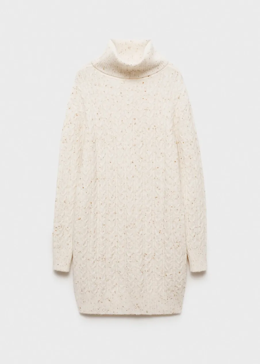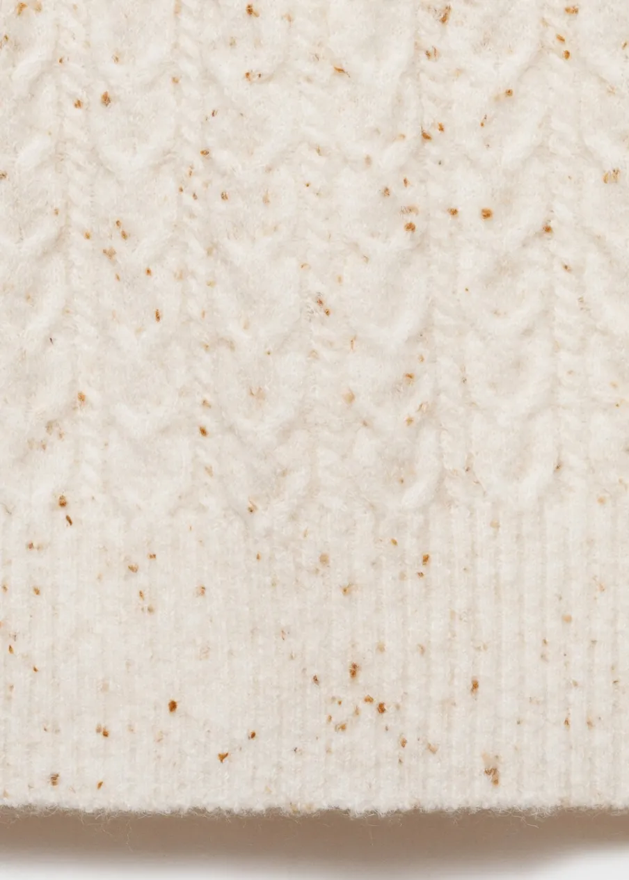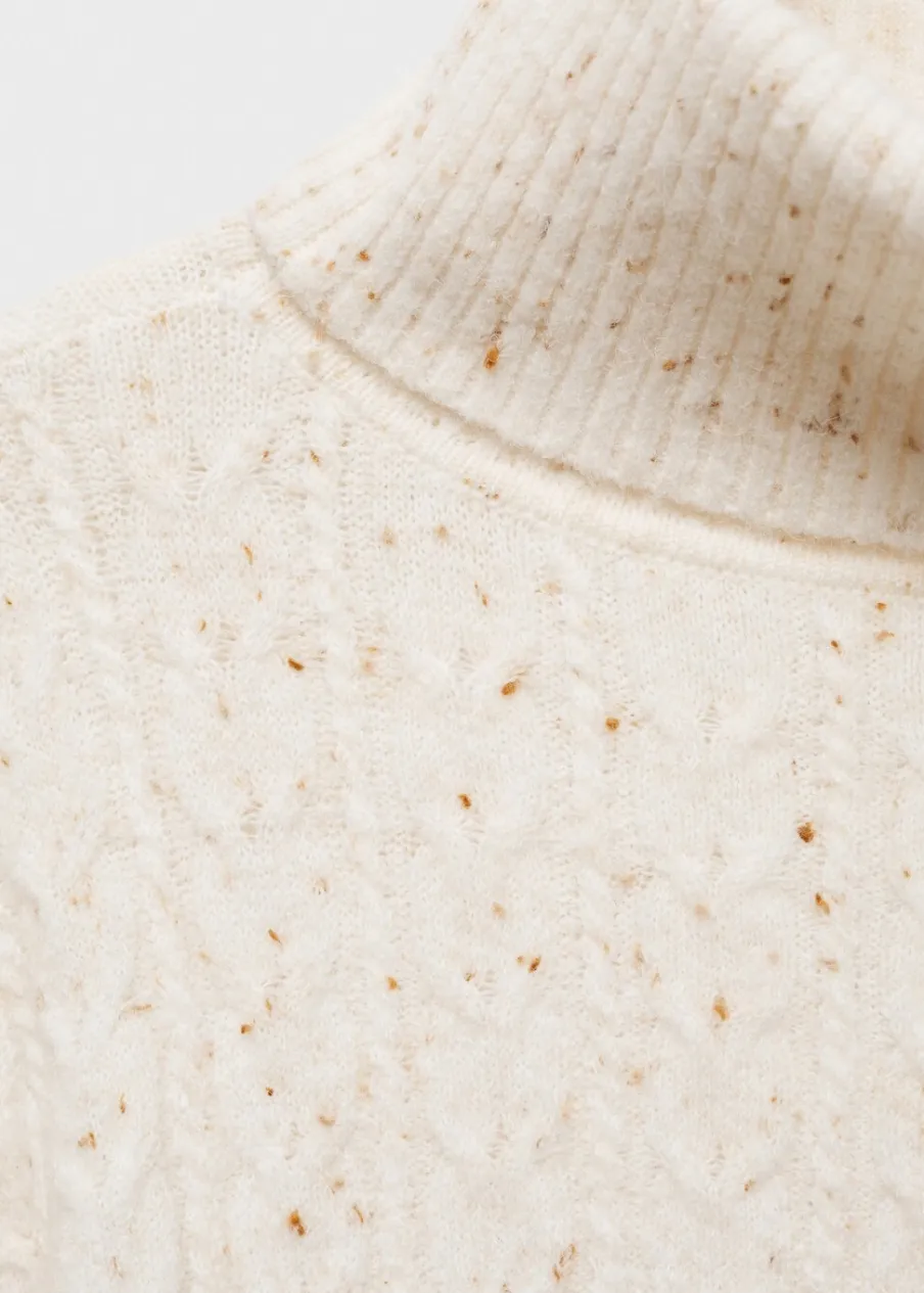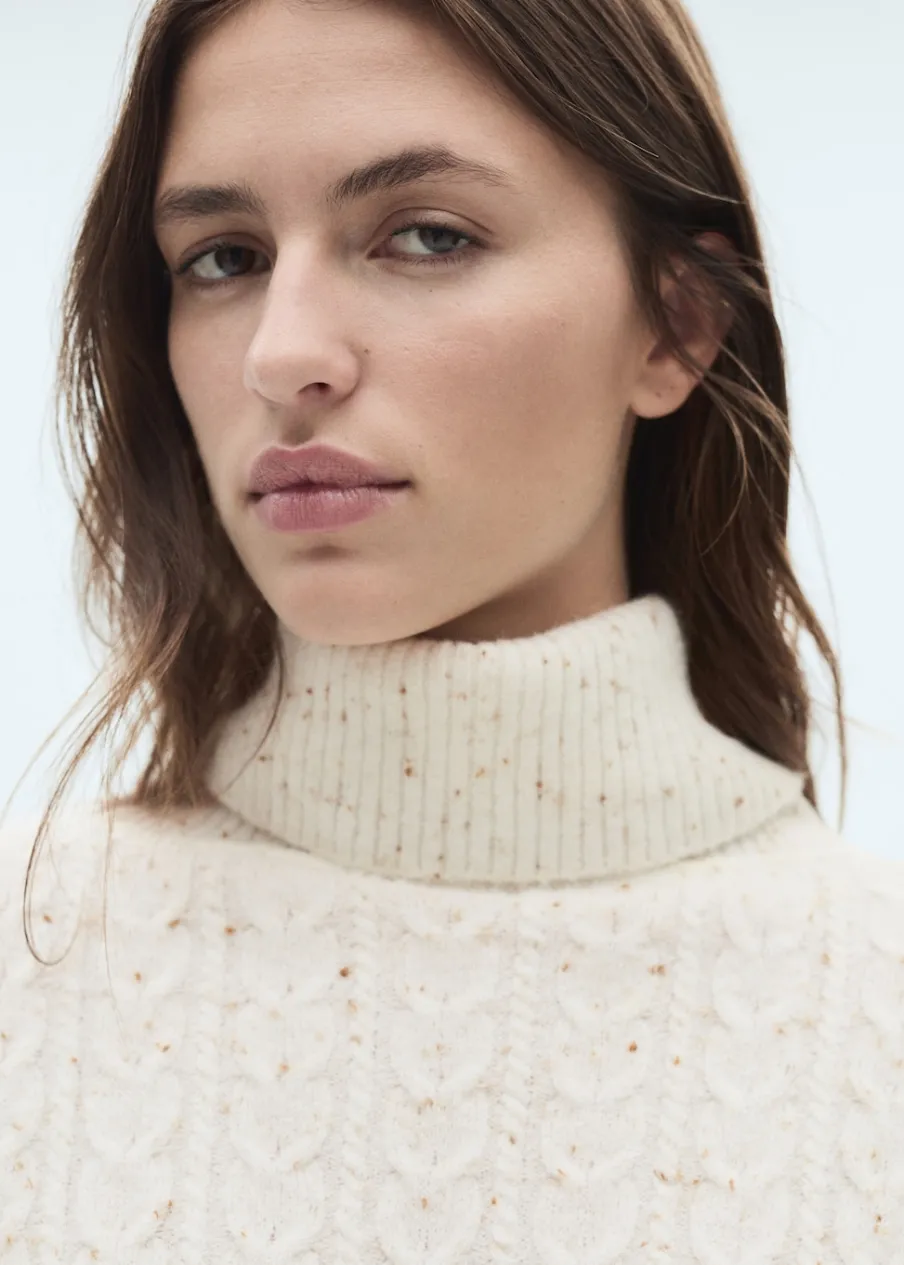 Tkanina z grubej dzianiny. Golf. Długi rękaw. Model prosty. Bez zapięcia. Krótki krój. Dzianina ze splotem warkoczowym. Modelka ma 179 cm wzrostu i nosi rozmiar S/36.