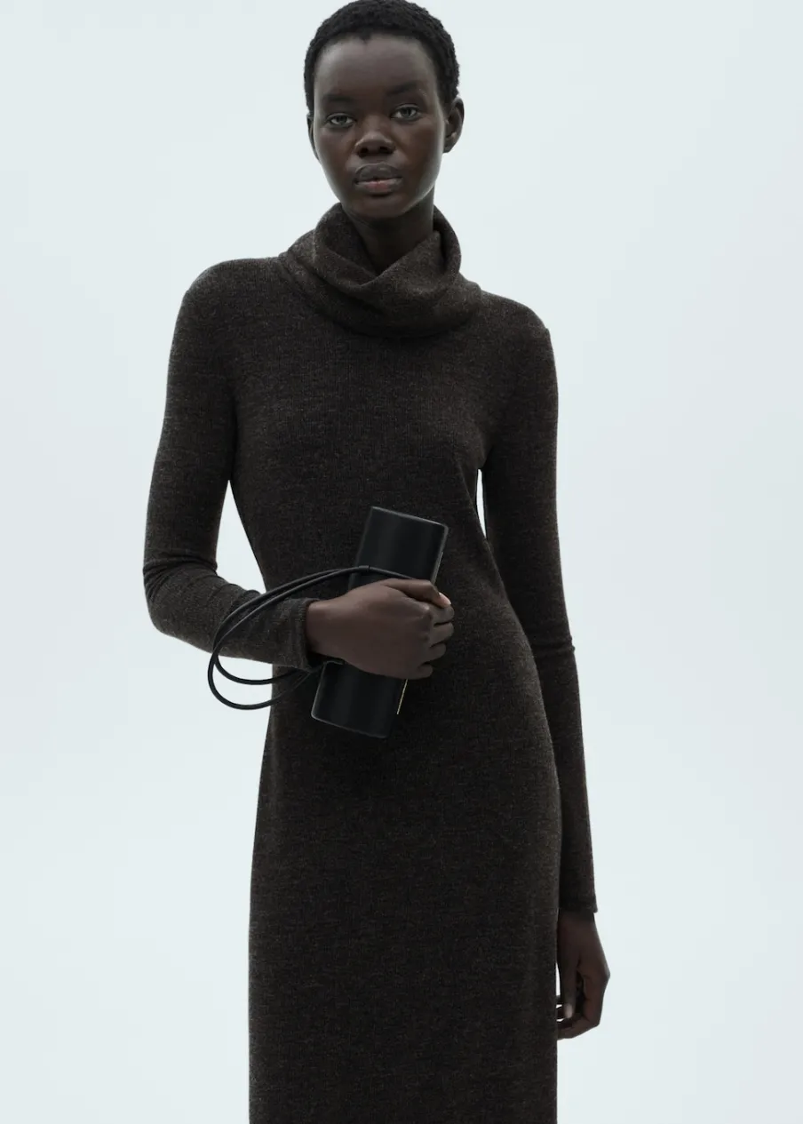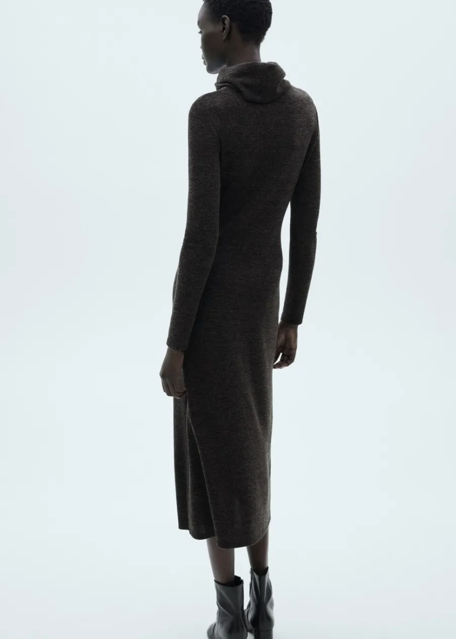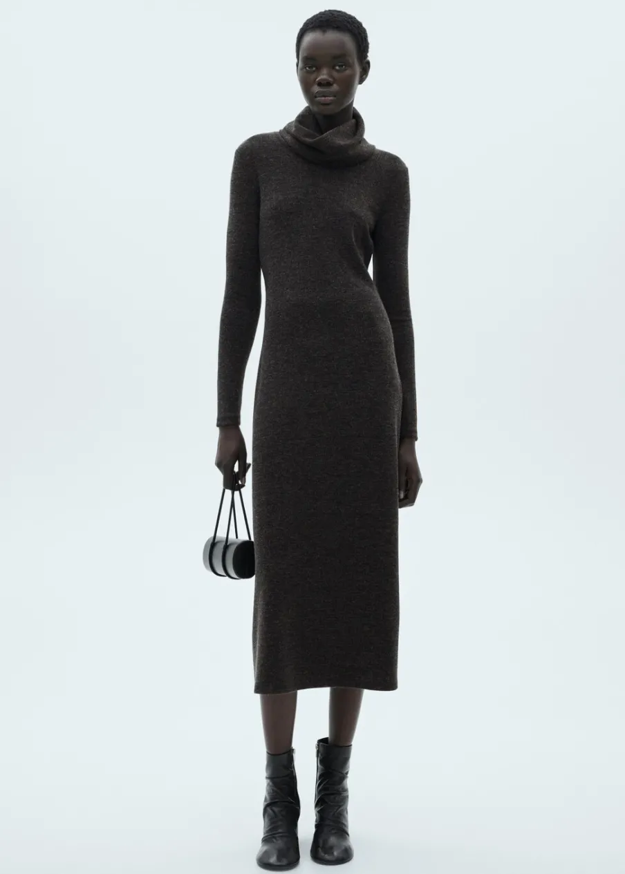 OpisDzianinowa tkanina. Cienka tkanina. Model evasé. Golf. Krój do kolan. Wywinięty kołnierz. Długi rękaw. Bez zap…