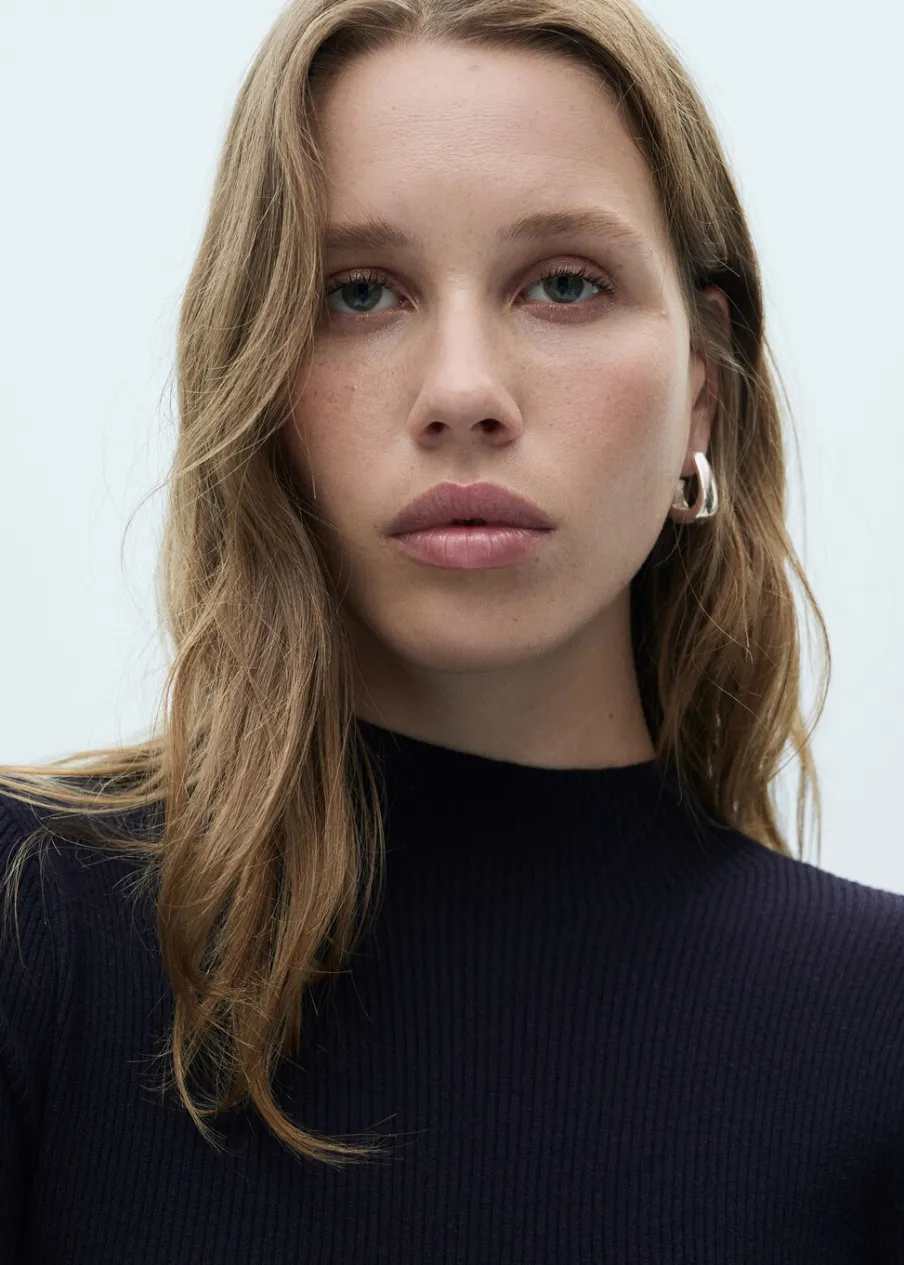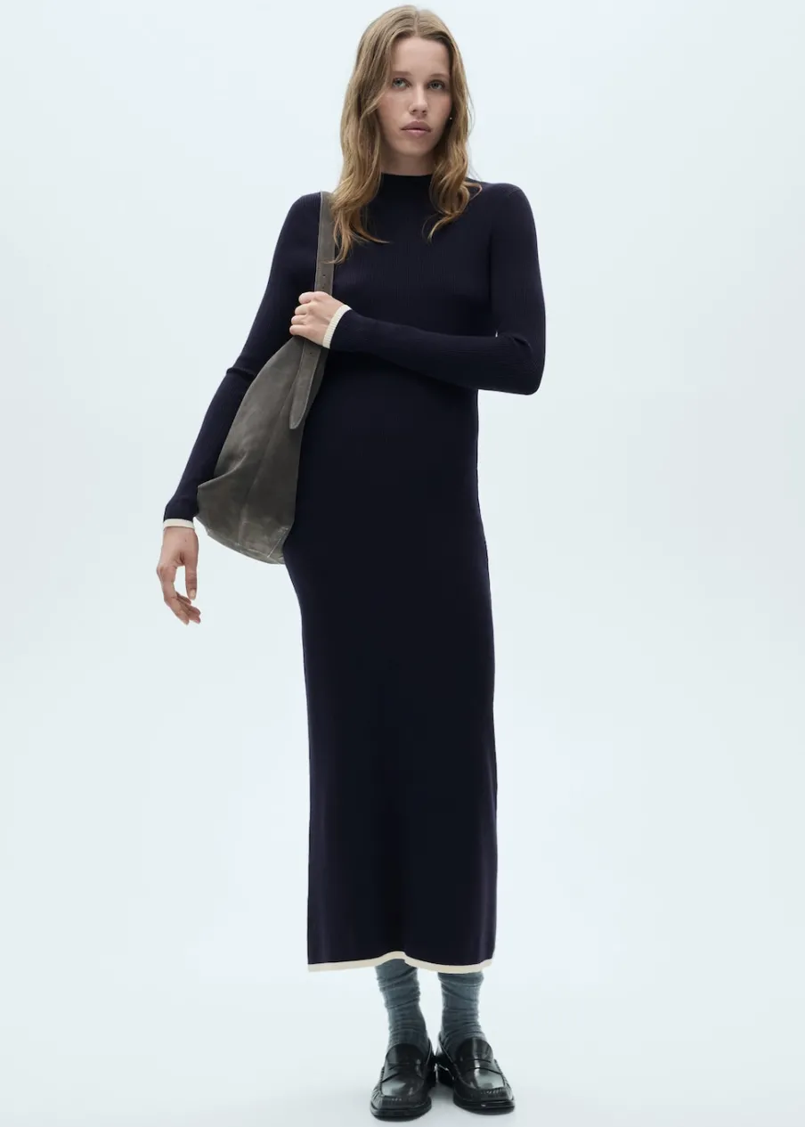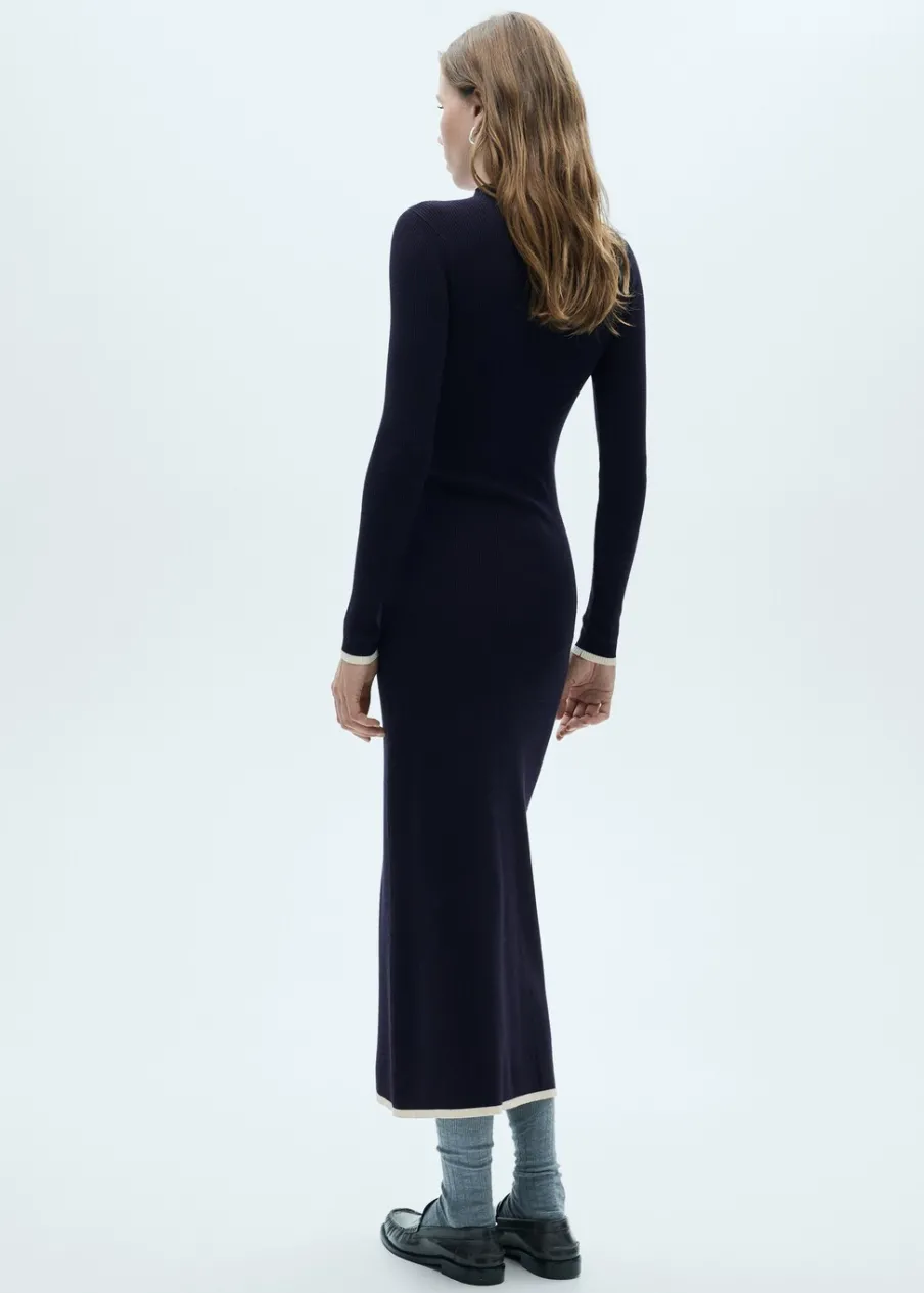 Tkanina z cienkiej dzianiny. Model długi. Okrągły dekolt. Długi rękaw. Bez zapięcia. Kontrastowe wykończenia. Modelka ma 175 cm wzrostu i nosi rozmiar S/36. Model wcięty.