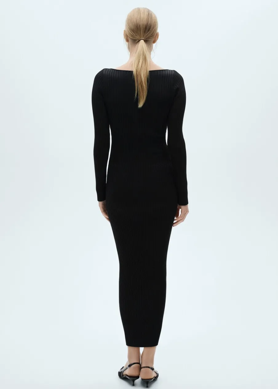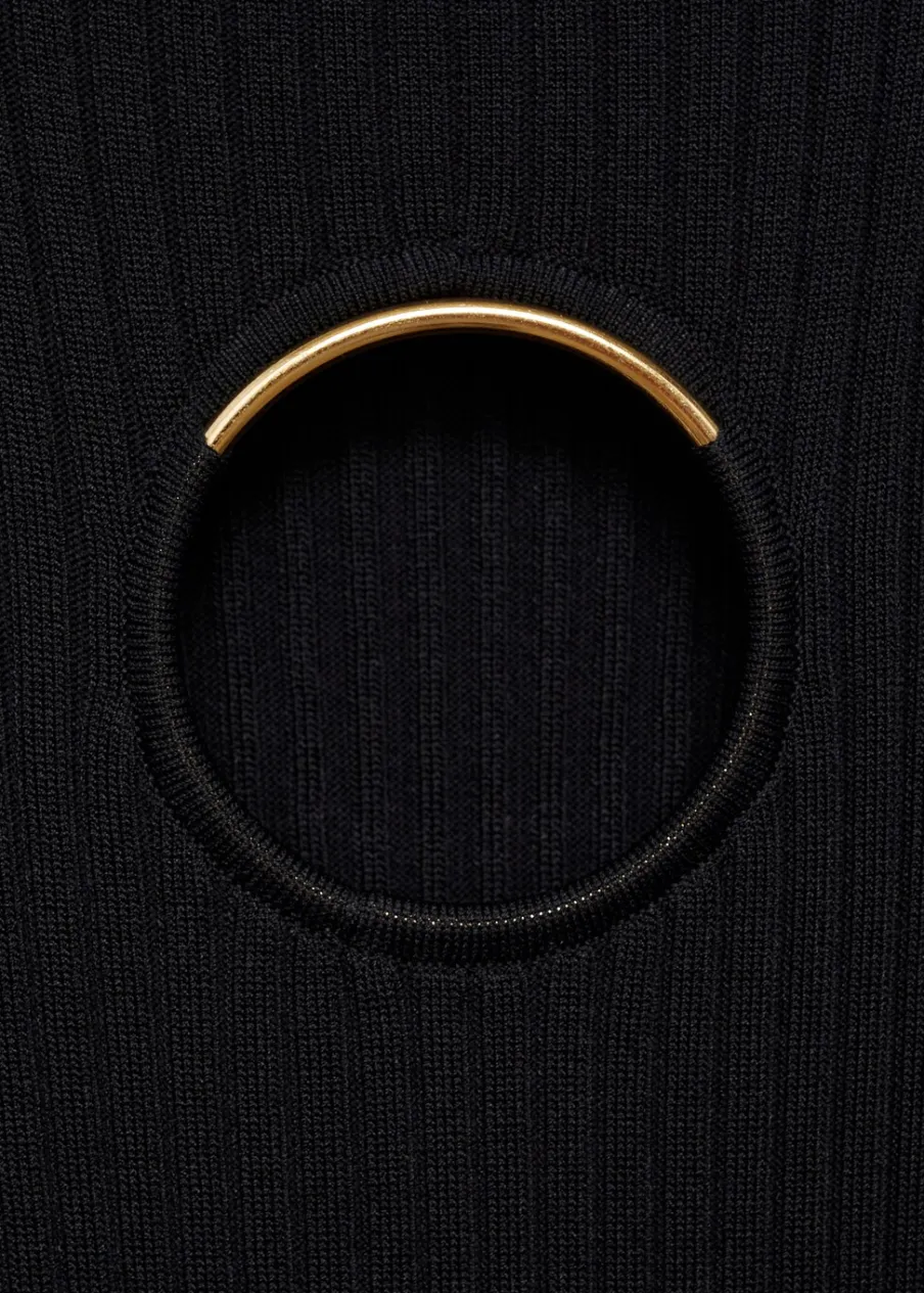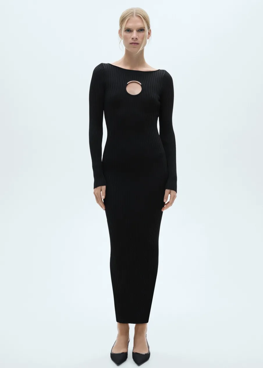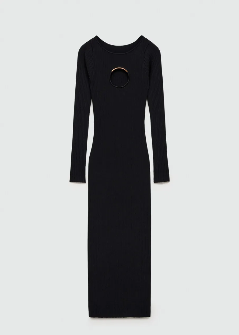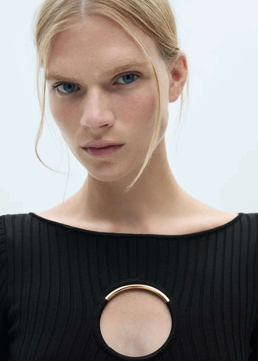 Tkanina z cienkiej dzianiny. Model wcięty. Model długi. Okrągły dekolt. Długi rękaw. Detal z rozcięciem. Metalowy element. Modelka ma 178 cm wzrostu i nosi rozmiar S/36. Kolekcja wizytowa.