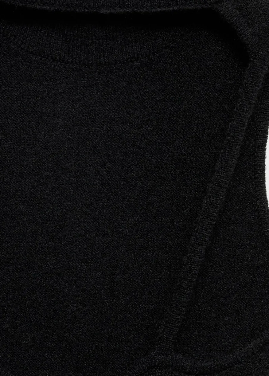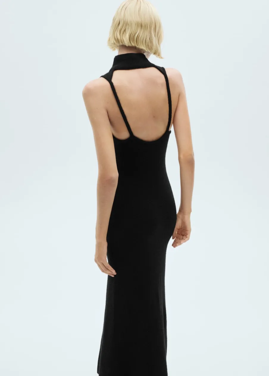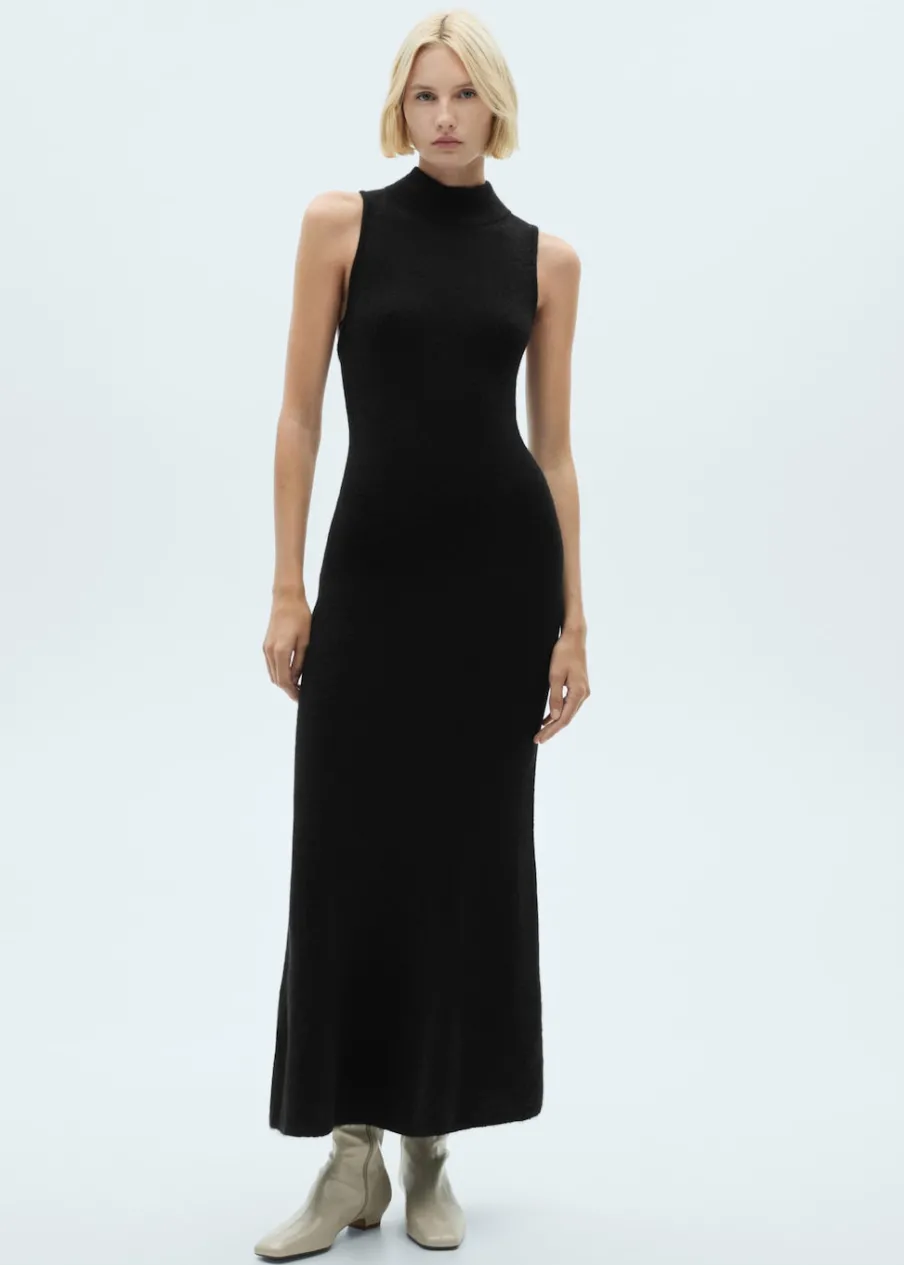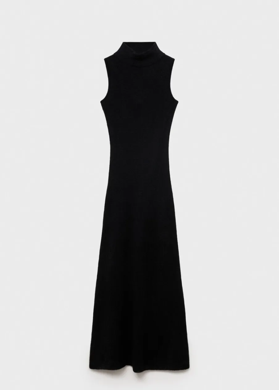 Półgolf. Bez rękawów. Dekolt na plecach. Bez zapięcia. Dzianinowa tkanina. Model wcięty. Model długi. Modelka ma 179 cm wzrostu i nosi rozmiar S/36.