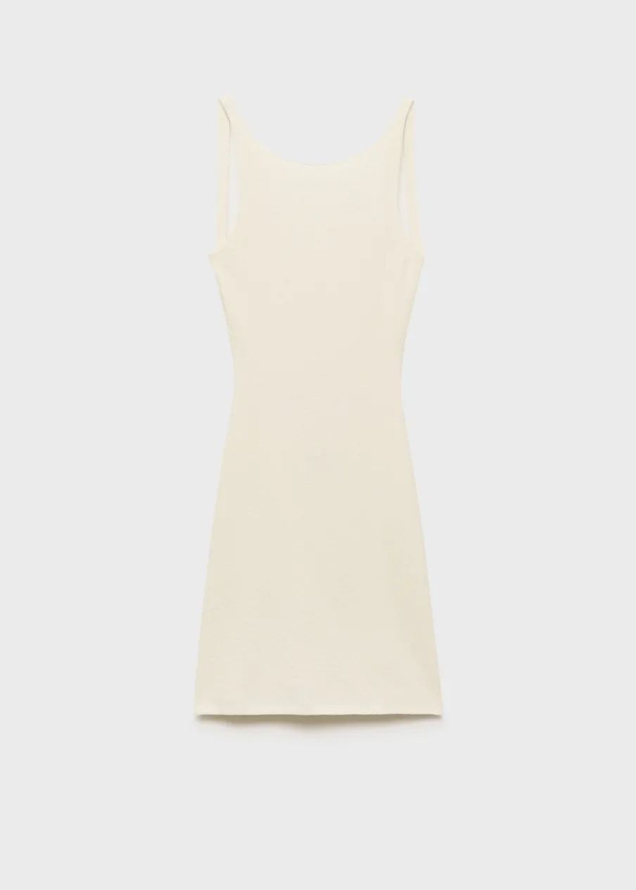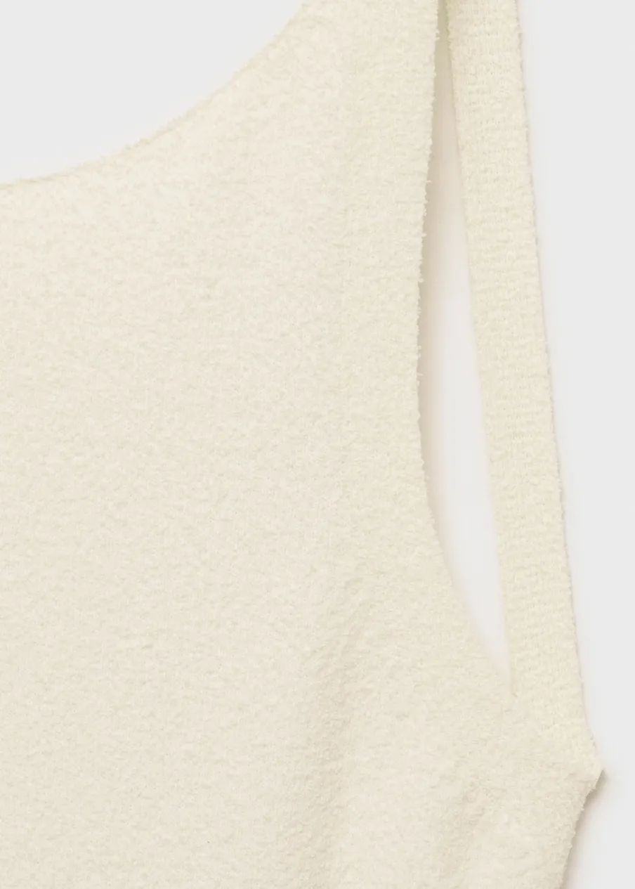 Tkanina z cienkiej dzianiny. Krótki krój. Okrągły dekolt. Bez rękawów. Cienkie ramiączka. Plecy z wycięciem. Bez zapięcia. Model wcięty.