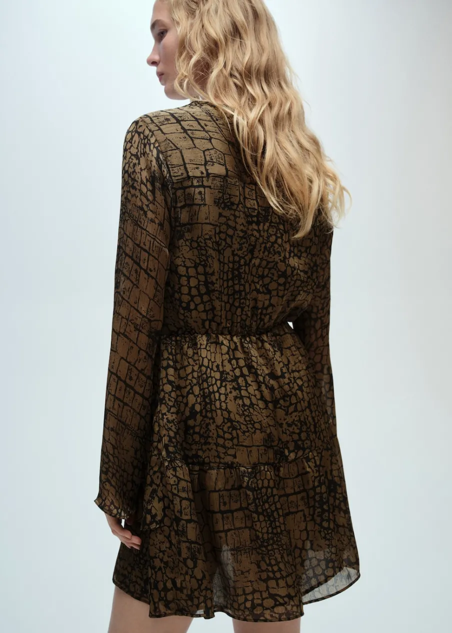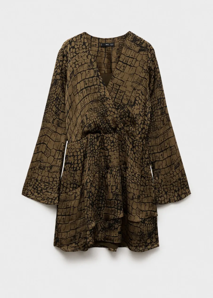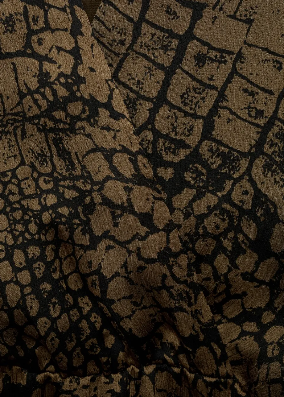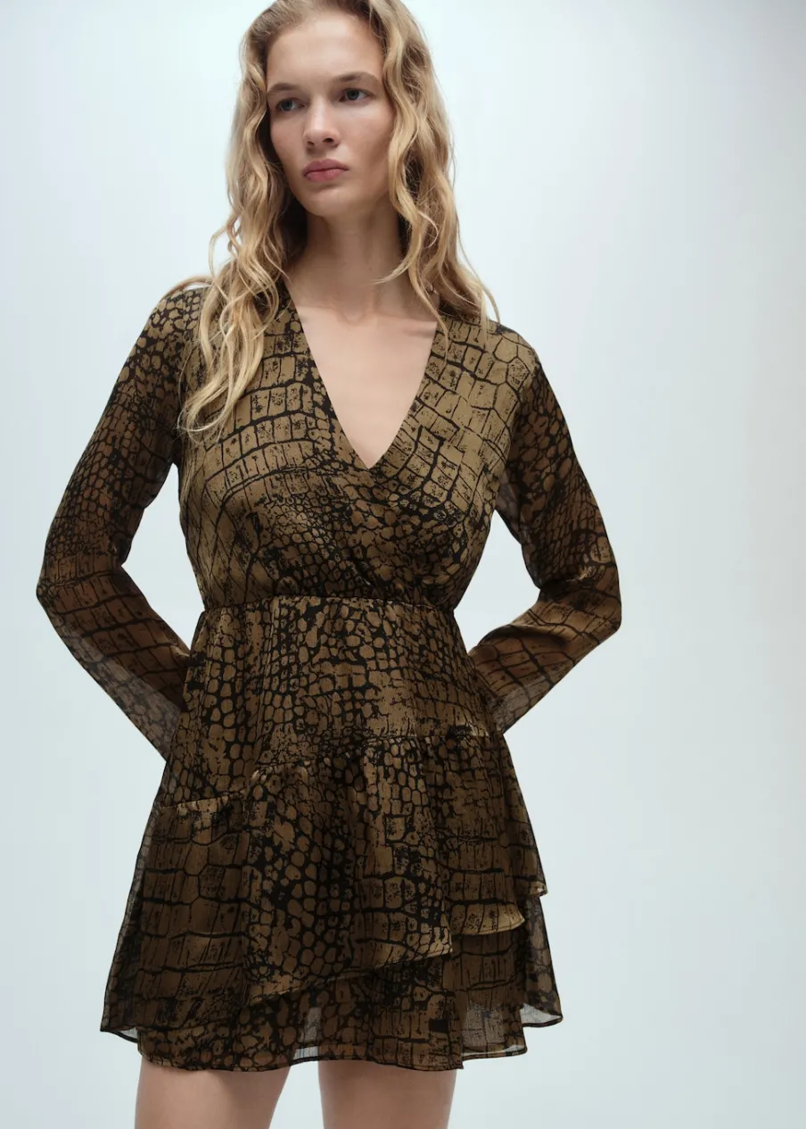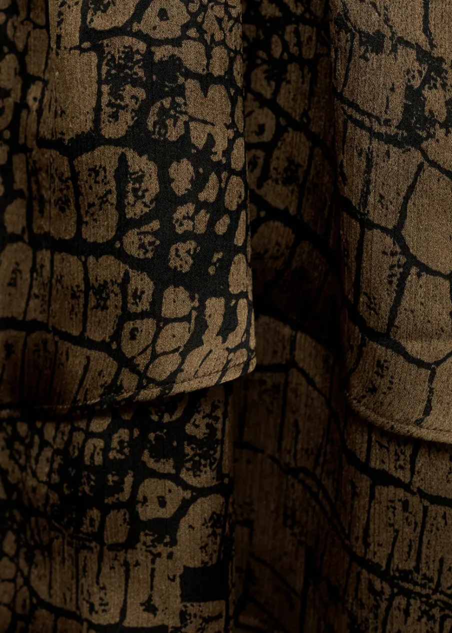 Cienka tkanina. Krótki krój. Model evasé. Dekolt V. Zakładany kołnierz. Długi, rozszerzany rękaw. Wcięta talia. Zapięcie z boku. Falbanki u dołu. Tylko podszewka. Dostępne w Plus Size.