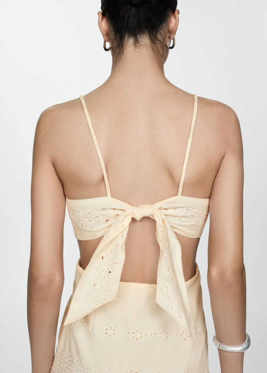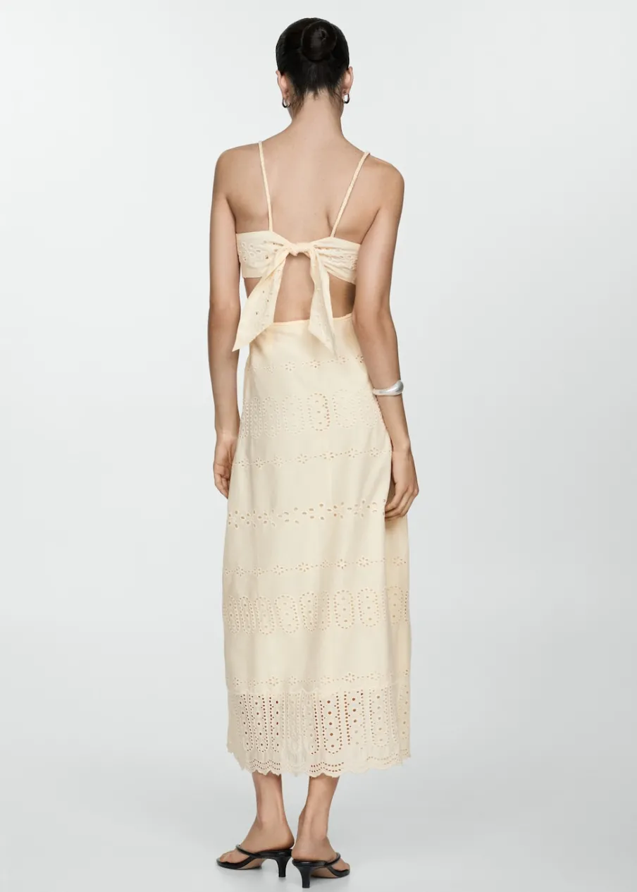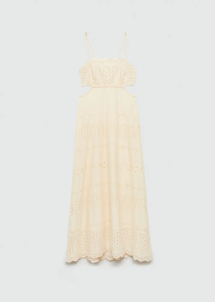 Haftowana tkanina. Model evasé. Krój do kolan. Wycięcie. Kwadratowy dekolt. Bez rękawów. Cienkie ramiączka. Boczne zapięcie na suwak. Wewnętrzna podszewka. Rozcięcia po bokach. Tkanina z 100% bawełny.