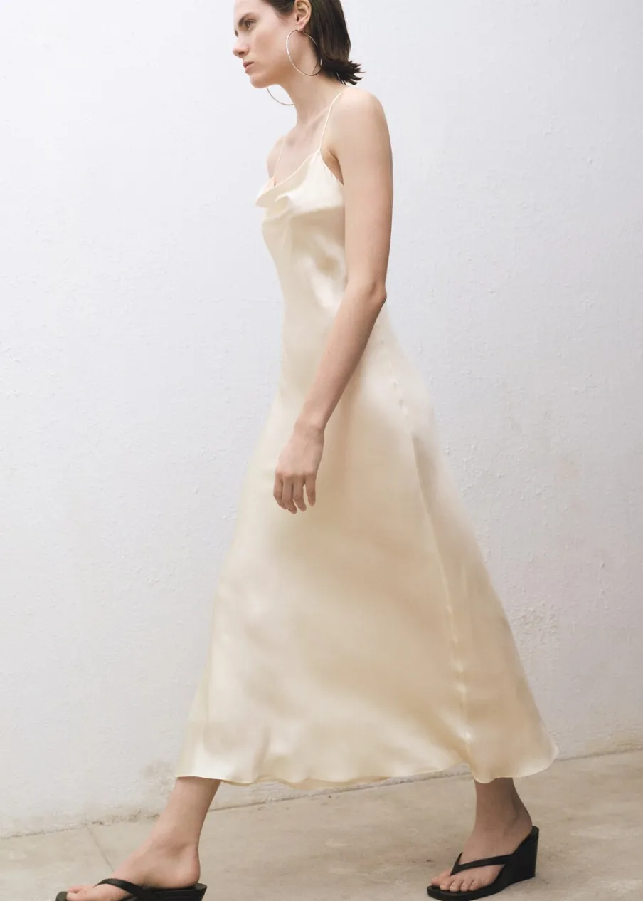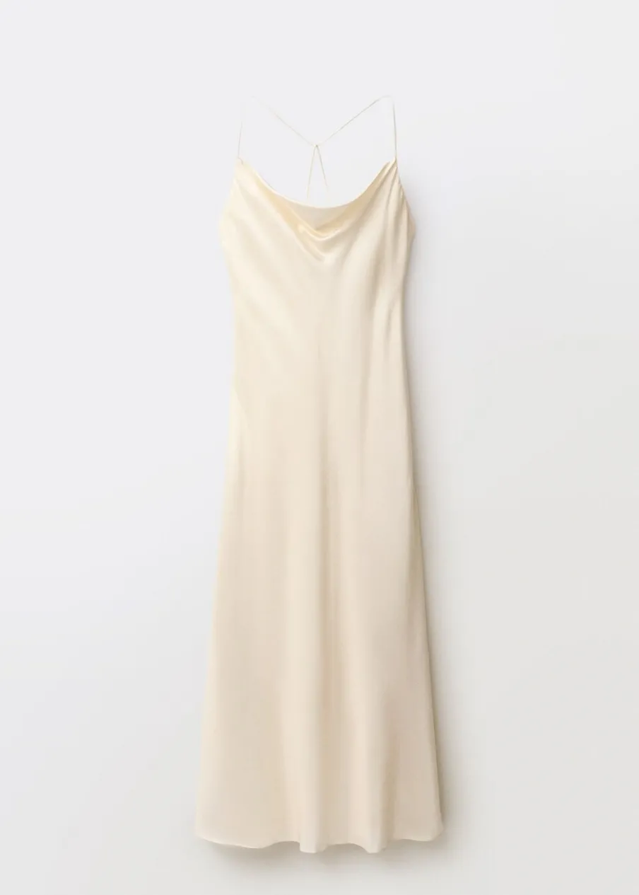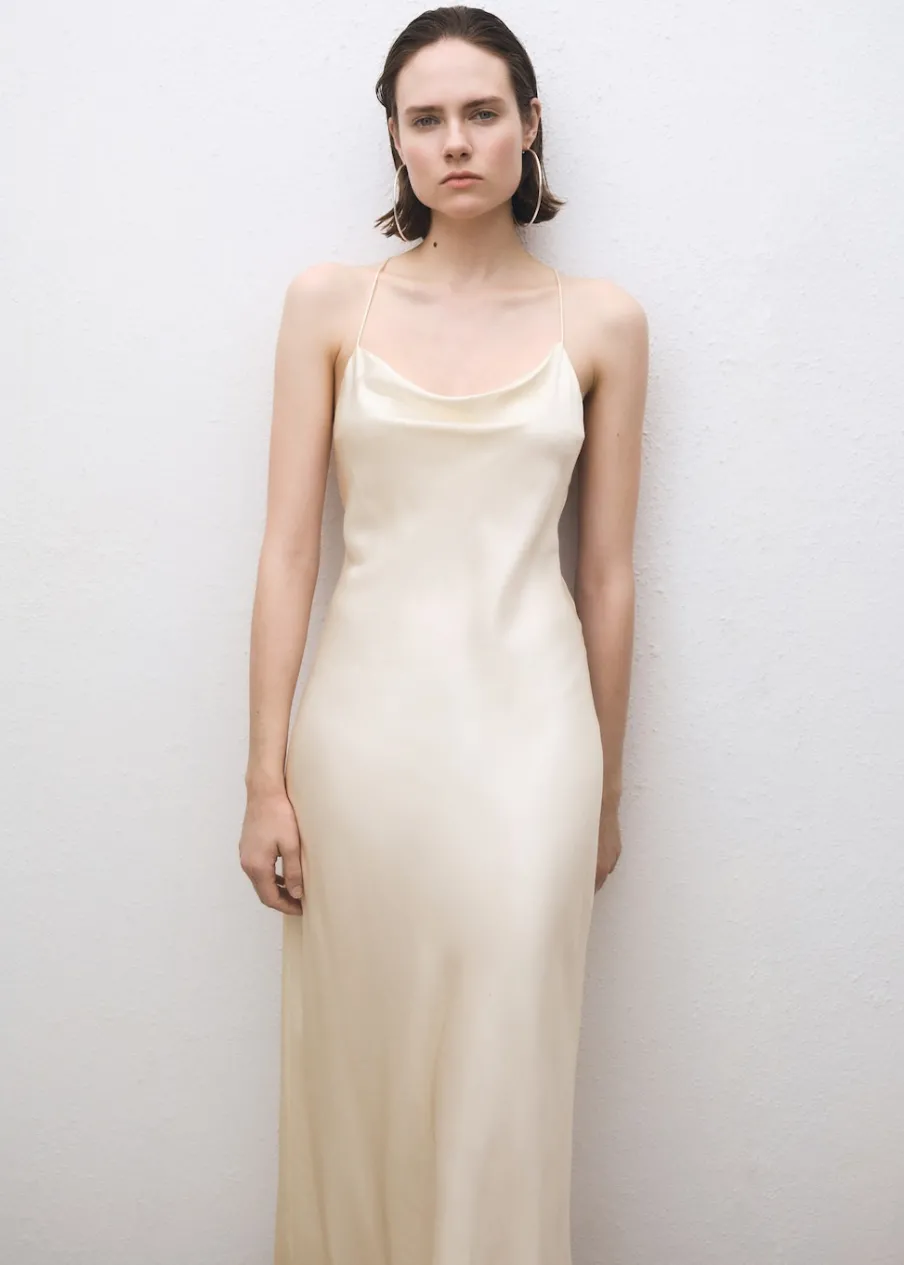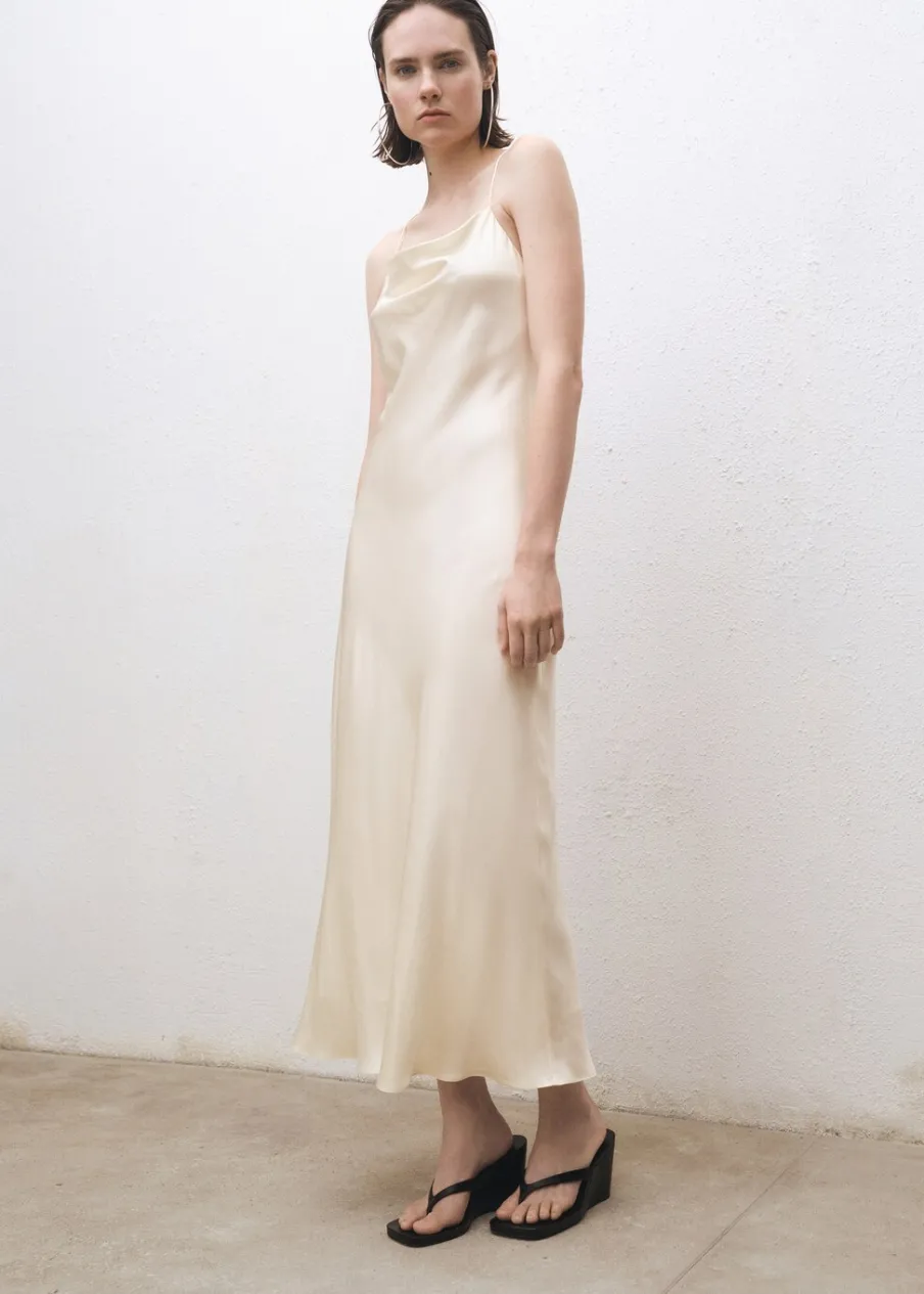 Tkanina mieszana z jedwabiem morwowym. Model evasé. Model długi. Drapowany dekolt. Bez rękawów. Cienkie ramiączka. Zapięcie na zamek z boku. Wewnętrzna podszewka. Kolekcja Selection.
