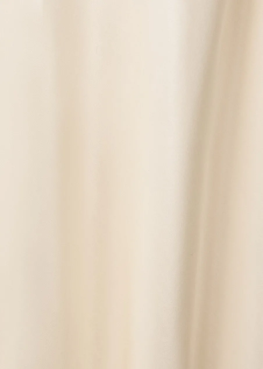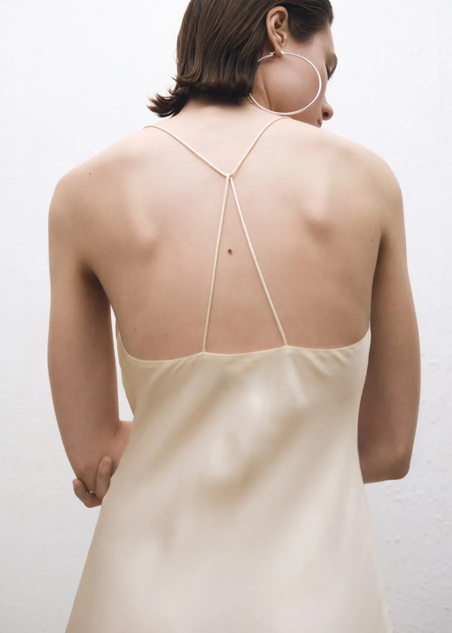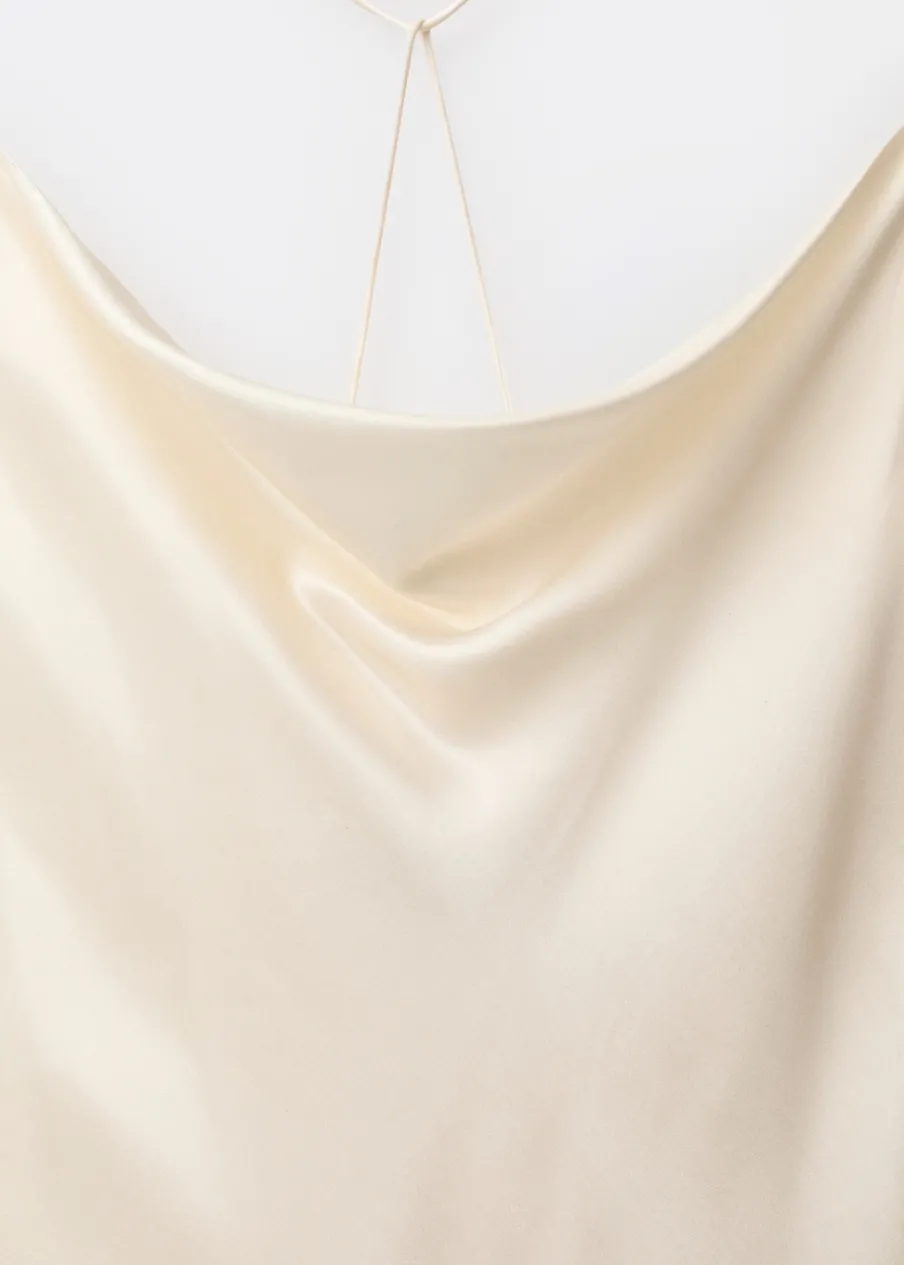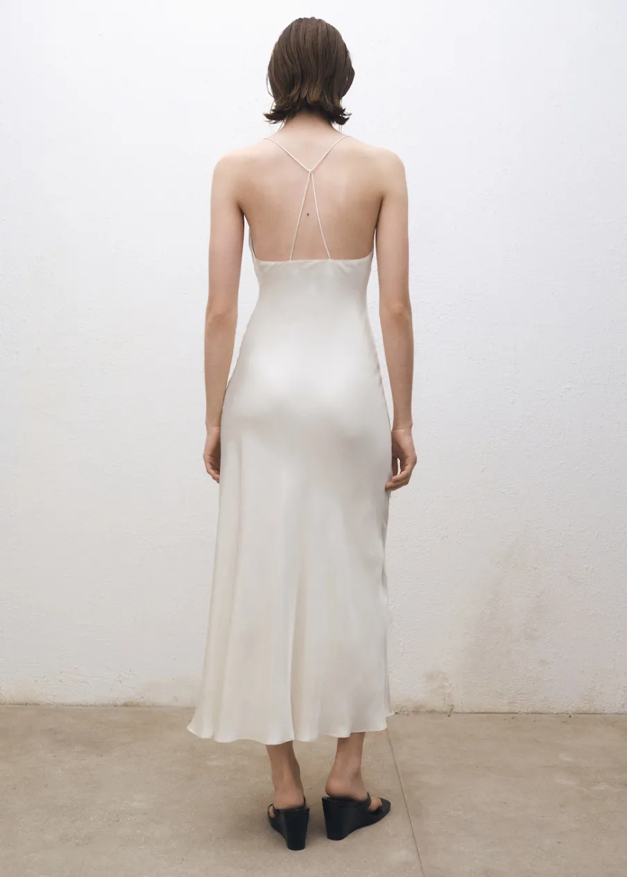 Tkanina mieszana z jedwabiem morwowym. Model evasé. Model długi. Drapowany dekolt. Bez rękawów. Cienkie ramiączka. Zapięcie na zamek z boku. Wewnętrzna podszewka. Kolekcja Selection.