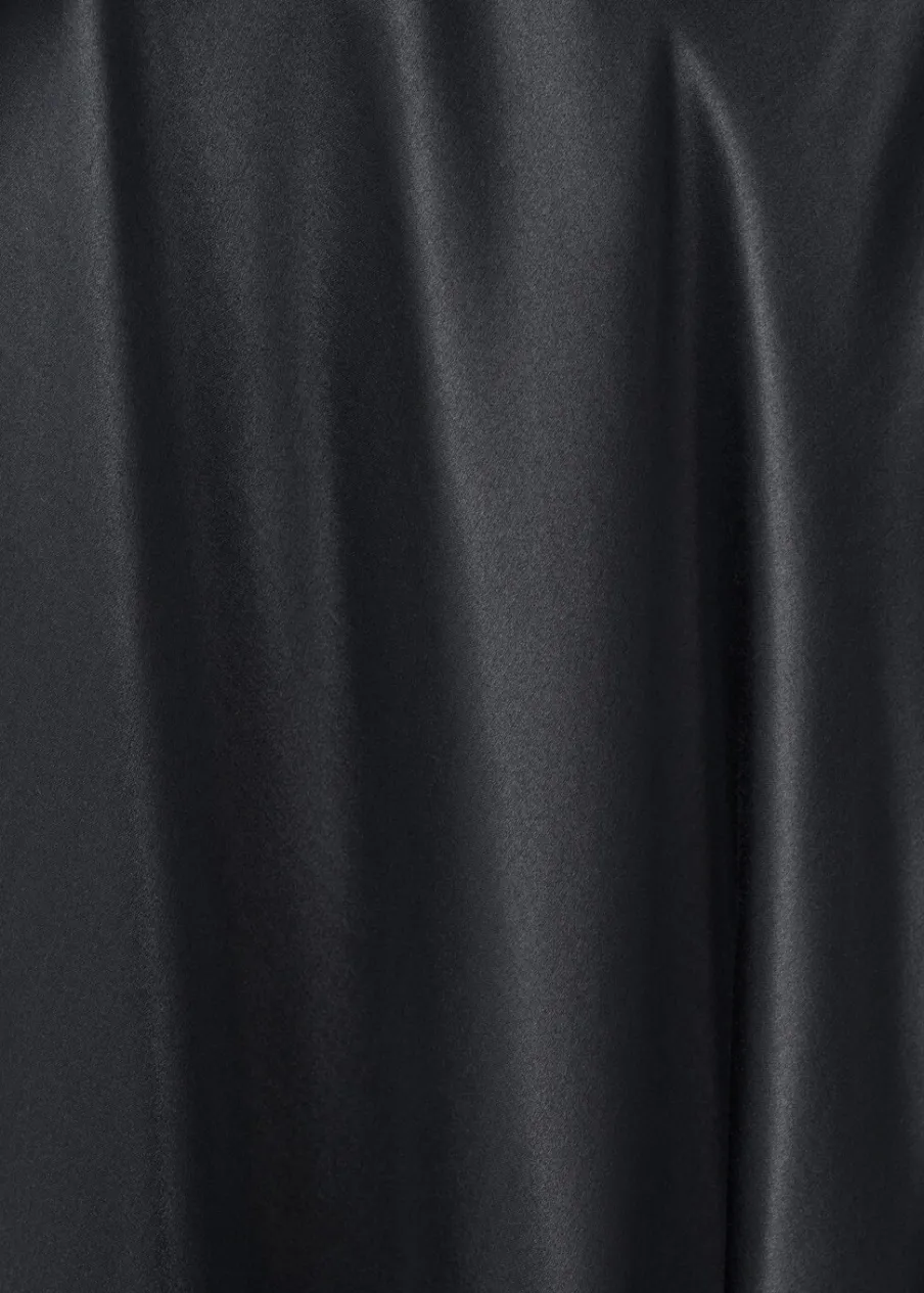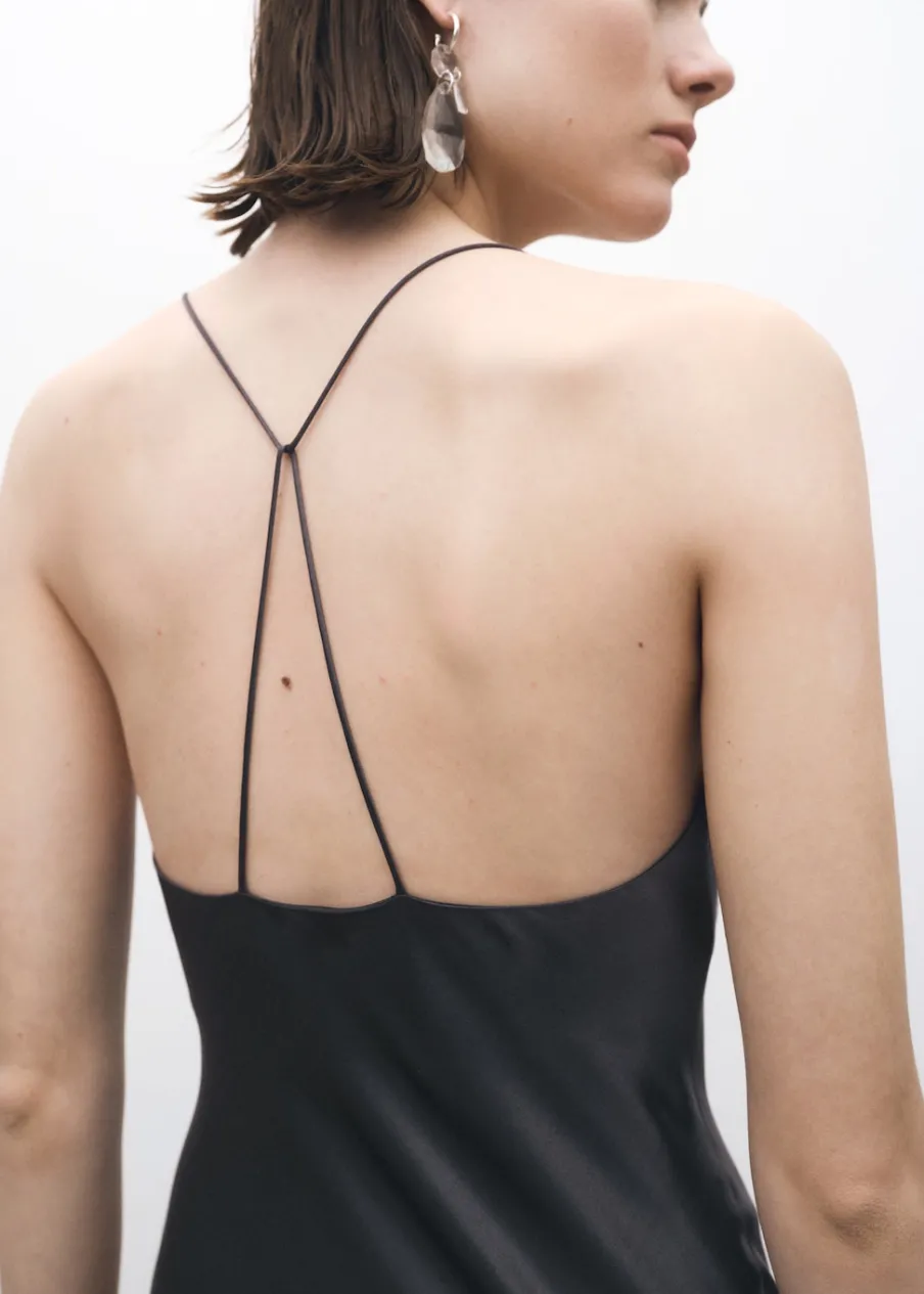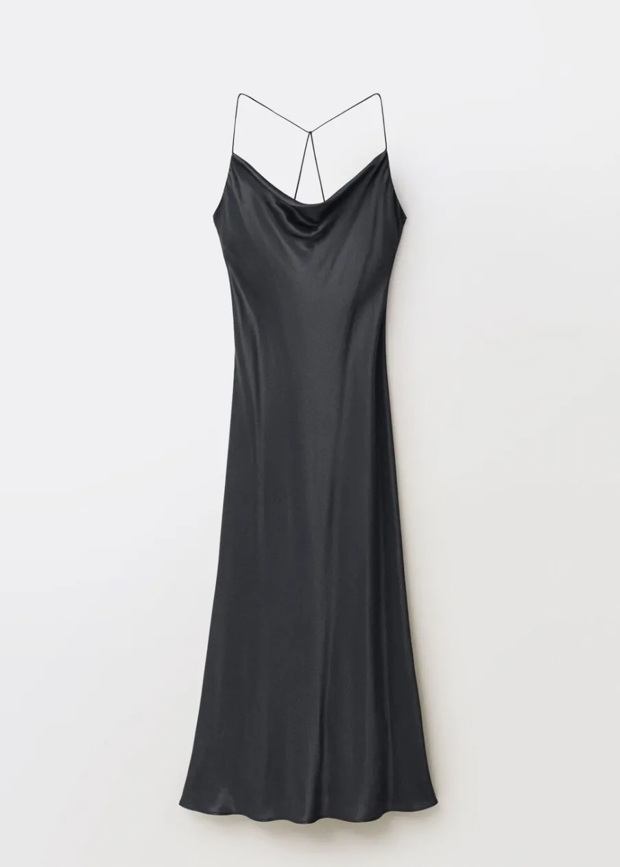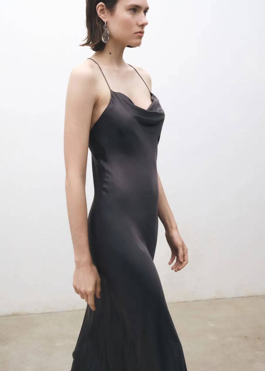 Tkanina mieszana z jedwabiem morwowym. Satynowa tkanina. Model długi. Model evasé. Drapowany dekolt. Bez rękawów. Cienkie ramiączka. Zapięcie na zamek z boku. Kolekcja Selection.