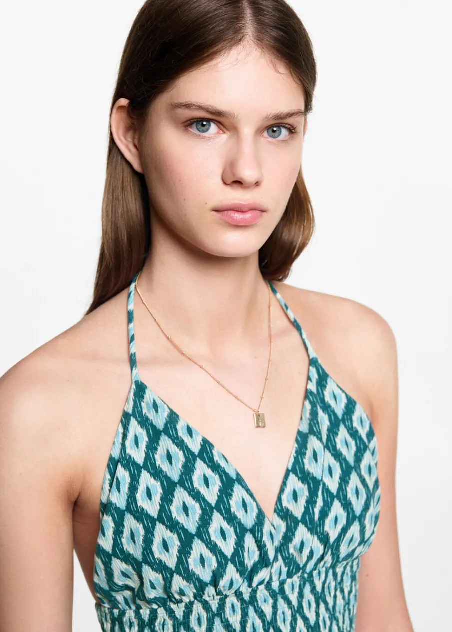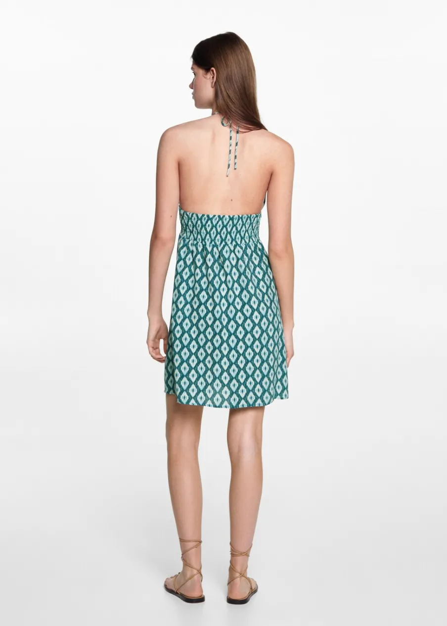 Model prosty. Krótki krój. Marszczony detal. Dekolt V. Wiązane zapięcie. Plecy z wycięciem. Nadruk. Tkanina z wiskozy.