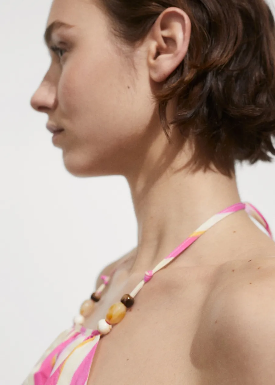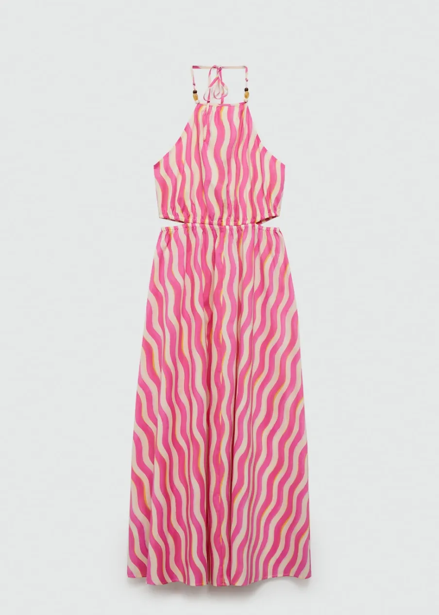 Model evasé. Krój do kolan. Wycięcie. Dekolt w stylu halter. Bez rękawów. Wiązanie na szyi. Elastyczna gumka. Detal z koralikami. Rozcięcia po bokach. Nadruk. Tkanina z 100% bawełny.