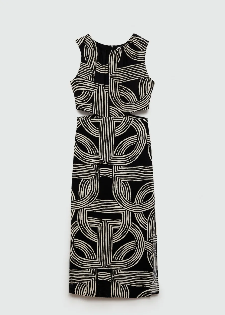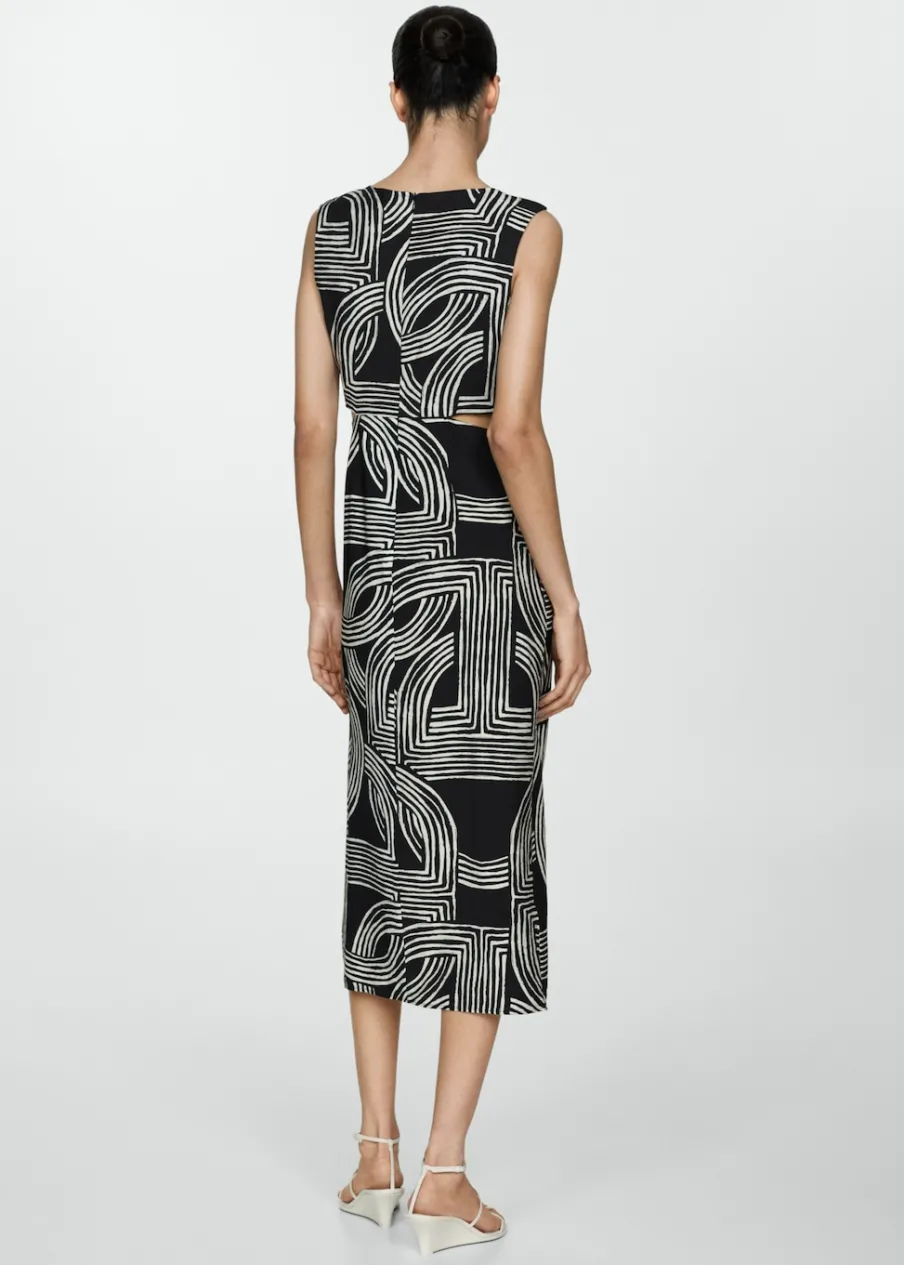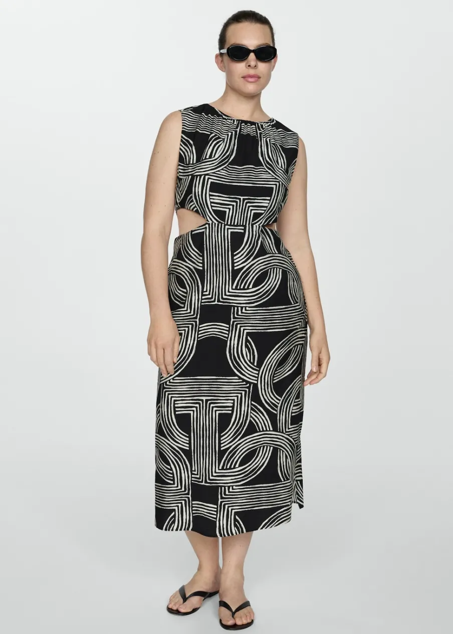 Lejąca tkanina. Model evasé. Krój do kolan. Wycięcie. Okrągły dekolt. Bez rękawów. Zapięcie z tyłu na kryty suwak. Rozcięcia po bokach. Dostępne w Plus Size. Nadruk.