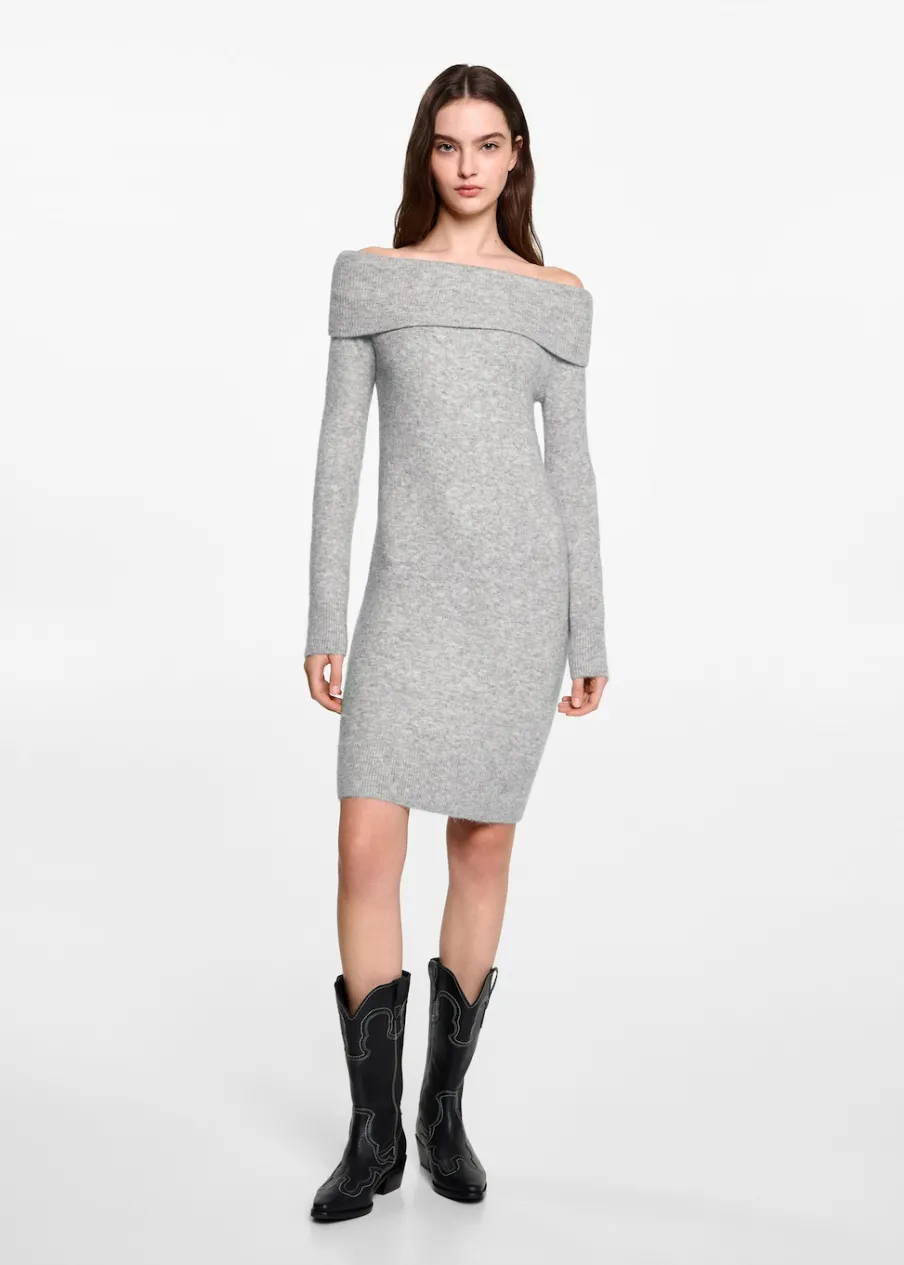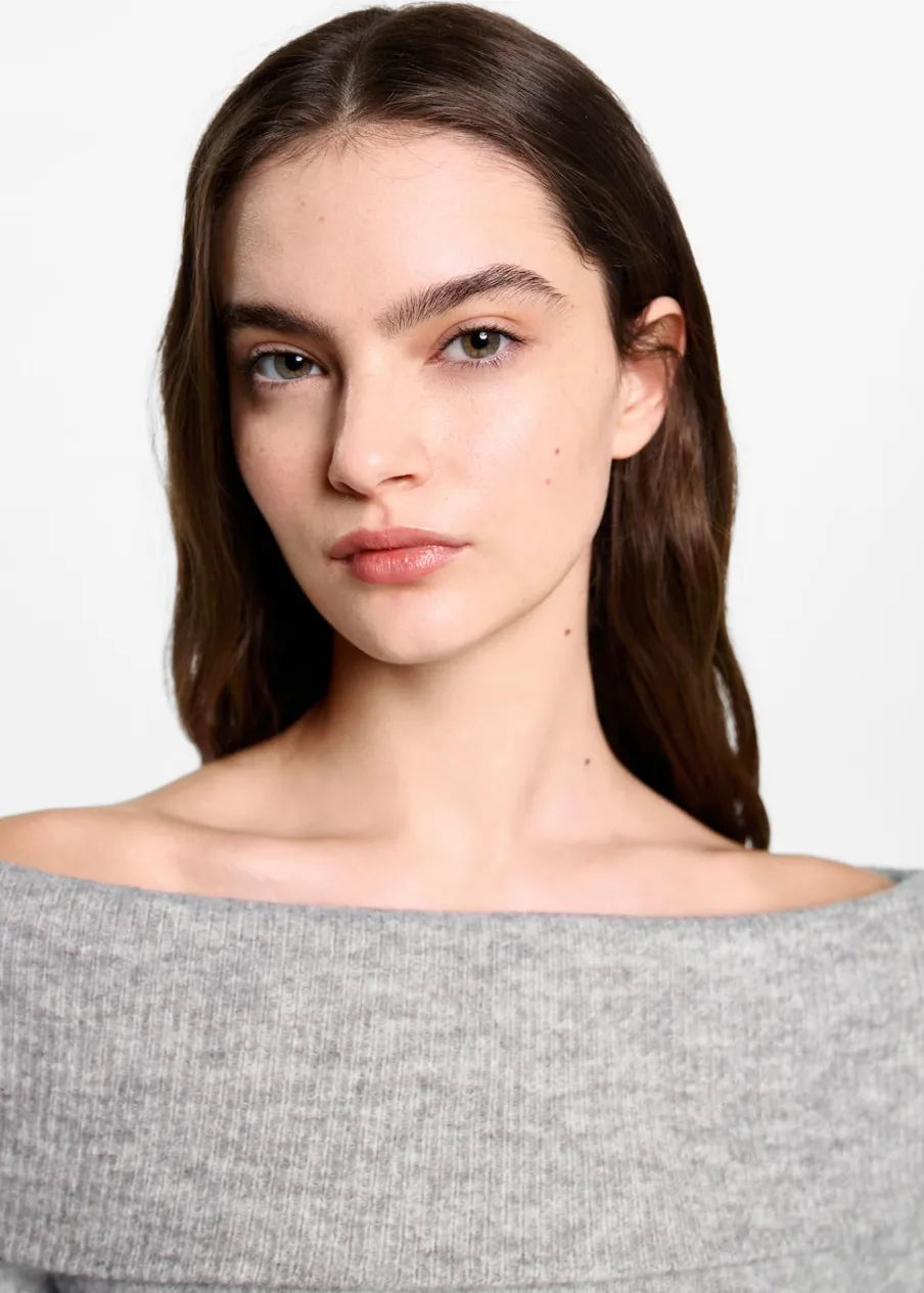 Dzianinowa tkanina. Model prosty. Dekolt w kształcie łódki. Odkryte ramiona. Długi rękaw. Bez zapięcia. Modelka ma 172 cm wzrostu i nosi rozmiar M.