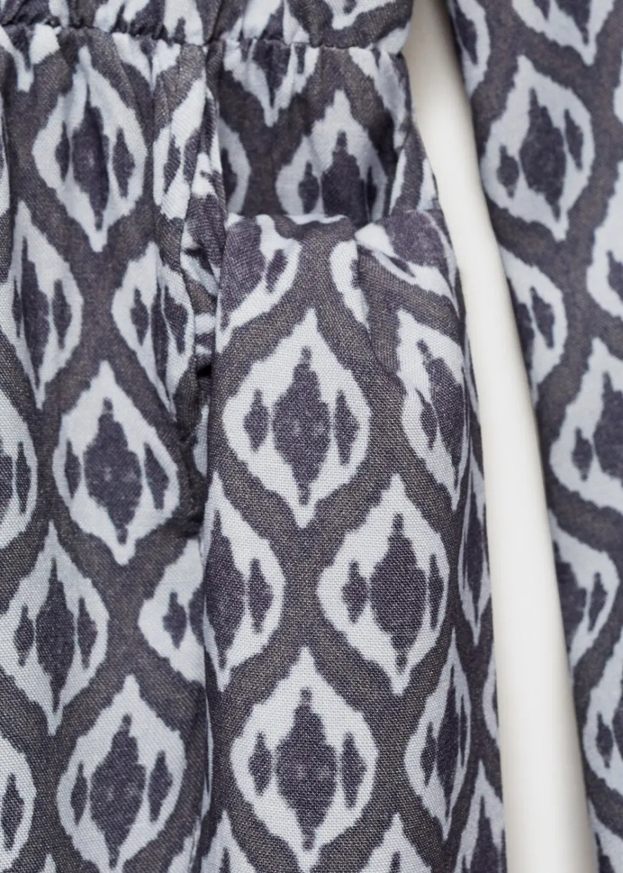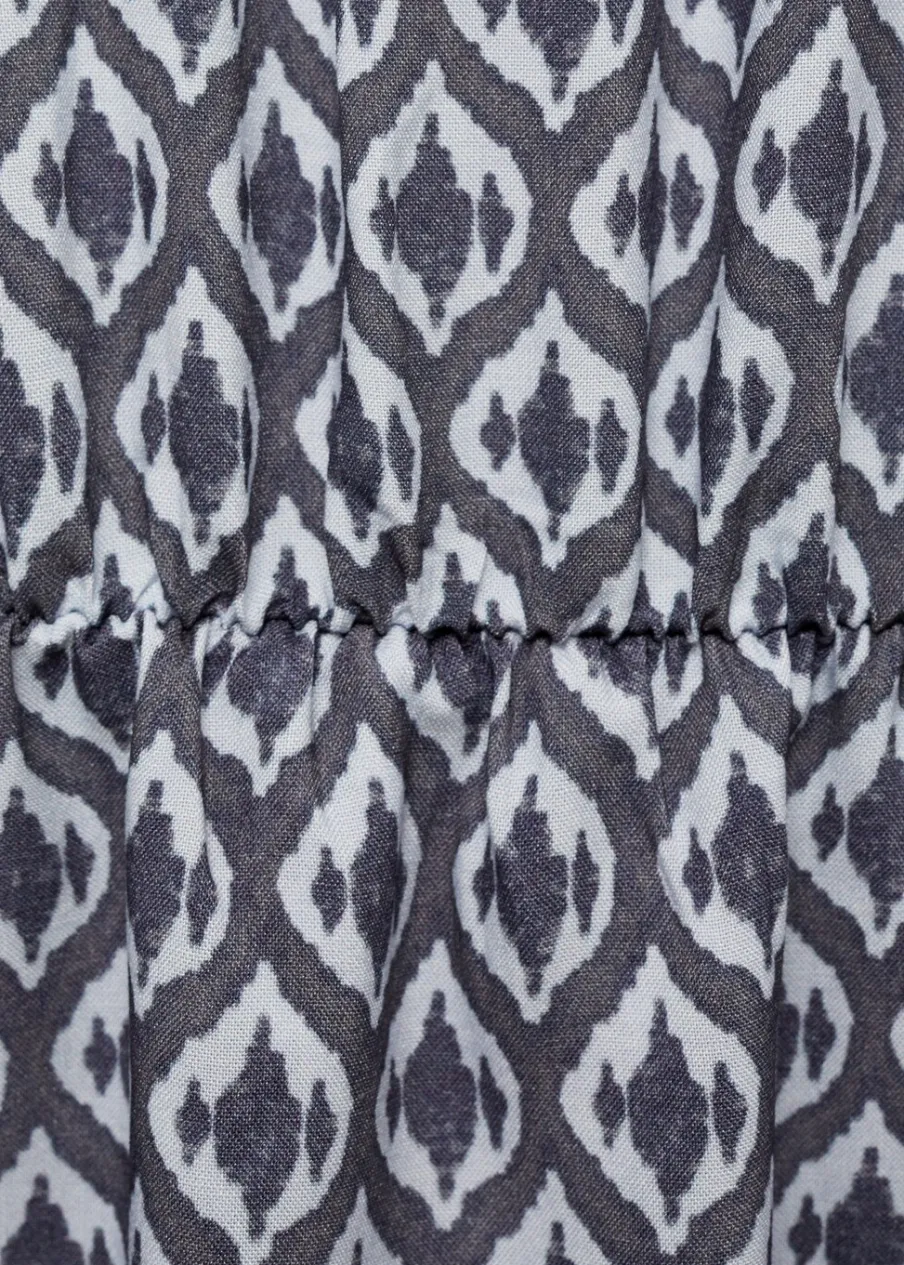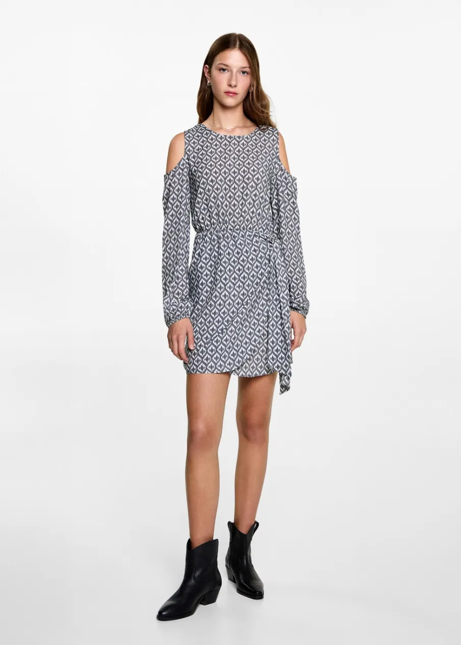 Model prosty. Rozcięcia na ramionach. Długi bufiasty rękaw. Wiązanie w pasie. Zapięcie na guzik z tyłu. Nadruk. Tkanina z wiskozy.