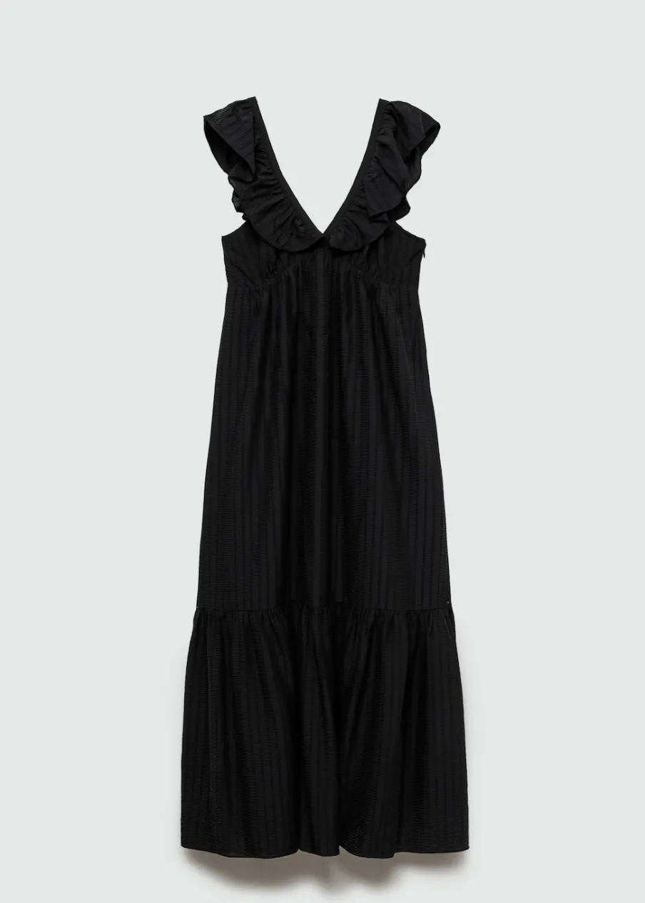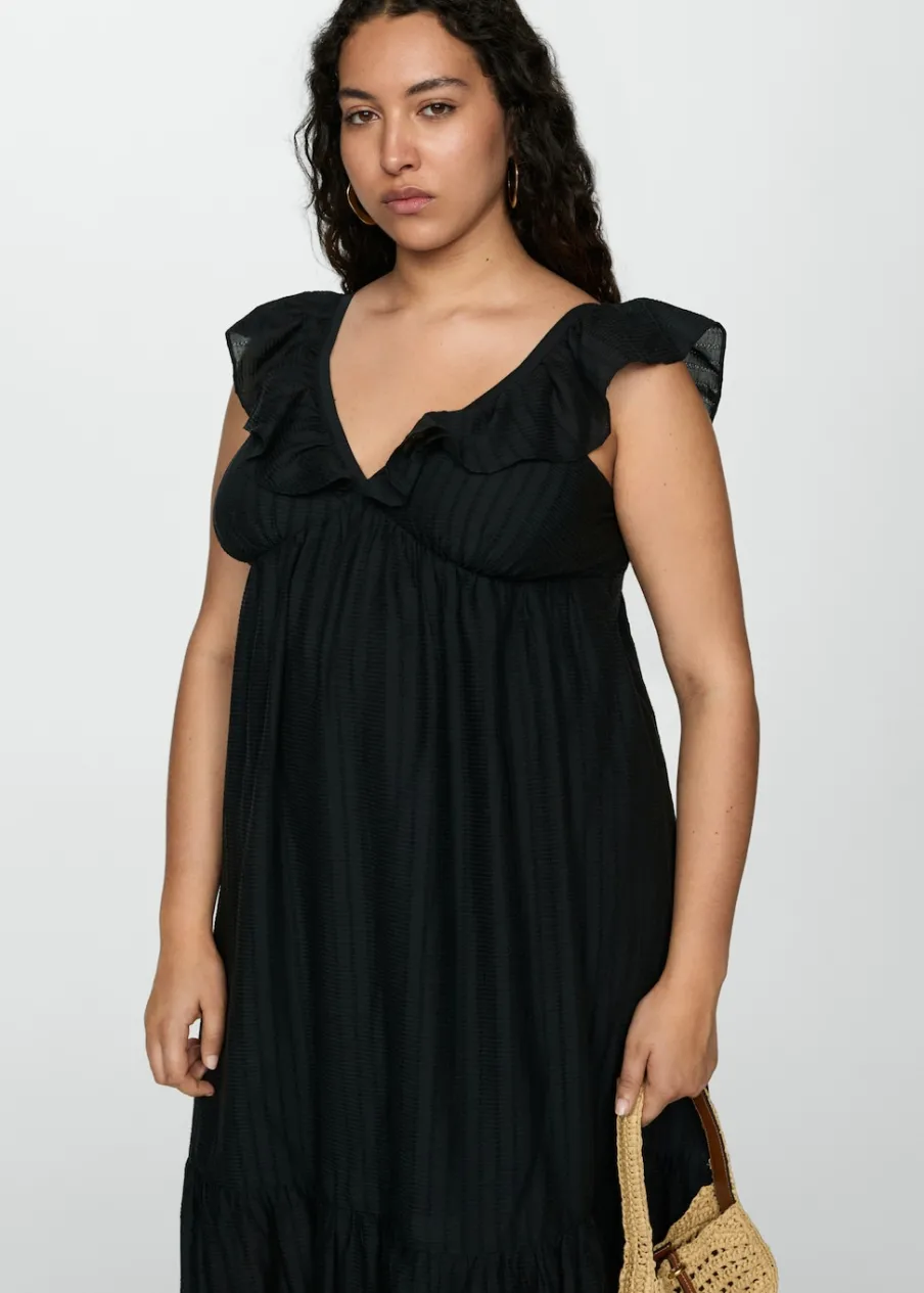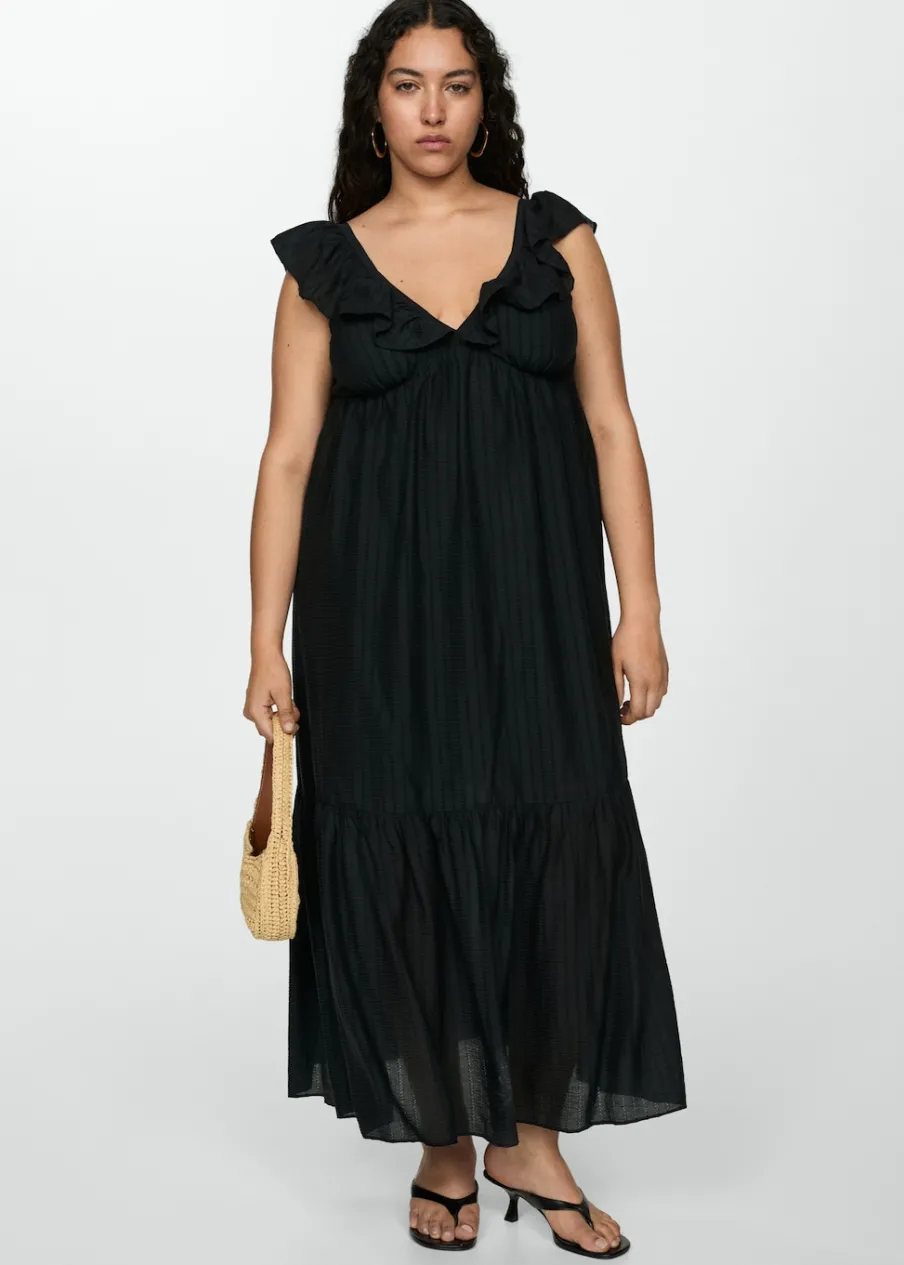 Tkanina mieszana z lyocellem. Teksturowana tkanina. Model evasé. Model w dużym rozmiarze. Model długi. Bez rękawów. Dekolt V. Szerokie ramiączka. Bez zapięcia. Dostępne w Plus Size.