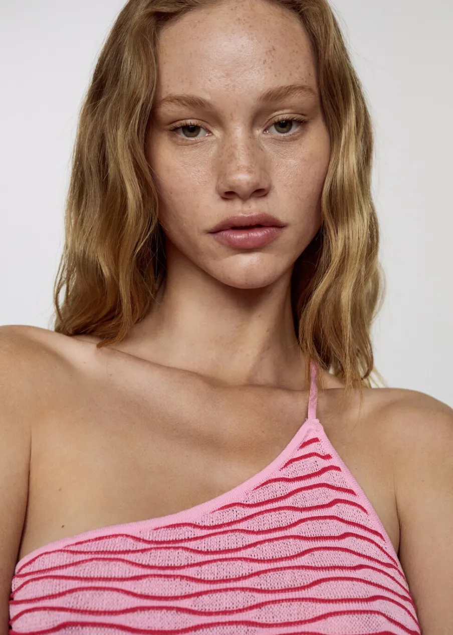 Tkanina z cienkiej dzianiny. Teksturowana tkanina. Asymetryczny krój. Krótki krój. Bez rękawów. Wąskie ramiączko. Bez zapięcia. Model wcięty.