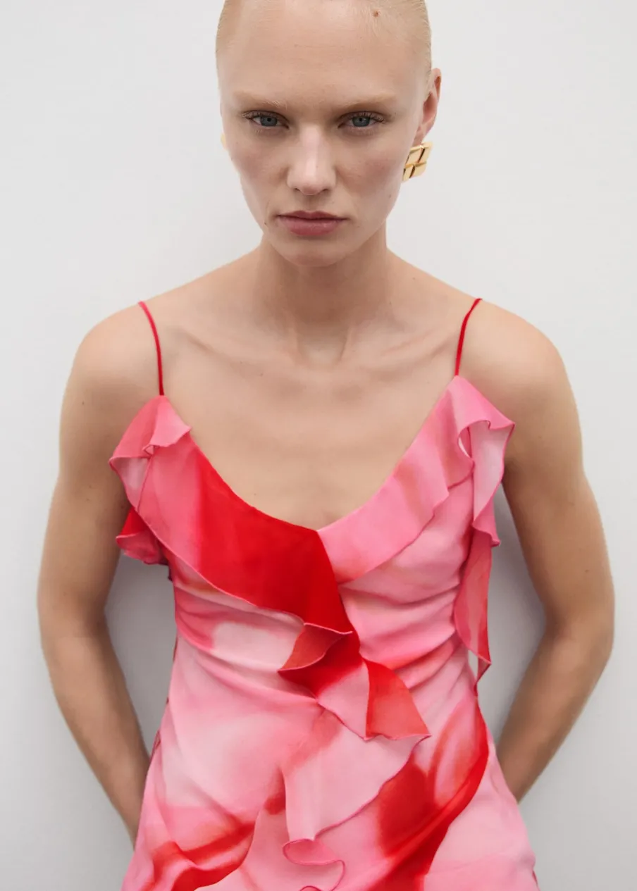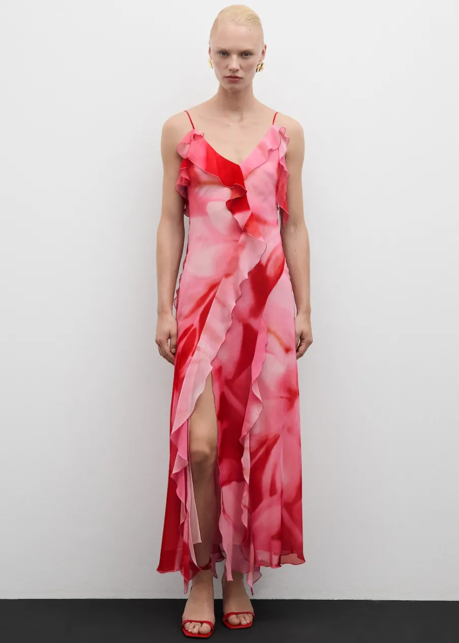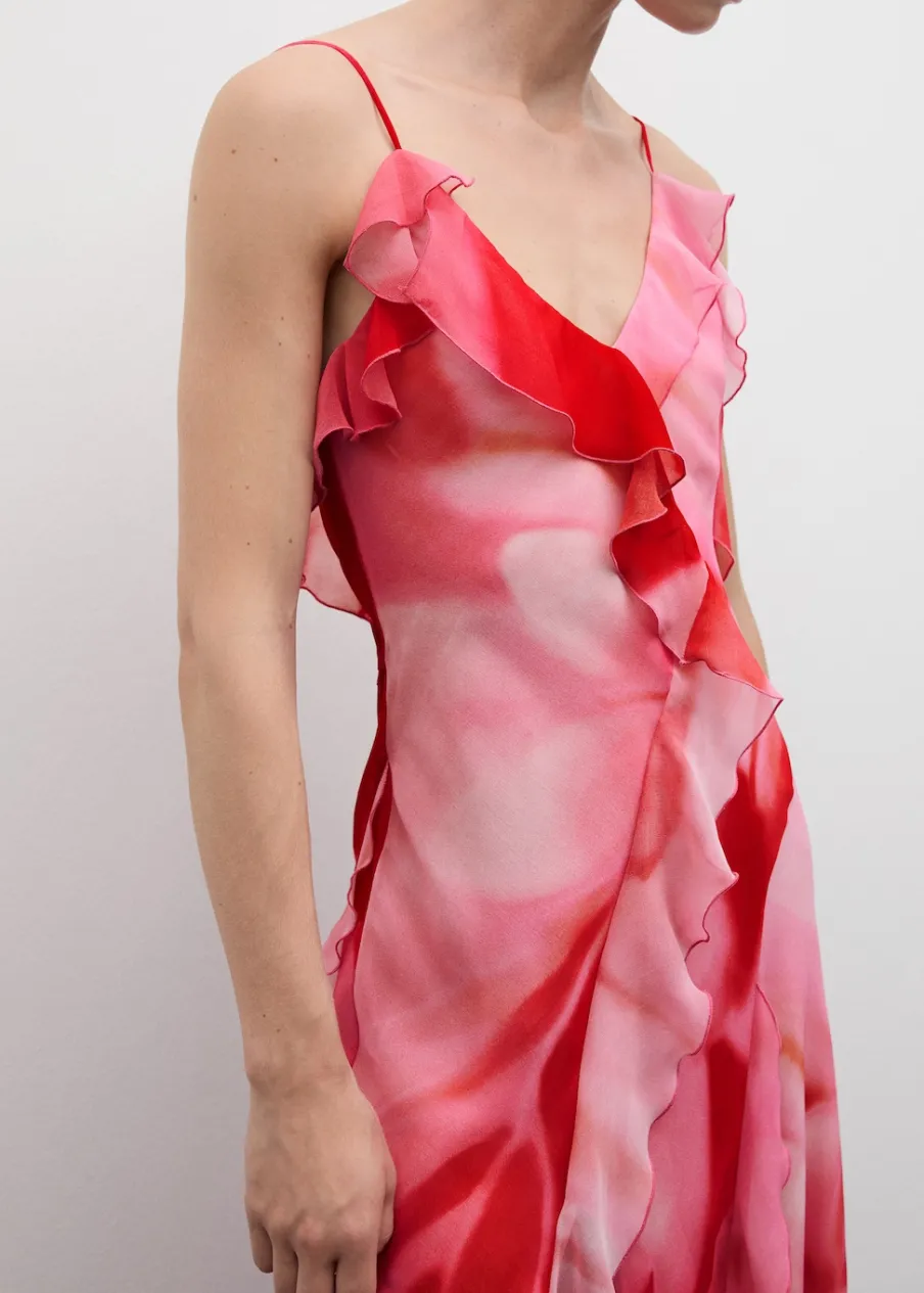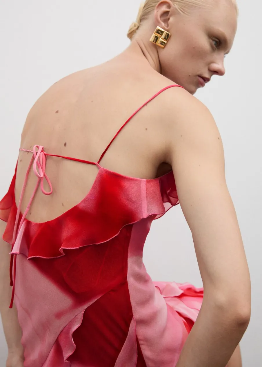 Lejąca tkanina. Model długi. Model z falbankami. Cieniowany deseń. Dekolt. Cienkie ramiączka. Plecy z wycięciem. Wiązanie na plecach. Wewnętrzna podszewka. Kolekcja wizytowa. Model wcięty.