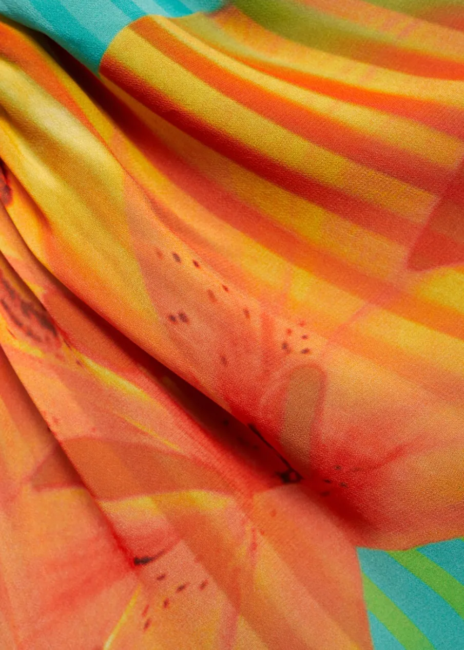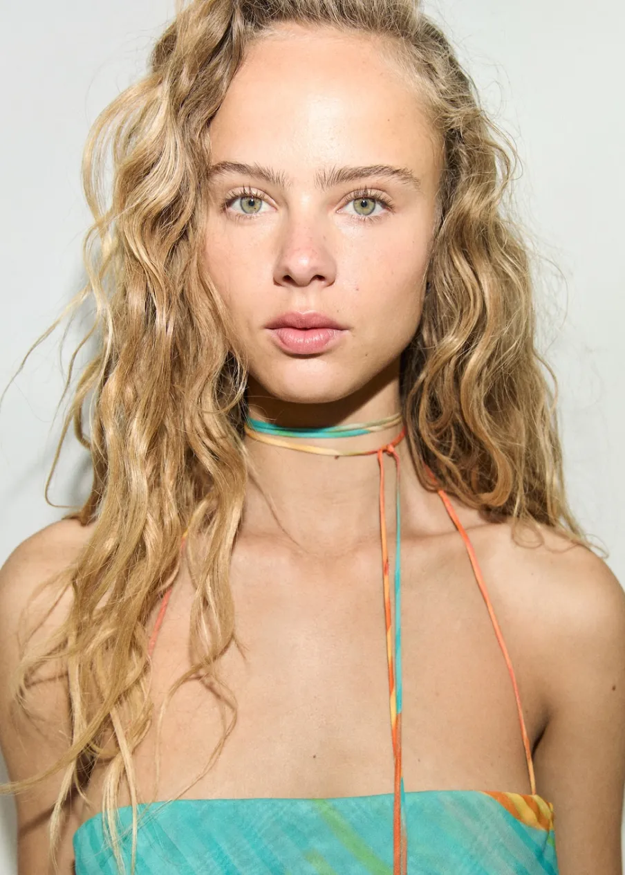 Lejąca tkanina. Krótki krój. Dekolt bez ramiączek. Bez rękawów. Cienkie ramiączka. Wiązanie na szyi. Wewnętrzna podszewka. Wielopozycyjne ramiączka. Tkanina z nadrukiem włoskiego pochodzenia. Wywijany dekolt. Model wcięty.