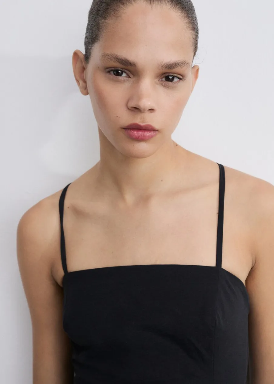 OpisFason z zakładkami. Krótki krój. Model evasé. Dekolt. Cienkie paski skrzyżowane z tyłu. Wiązanie z tyłu. Det…