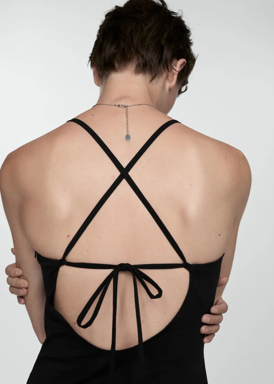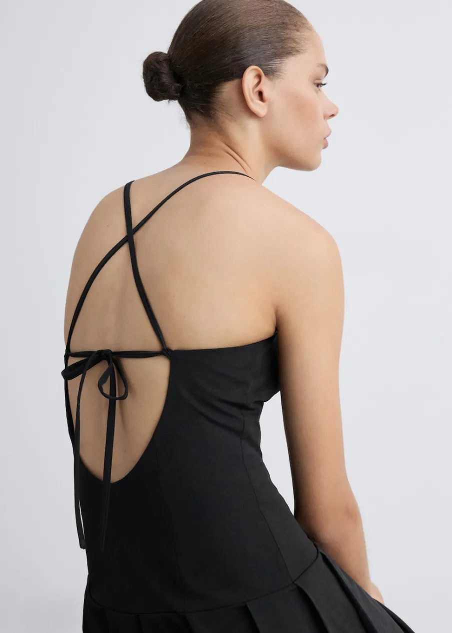 Fason z zakładkami. Krótki krój. Model evasé. Dekolt. Cienkie paski skrzyżowane z tyłu. Wiązanie z tyłu. Detal z zakładkami. Model wcięty.