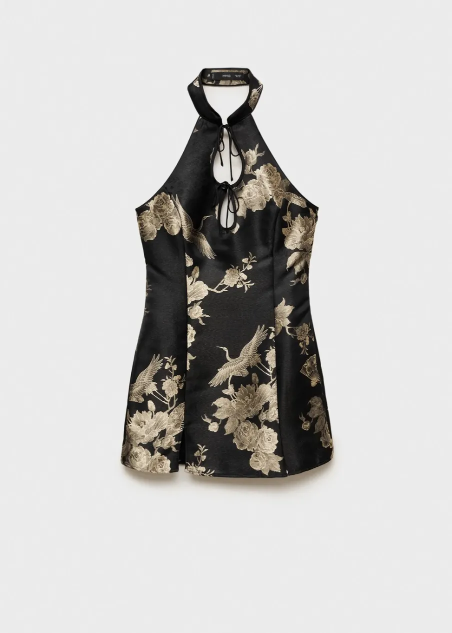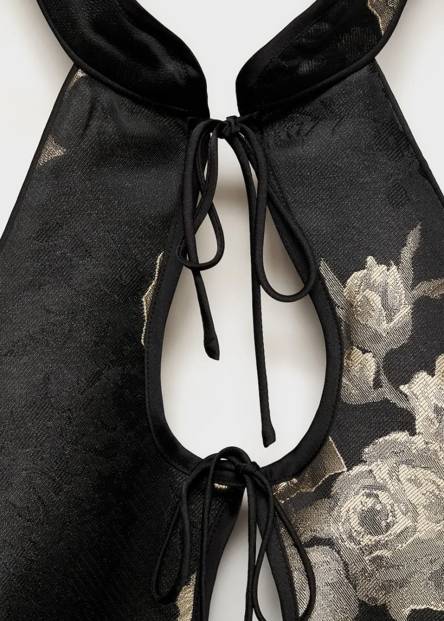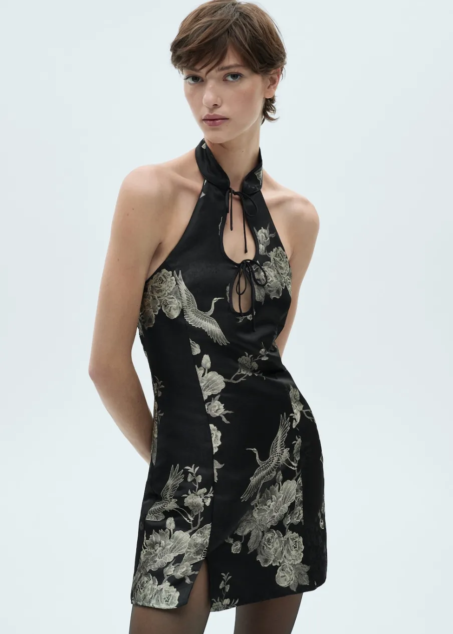 Żakardowa tkanina. Satynowa tkanina. Lejąca tkanina. Model wcięty. Krótki krój. Nadruk. Dekolt w stylu halter. Detal z rozcięciem. Ozdobne kokardki. Bez rękawów. Plecy z wycięciem. Zapięcie na zamek z boku. Kolekcja wizytowa.