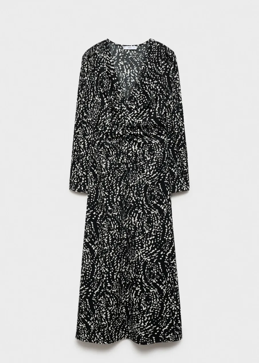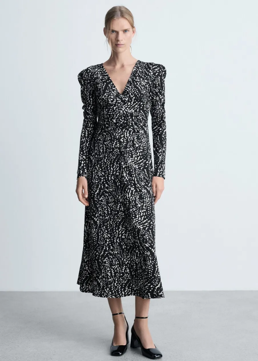 Lejąca tkanina. Model evasé. Krój do kolan. Nadruk. Dekolt V. Długi bufiasty rękaw. Bez zapięcia. Modelka ma 178 cm wzrostu i nosi rozmiar S/36.
