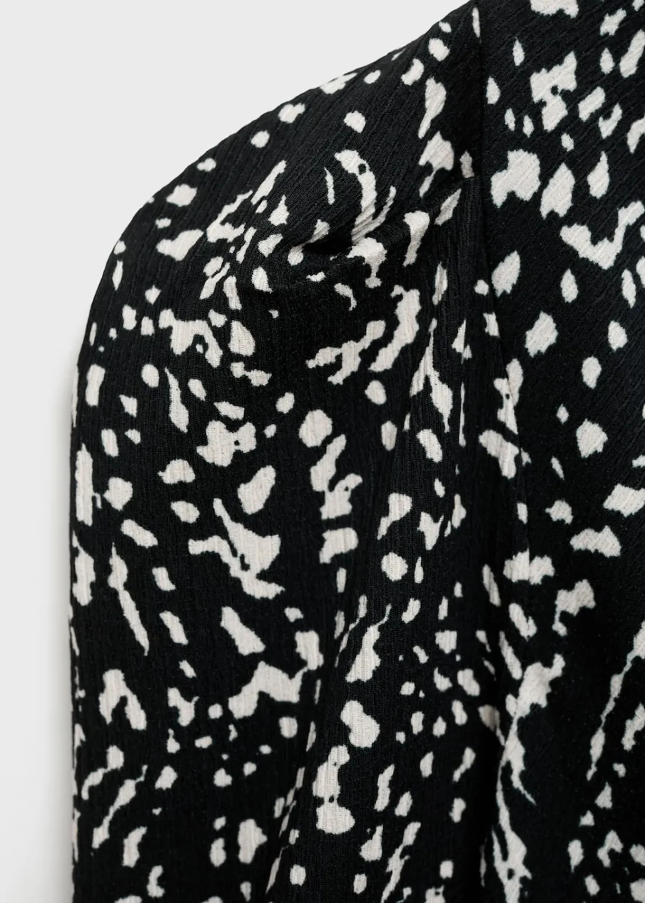 OpisLejąca tkanina. Model evasé. Krój do kolan. Nadruk. Dekolt V. Długi bufiasty rękaw. Bez zapięcia. Modelka ma 1…