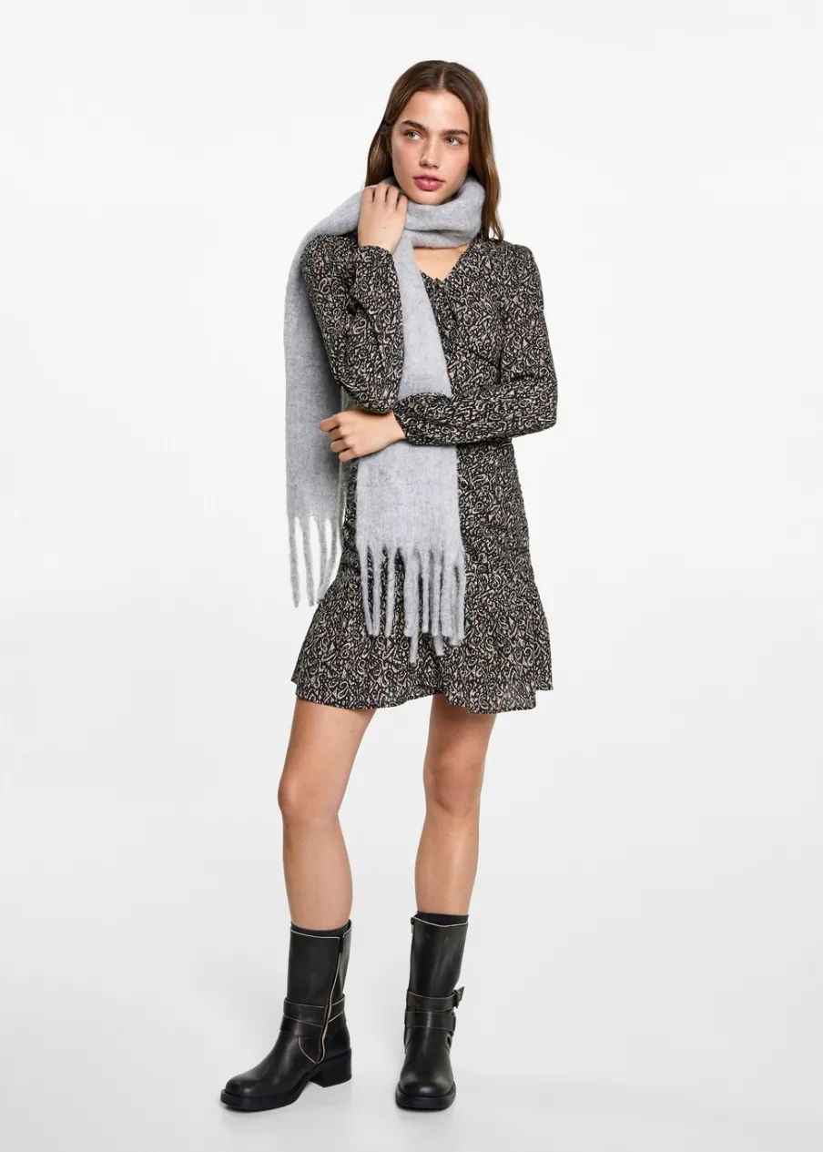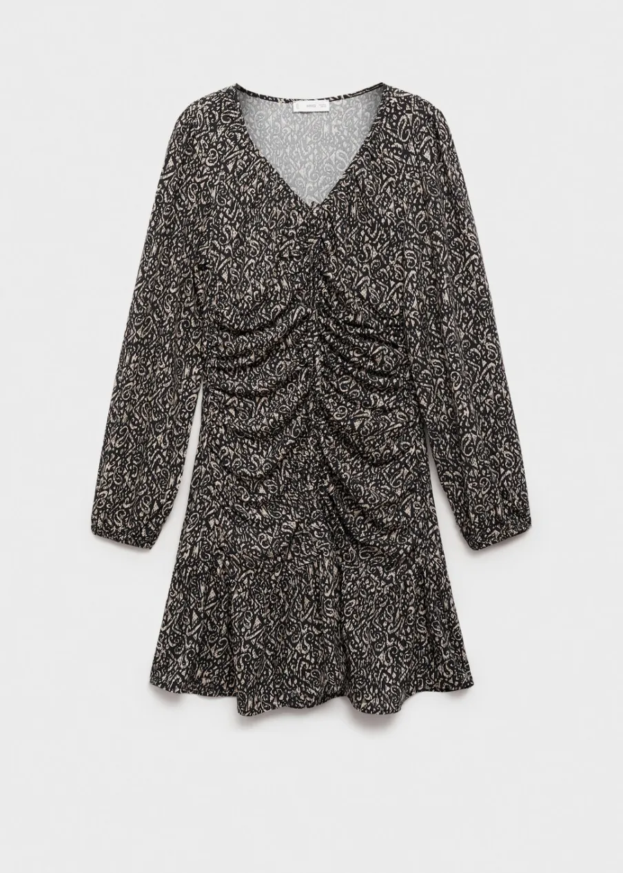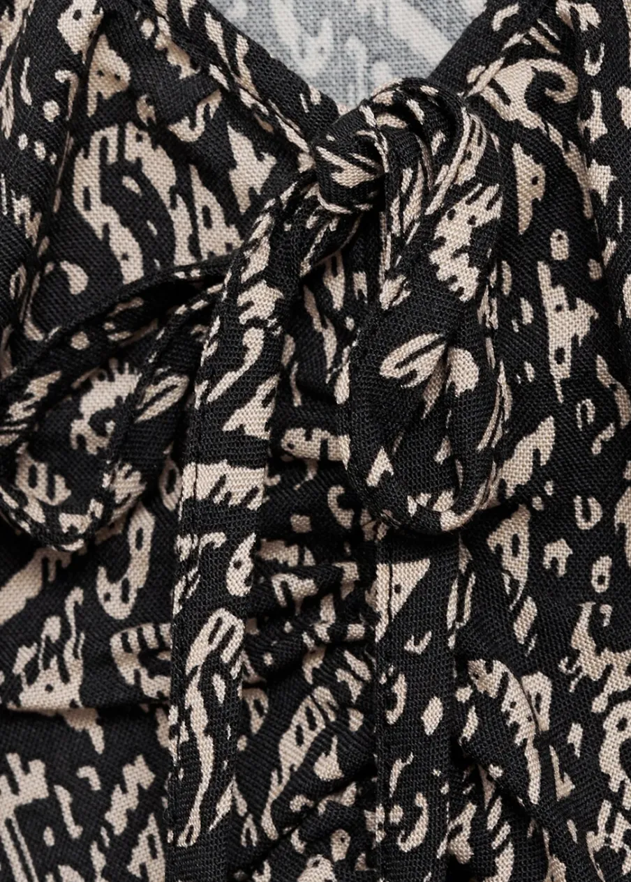 Lejąca tkanina. Nadruk. Krótki krój. Model evasé. Marszczony detal na środku. Modelka ma 172 cm wzrostu i nosi rozmiar M.