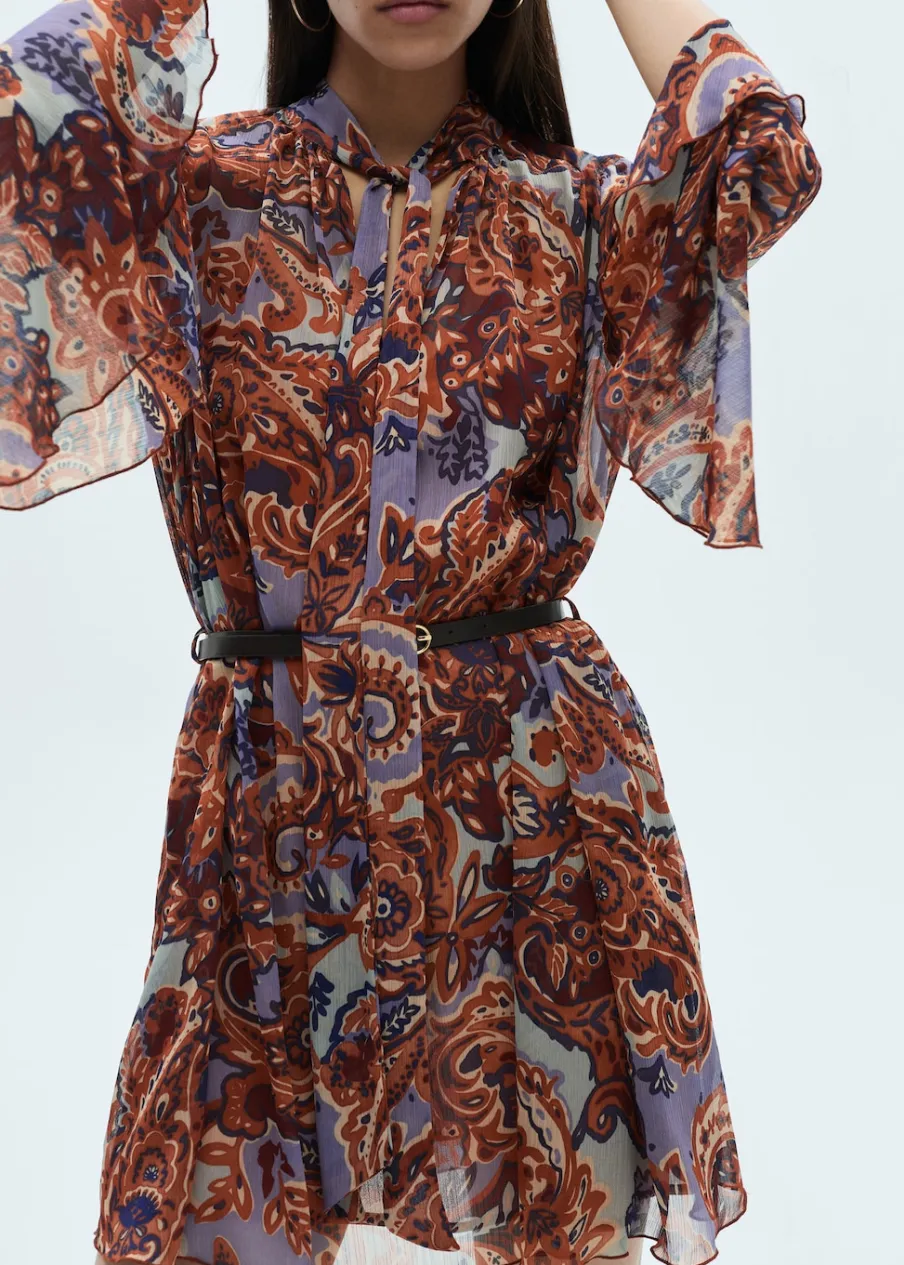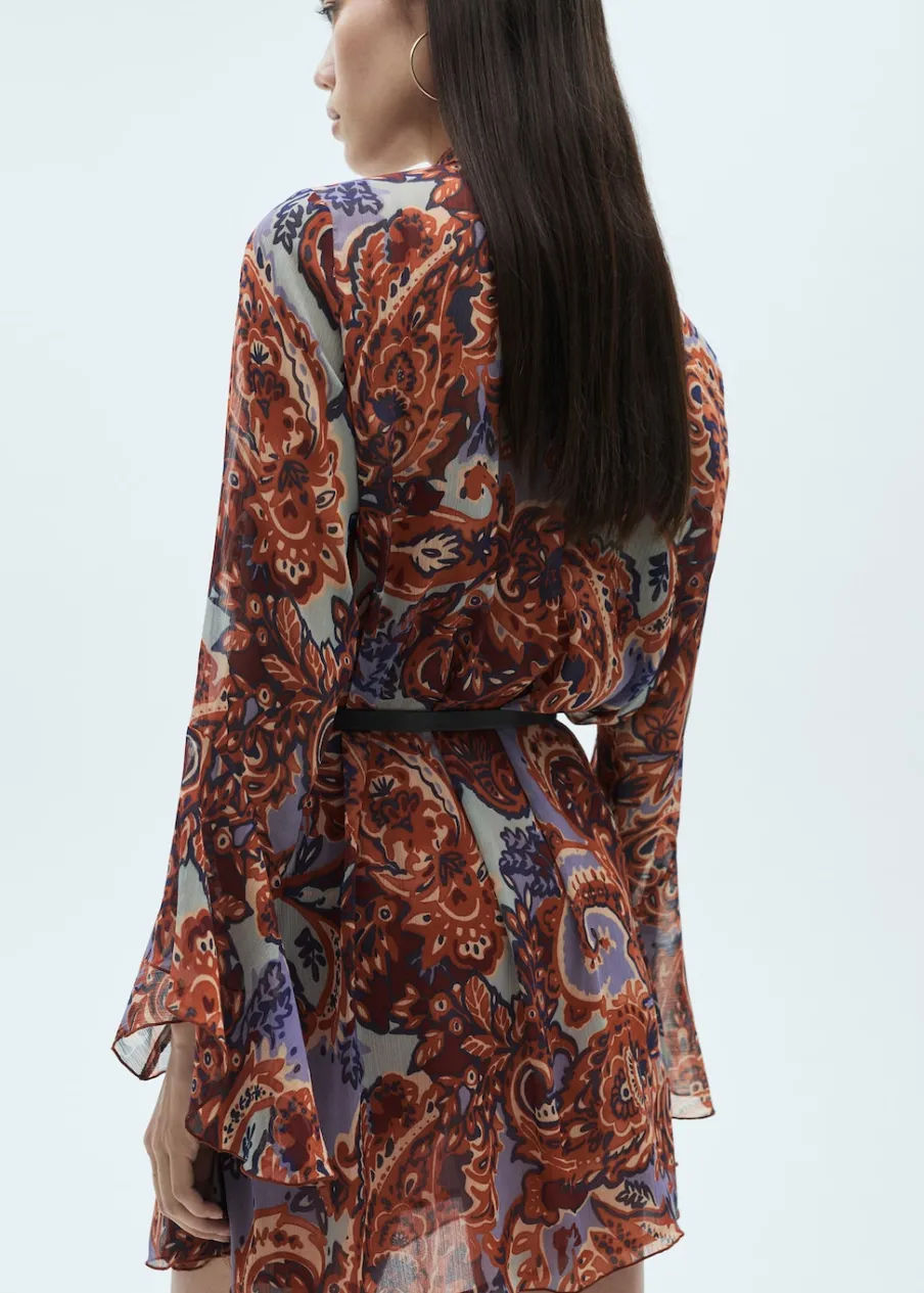 Cienka tkanina. Model evasé. Krótki krój. Okrągły dekolt. Wiązanie przy szyi. Długi rękaw. Falbanki na rękawach. Zapięcie z przodu. Wewnętrzna podszewka. Modelka ma 176 cm wzrostu i nosi rozmiar S/36. Odpinany pasek.