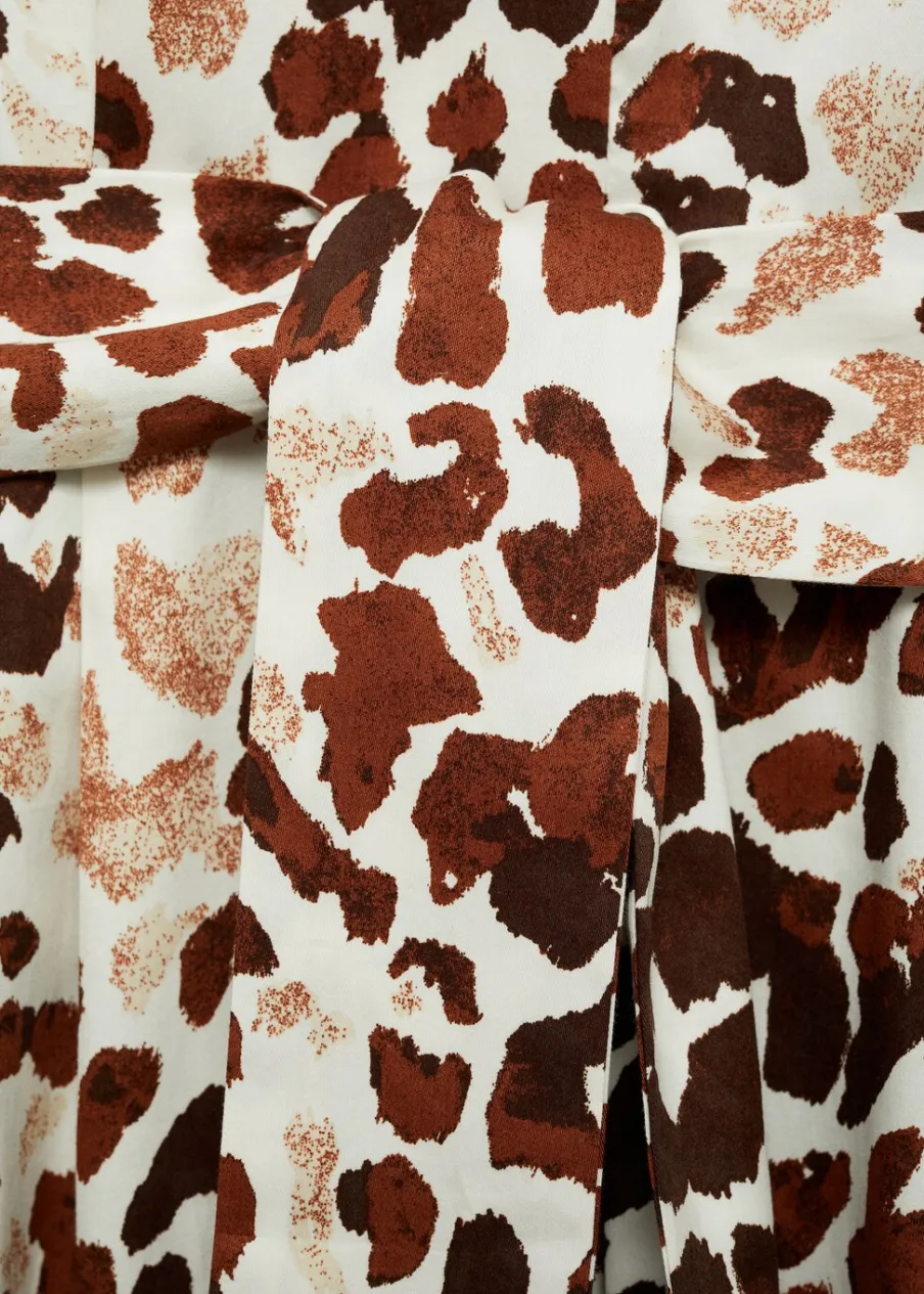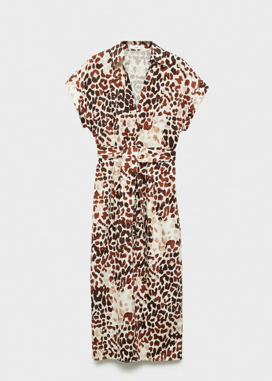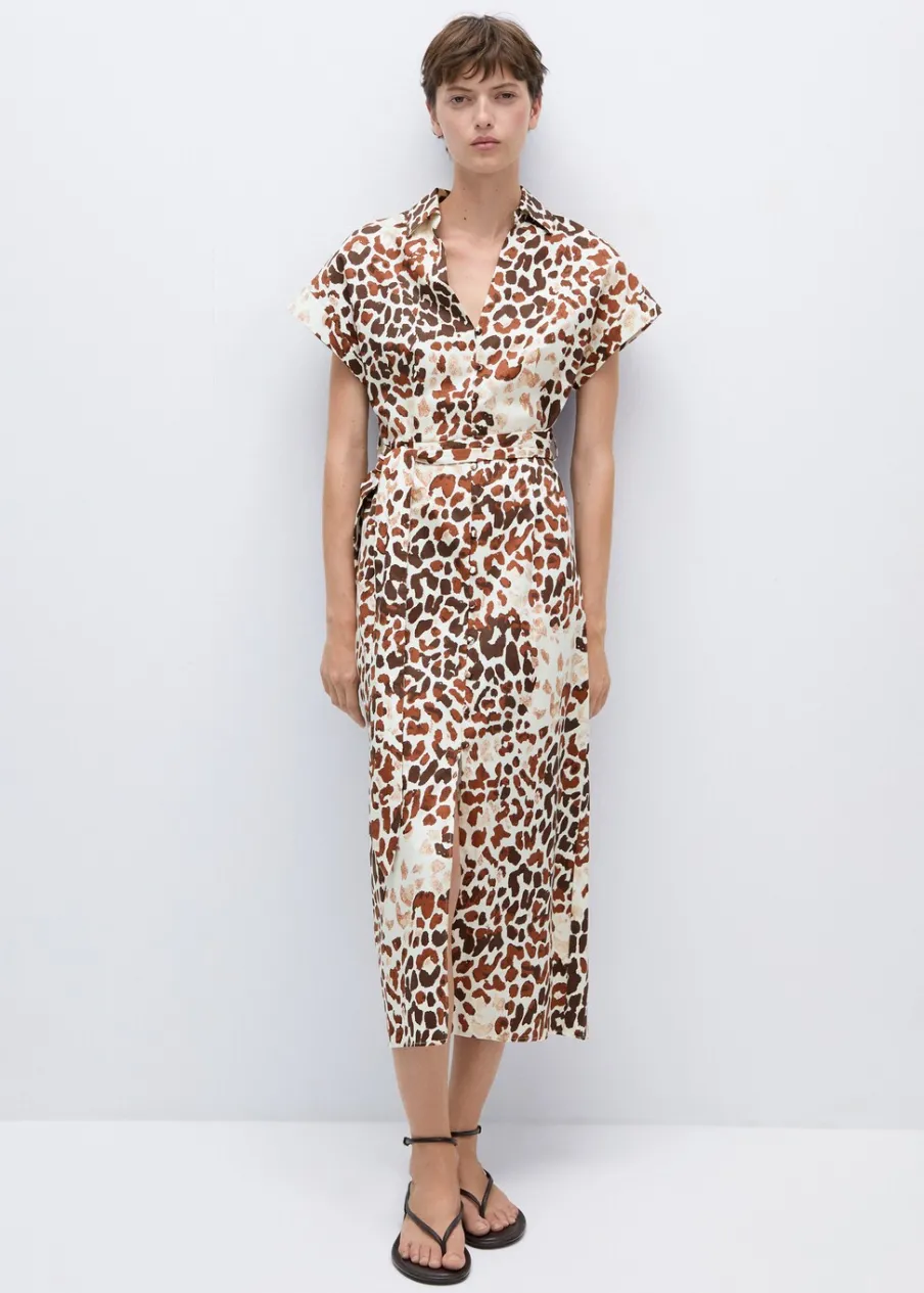 Krój do kolan. Model prosty. Wzór w lamparcie cętki. Zwierzęcy wzór. Koszulowy kołnierz. Krótki rękaw. Szlufki. Regulowane wiązanie. Rozcięcie u dołu. Dostępne w Plus Size. Tkanina z 100% bawełny. Zapięcie na guziki z przodu.