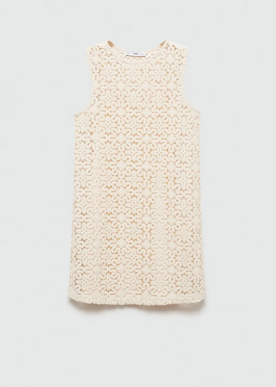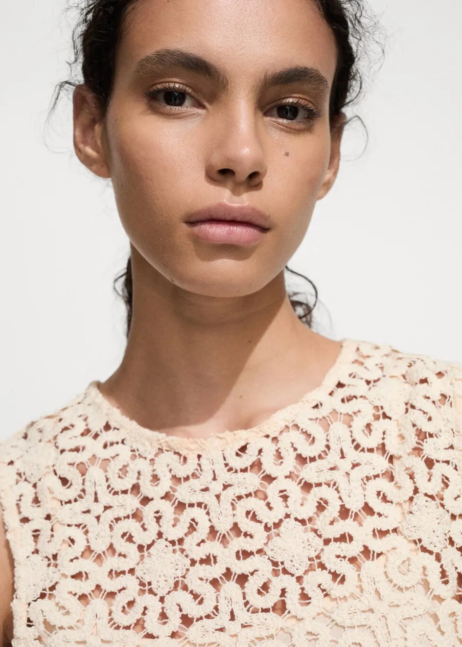 Tkanina mieszanka bawełny. Krótki krój. Model prosty. Deseń w kwiaty. Okrągły dekolt. Bez rękawów. Wewnętrzna podszewka. Bez zapięcia. Szydełkowa tkanina.
