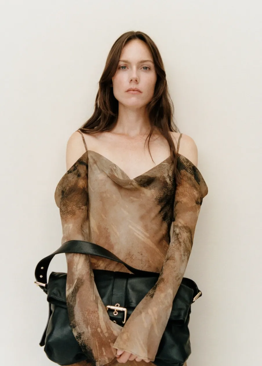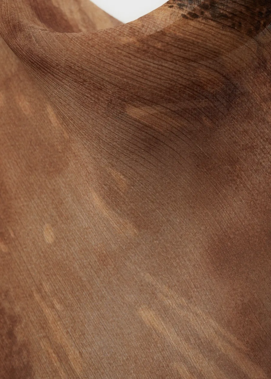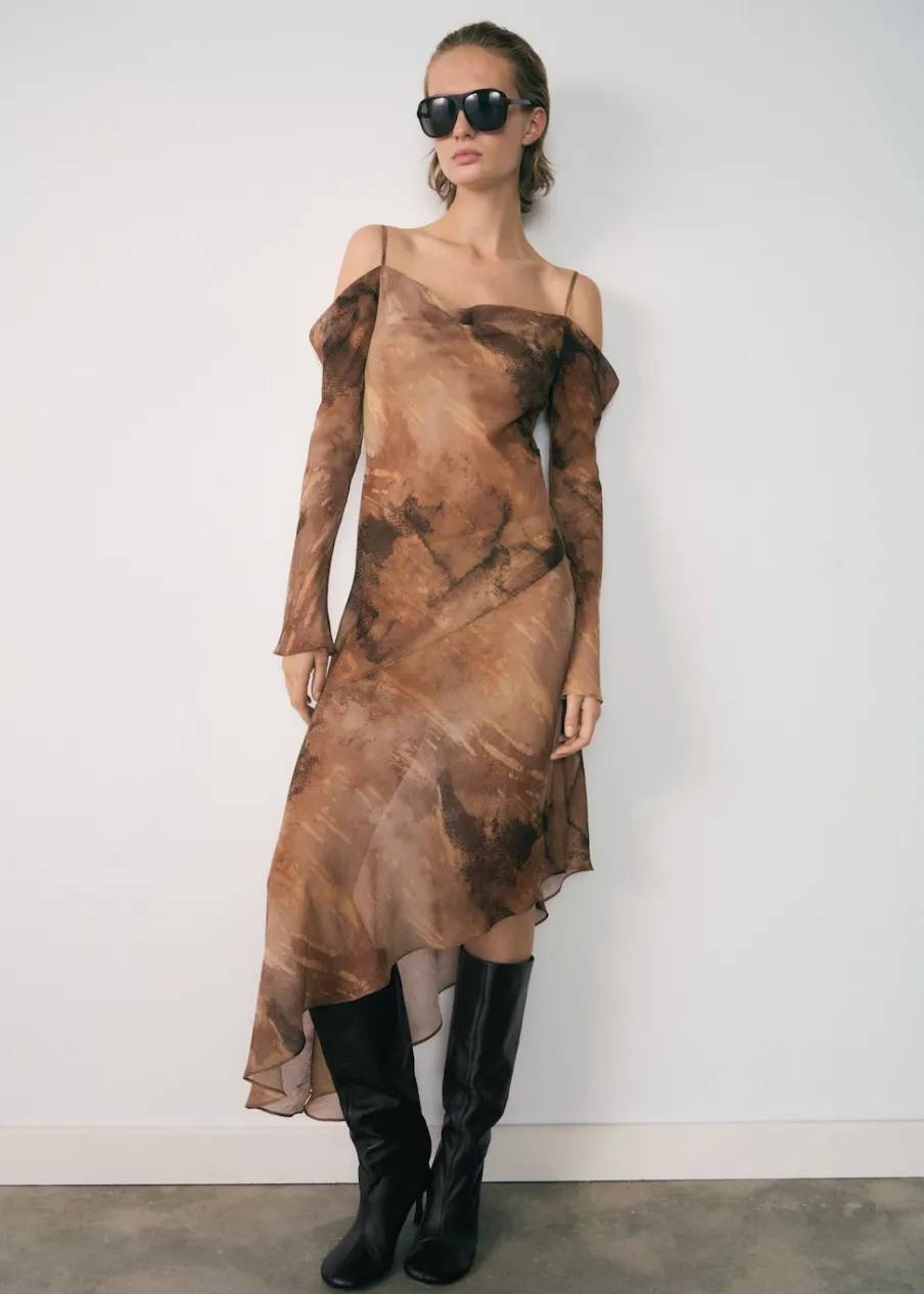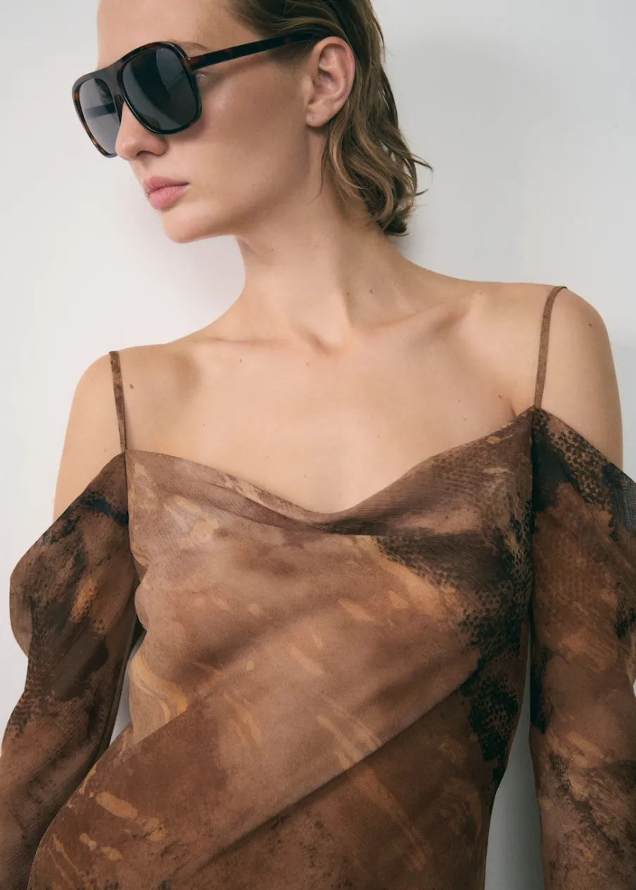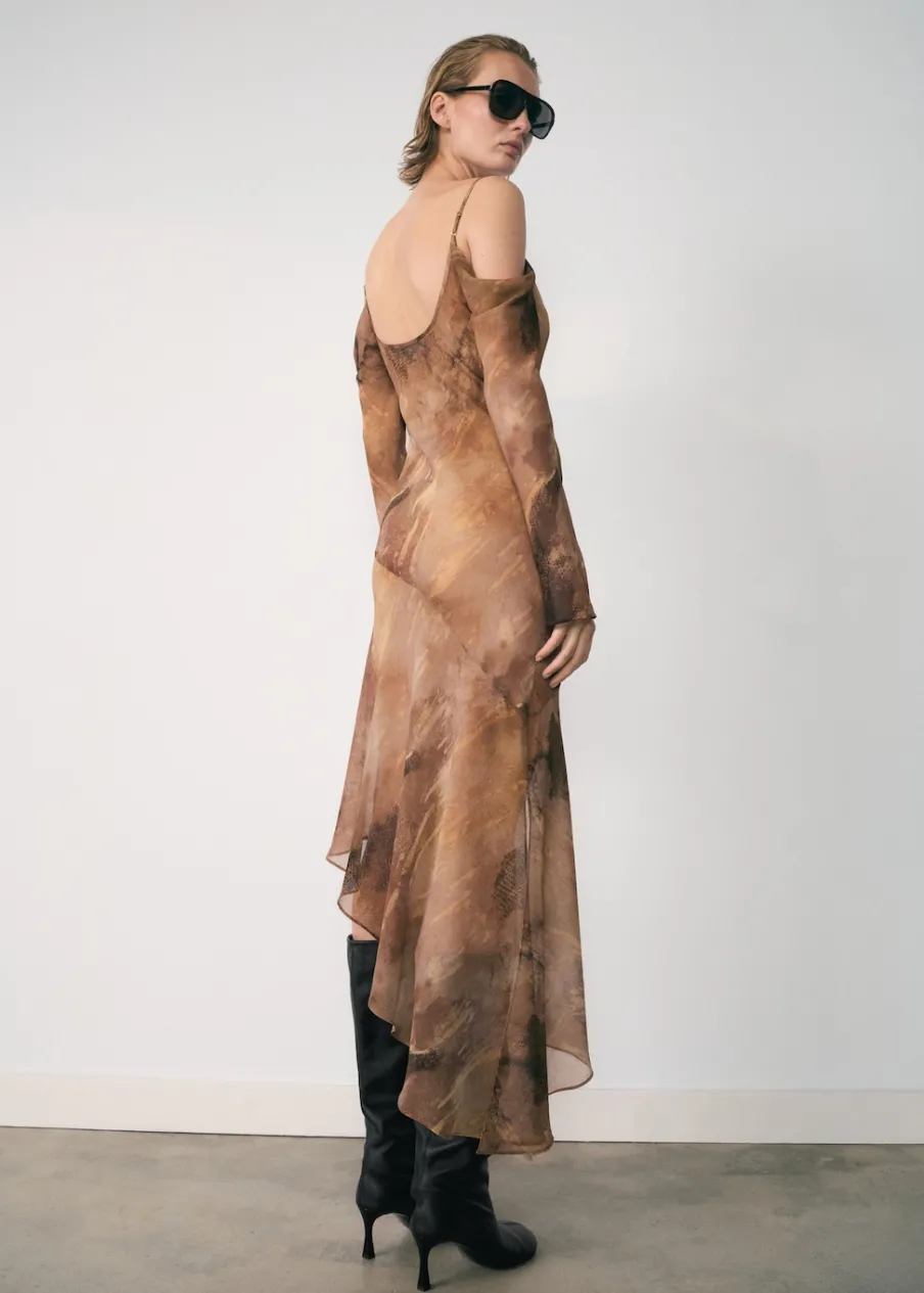 Długi rękaw. Kolekcja wizytowa. Modelka ma 178 cm wzrostu i nosi rozmiar S/36. Modelka ma 177 cm wzrostu i nosi rozmiar S/36. Cienka tkanina. Cienkie ramiączka. Wzorzysty. Model prosty. Dekolt. Asymetryczny dół.
