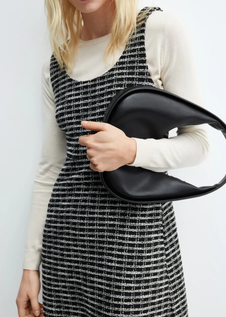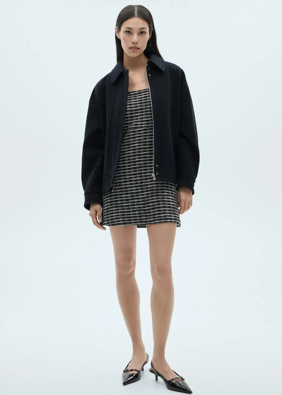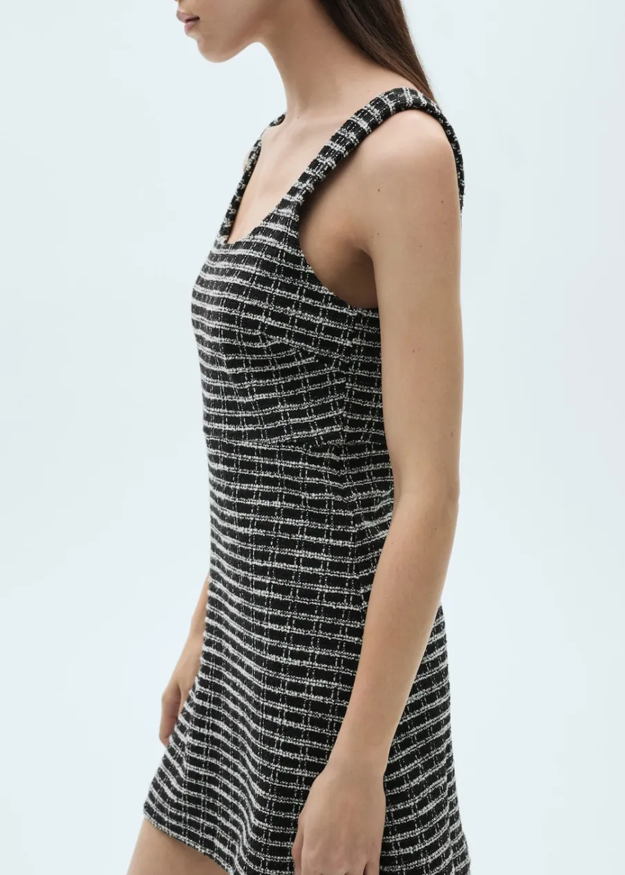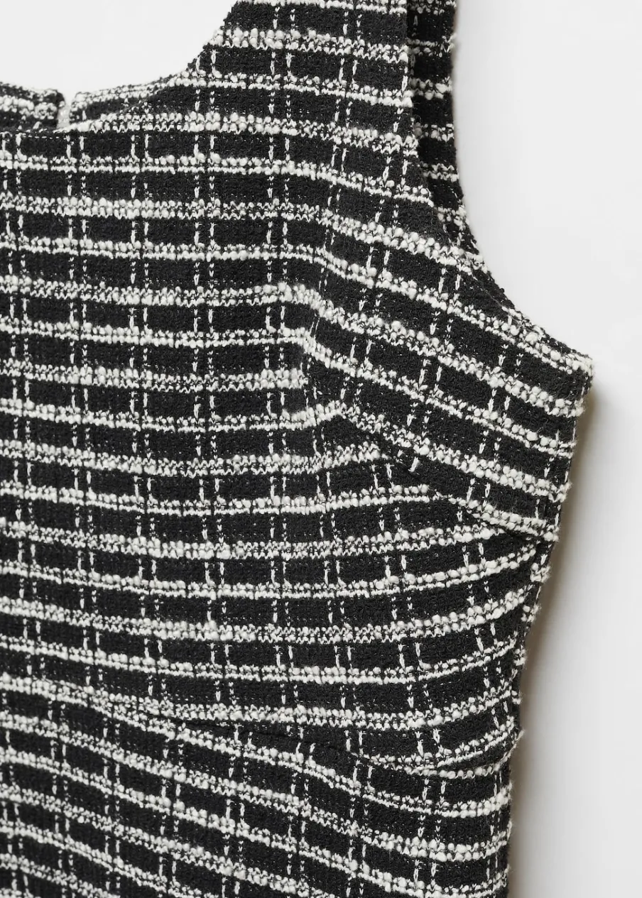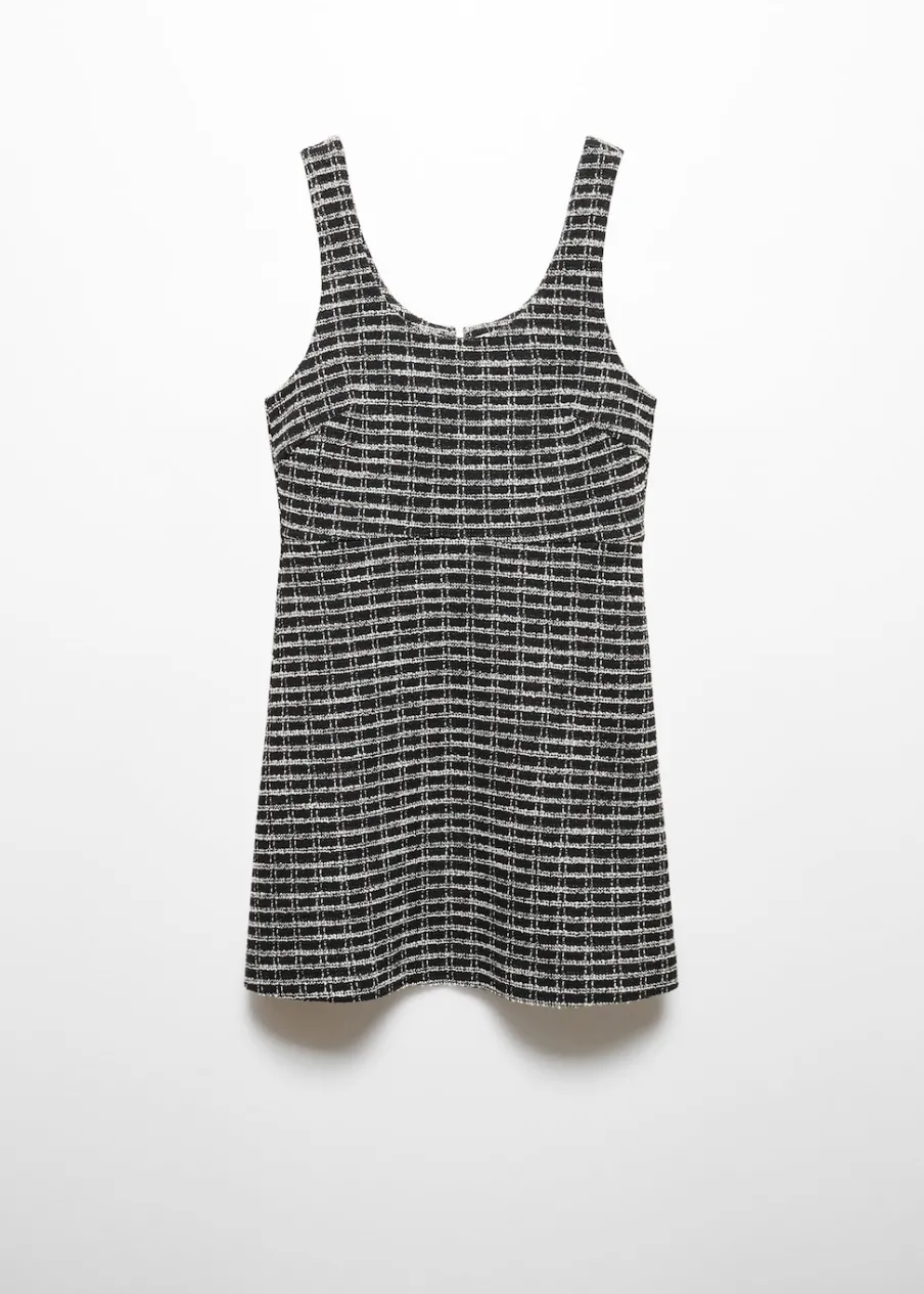 Tkanina z mieszanki bawełny i wełny. Tkanina tweedowa. Krótki krój. Model evasé. Deseń w kratę. Okrągły dekolt. Bez rękawów. Szerokie ramiączka. Zapięcie z tyłu na kryty suwak. Modelka ma 176 cm wzrostu i nosi rozmiar S/36.