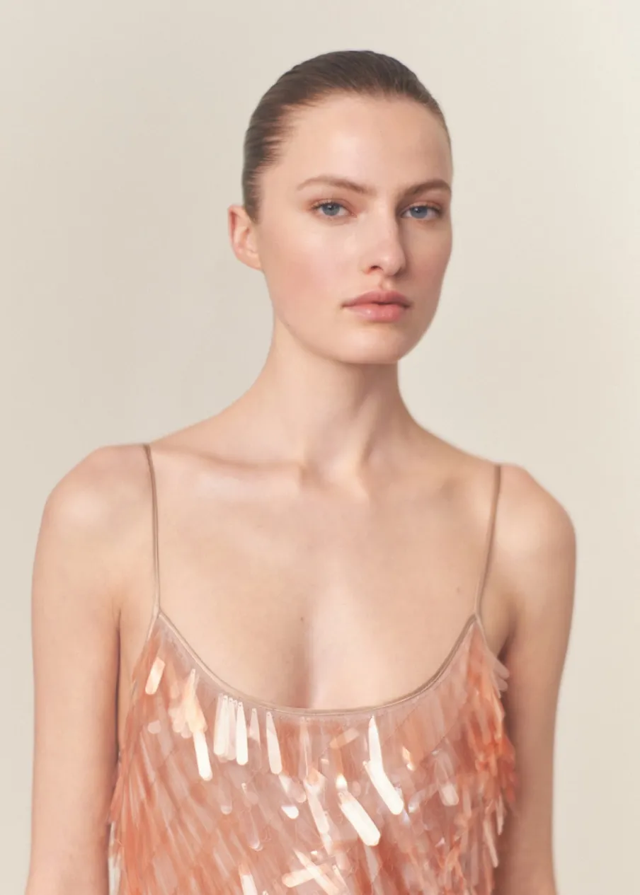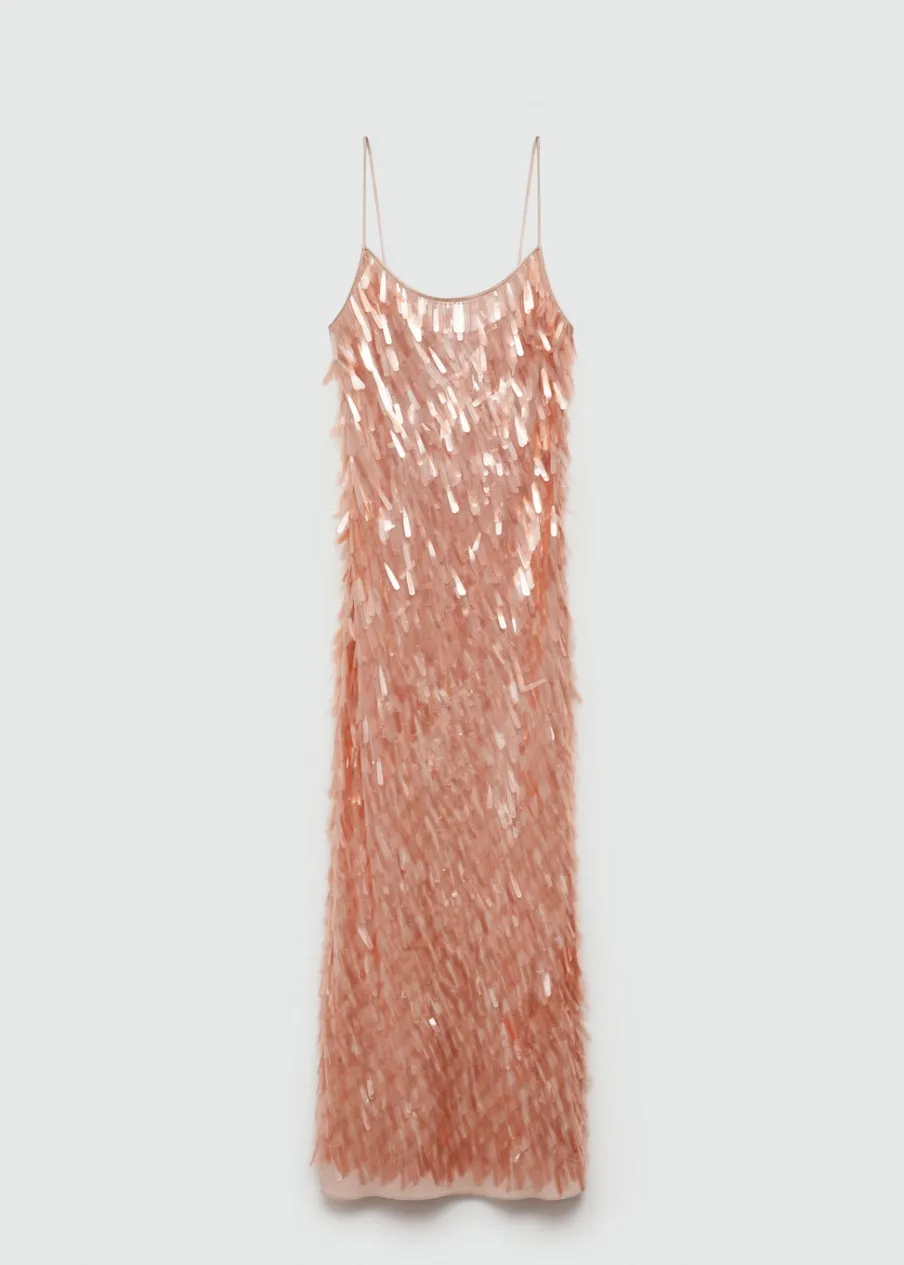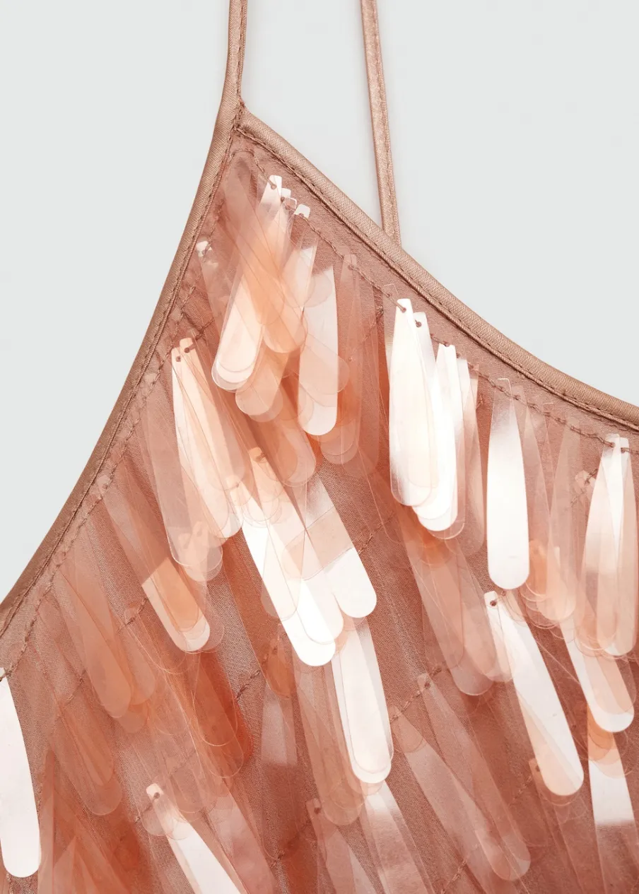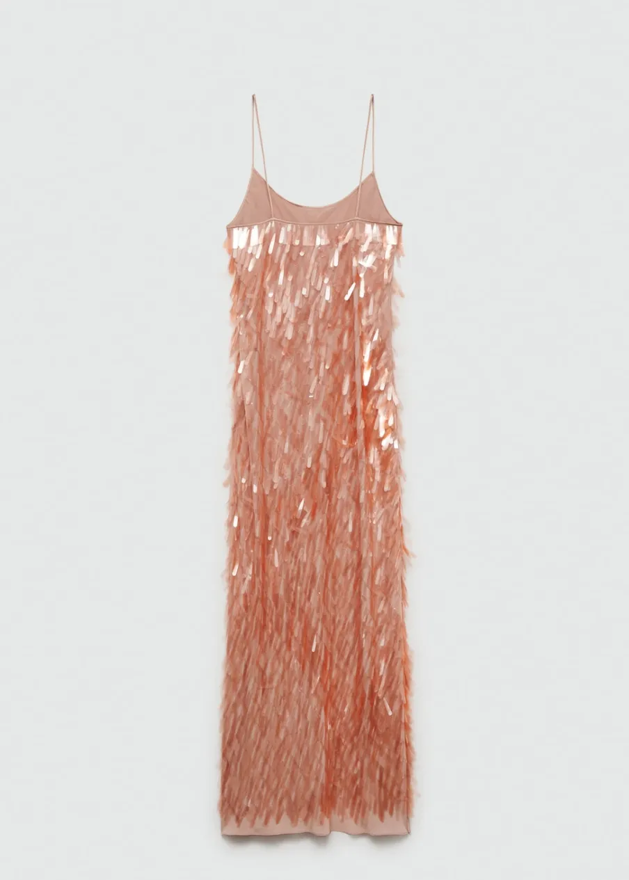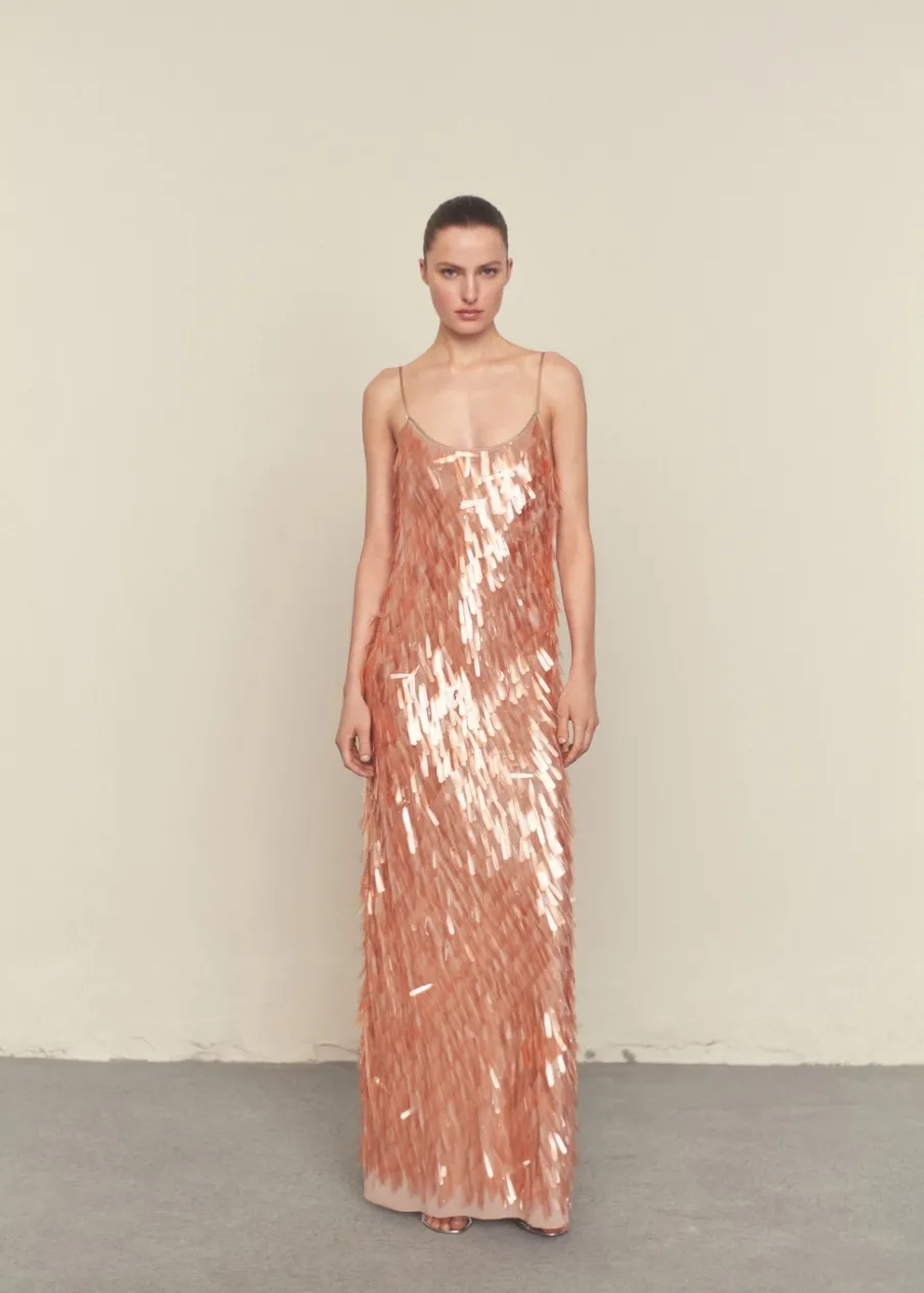 Zostań gwiazdą wieczoru, wkładając tę elegancką szyfonową sukienkę z twarzowym dekoltem, pokrytą cekinami w kształcie łezki. Lejąca tkanina. Cekinowa tkanina. Model długi. Model prosty. Okrągły dekolt. Bez rękawów. Cienkie ramiączka. Bez zapięcia. Wewnętrzna podszewka. Wyrób ręczny. Kolekcja wizytowa. Artykuły z kolekcji CAPSULE można wymienić lub zwrócić w ciągu 14 dni od daty wysyłki.