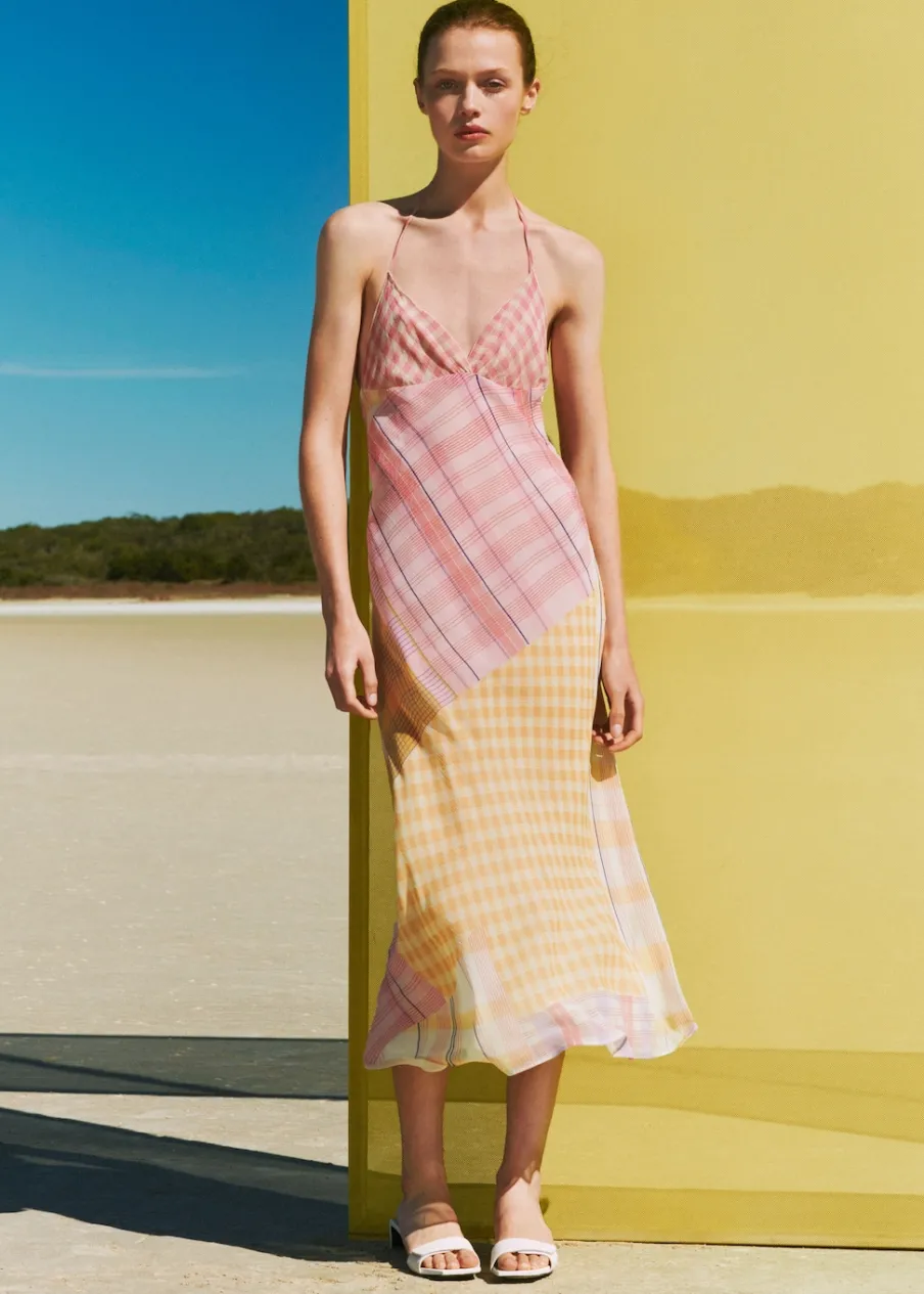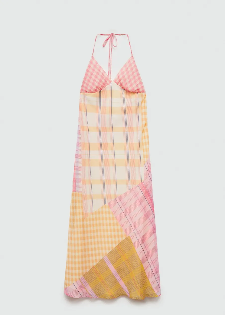 Lejąca tkanina. Model długi. Model prosty. Wzór w kratę. Dekolt w stylu halter. Dekolt V. Bez rękawów. Cienkie ramiączka. Wiązanie na szyi. Boczne zapięcie na suwak. Wewnętrzna podszewka. Pozycja nadruku może się różnić na każdym artykule.