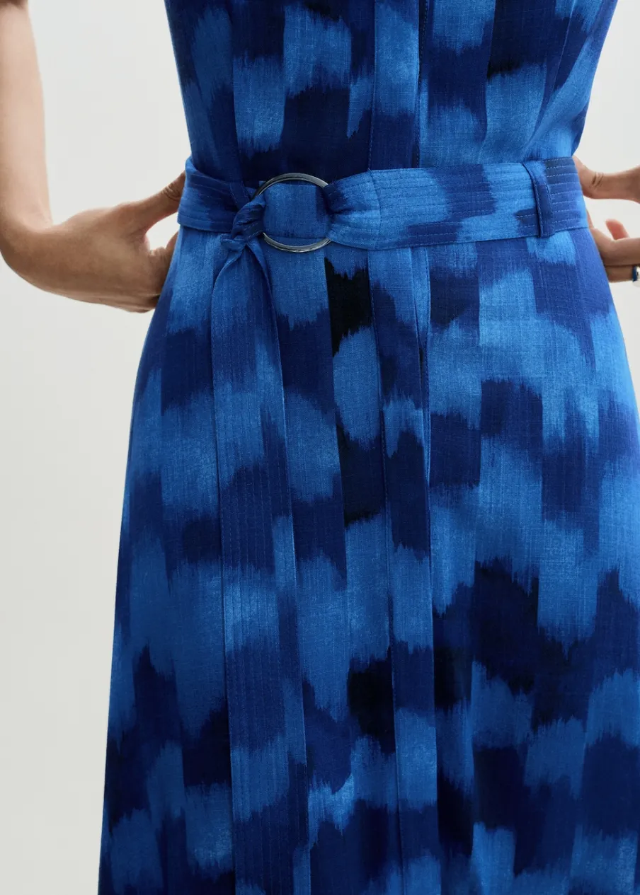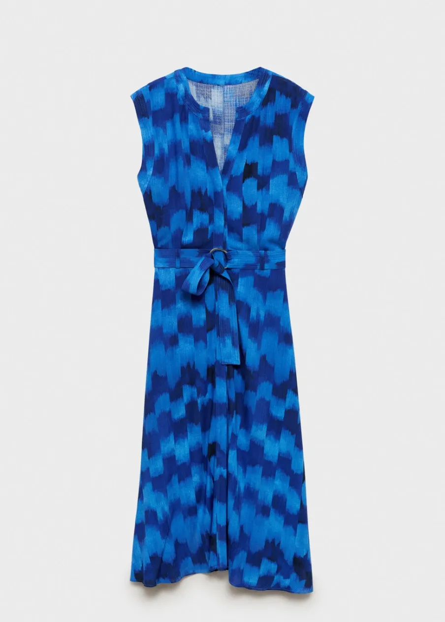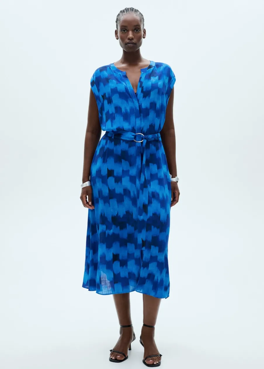 Lejąca tkanina. Krój do kolan. Model evasé. Okrągły dekolt. Bez rękawów. Kryte zapięcie na guziki z przodu. Regulowany pasek. Szlufki. Dostępne w Plus Size. Nadruk.