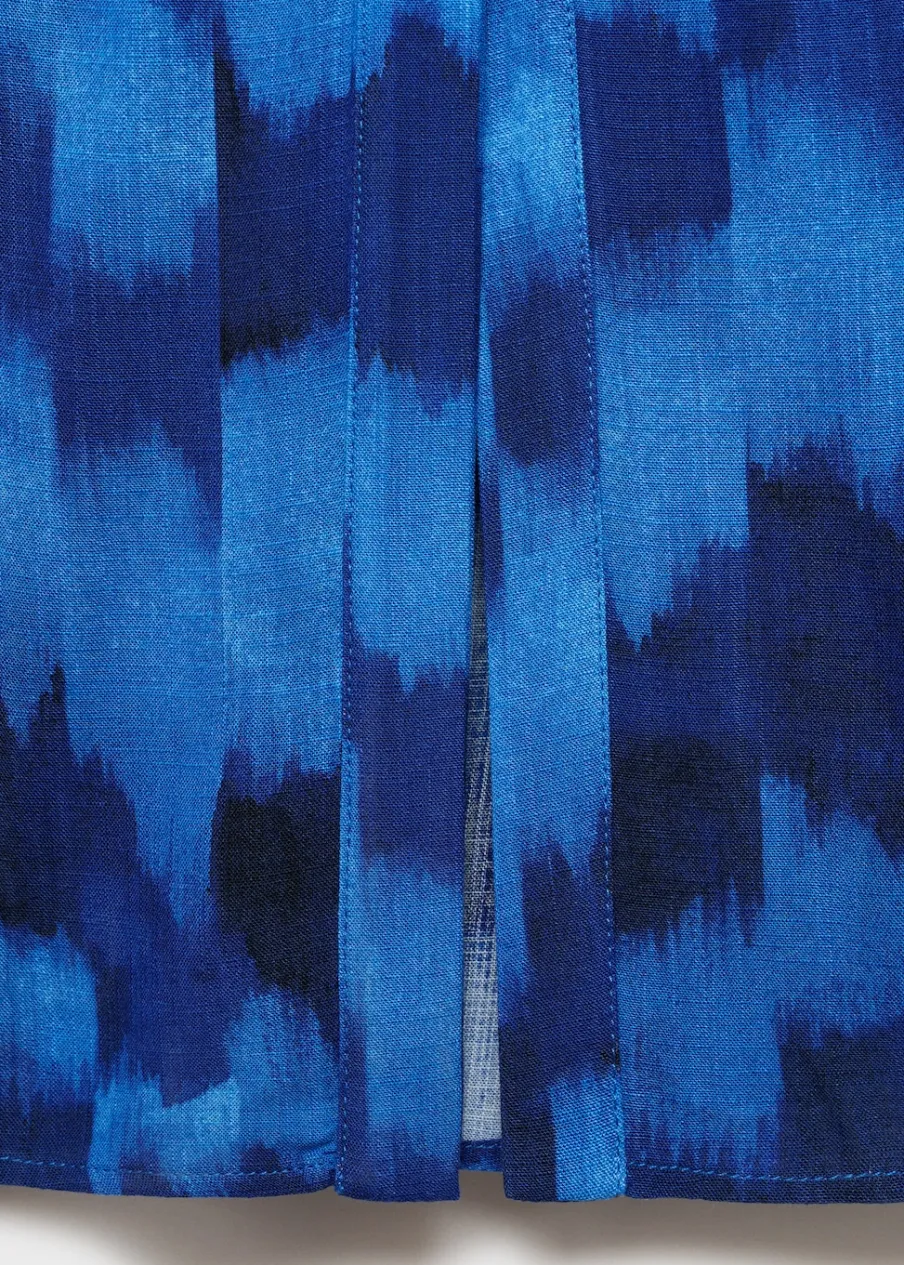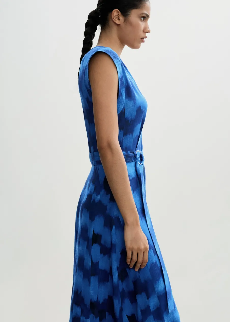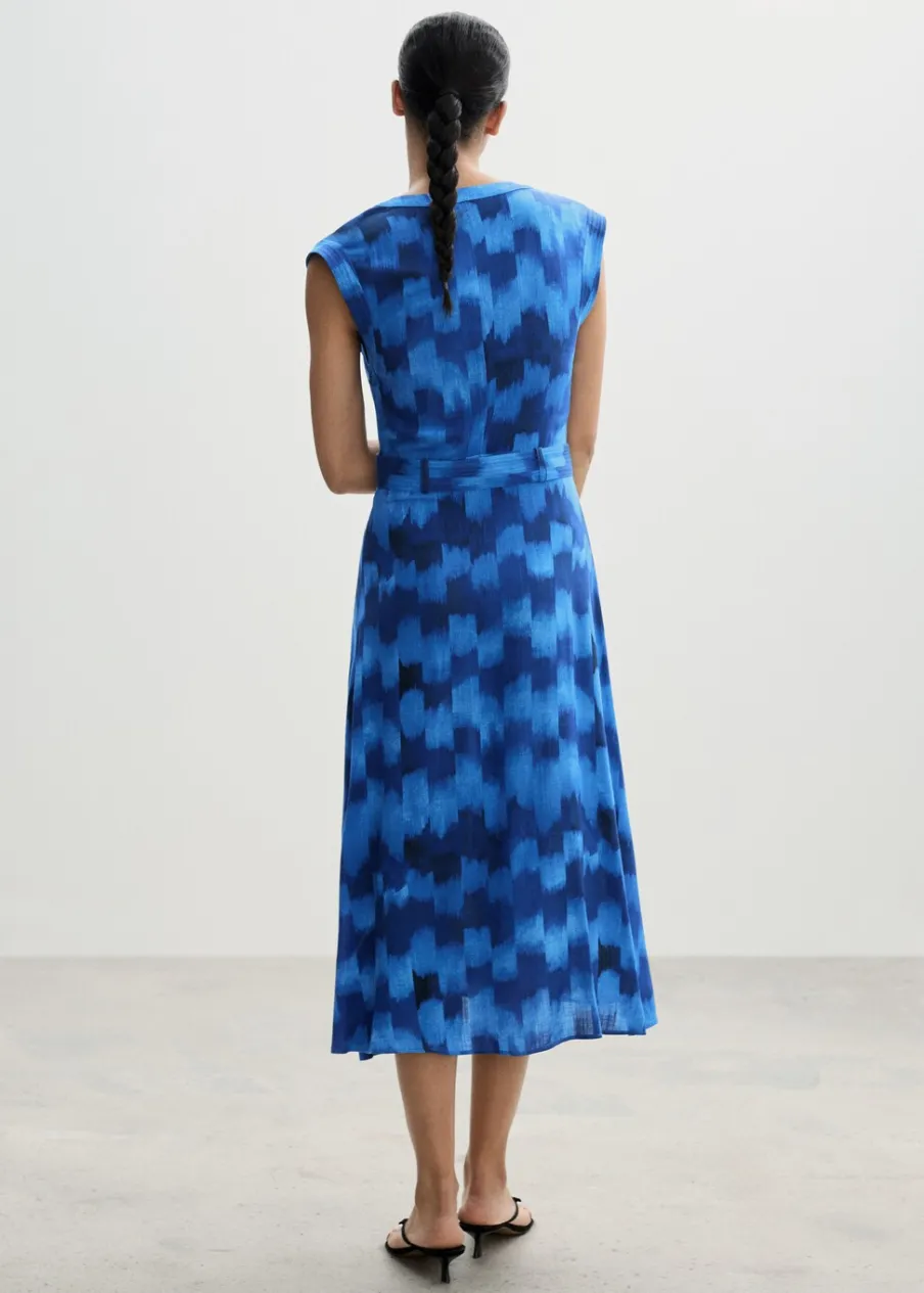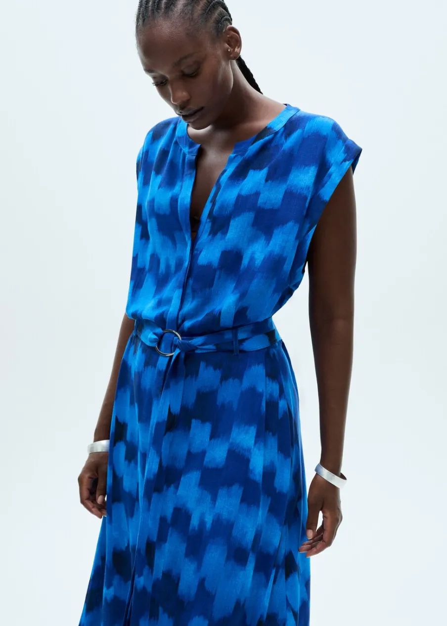 Lejąca tkanina. Krój do kolan. Model evasé. Okrągły dekolt. Bez rękawów. Kryte zapięcie na guziki z przodu. Regulowany pasek. Szlufki. Dostępne w Plus Size. Nadruk.