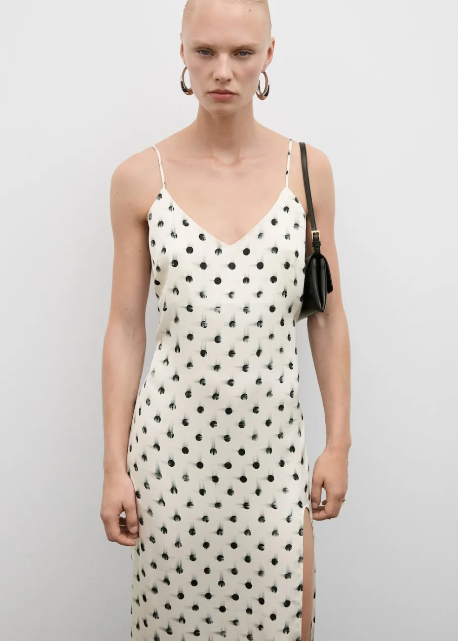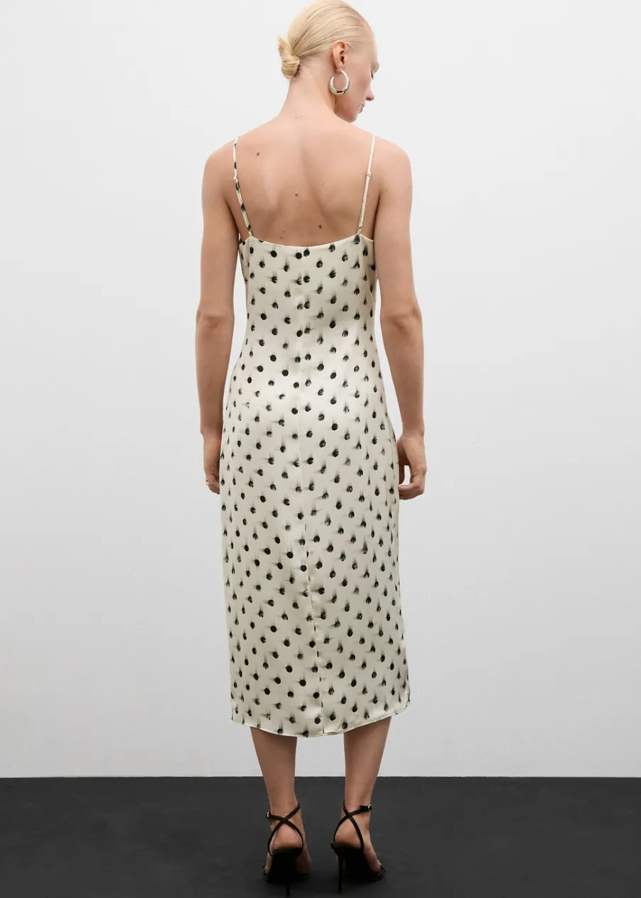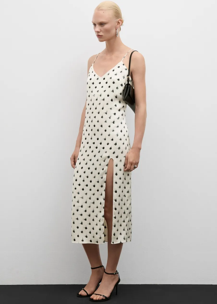 Lejąca tkanina. Model prosty. Krój do kolan. Dekolt V. Bez rękawów. Cienkie ramiączka. Zapięcie z tyłu na kryty suwak. Wewnętrzna podszewka. Rozcięcie u dołu z boku. Nadruk.