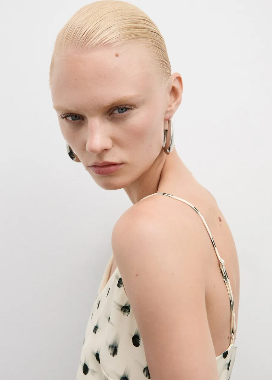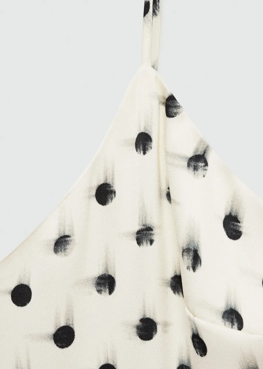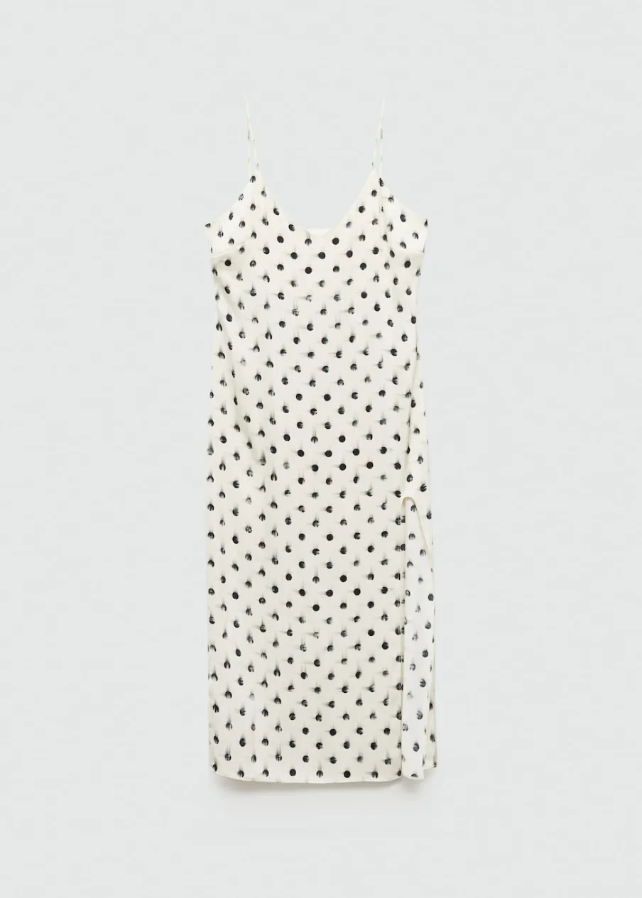 Lejąca tkanina. Model prosty. Krój do kolan. Dekolt V. Bez rękawów. Cienkie ramiączka. Zapięcie z tyłu na kryty suwak. Wewnętrzna podszewka. Rozcięcie u dołu z boku. Nadruk.