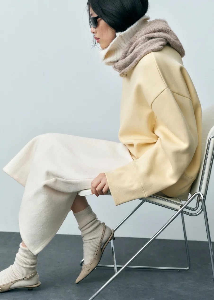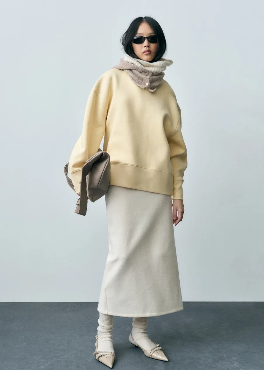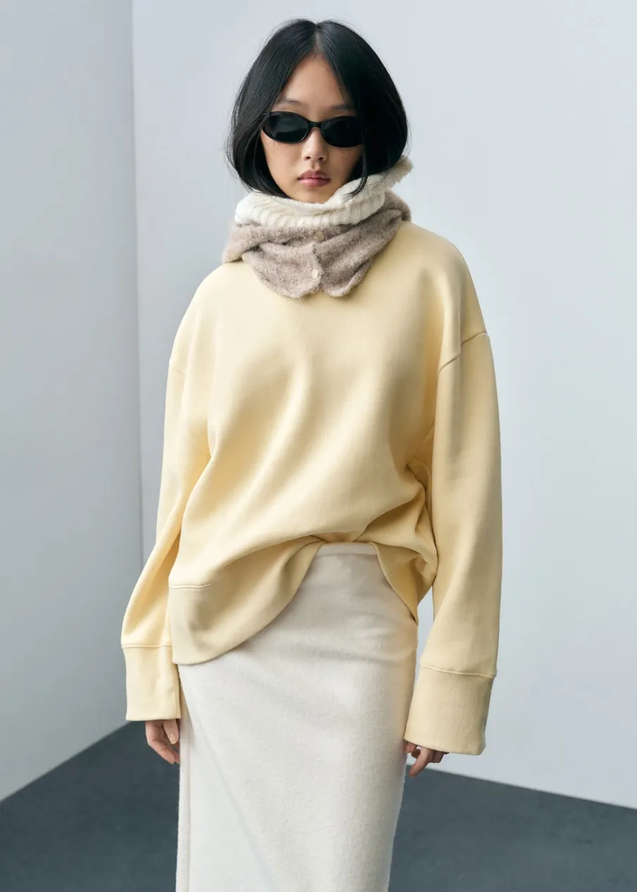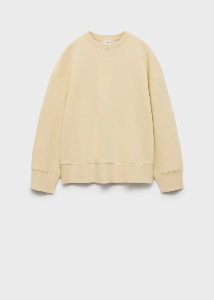 Bawełniana tkanina. Teksturowana tkanina. Model oversize. Krój regular. Okrągły dekolt. Ramiona z obniżonym szwem. Długi rękaw. Bez zapięcia. Kontrastowe ściągaczowe wykończenia.