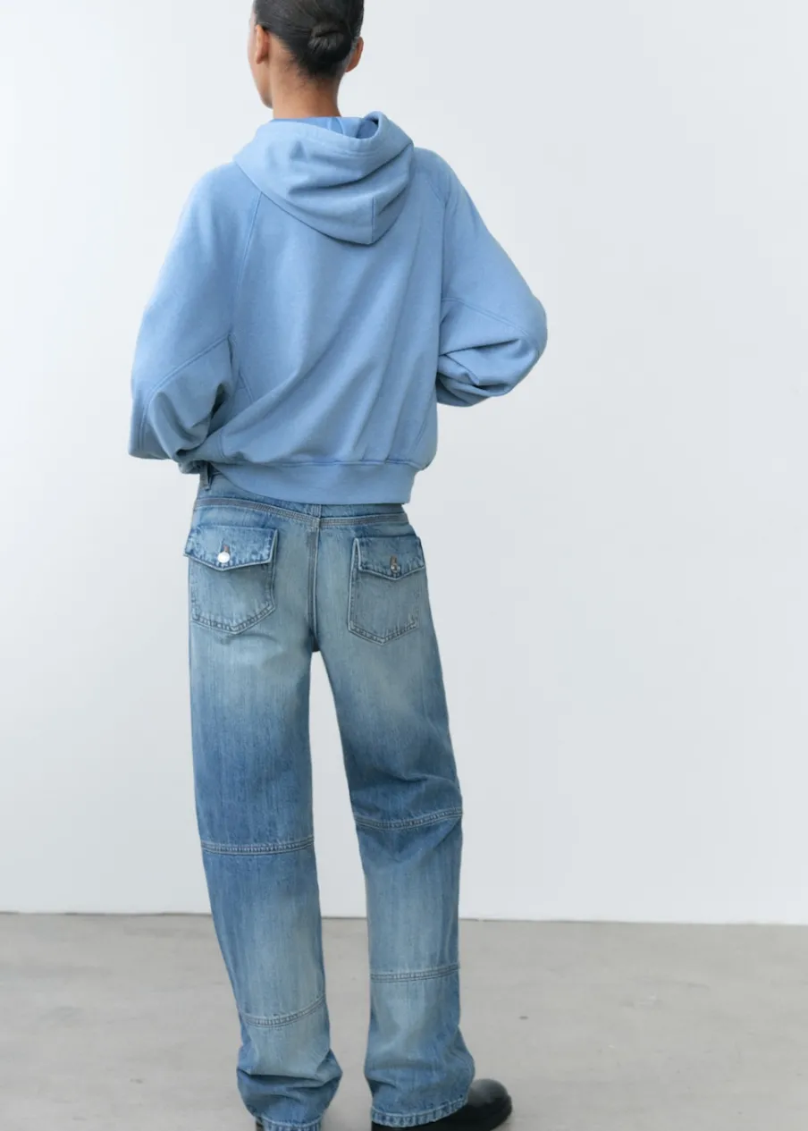 Model prosty. Okrągły dekolt. Kaptur. Długi rękaw z elastycznymi mankietami. Duża kieszeń. Modelka ma 178 cm wzrostu i nosi rozmiar S/36. Tkanina mieszanka bawełny. Model oversize.