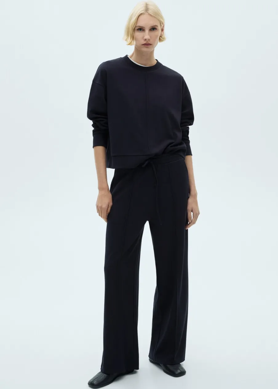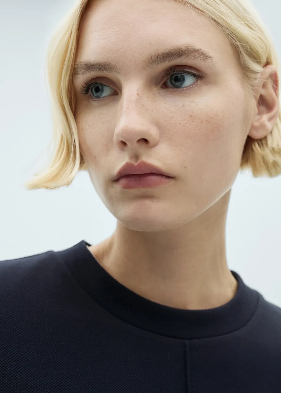 Lejąca tkanina. Model standardowy. Model prosty. Okrągły dekolt. Długi rękaw. Bez zapięcia. Total look.