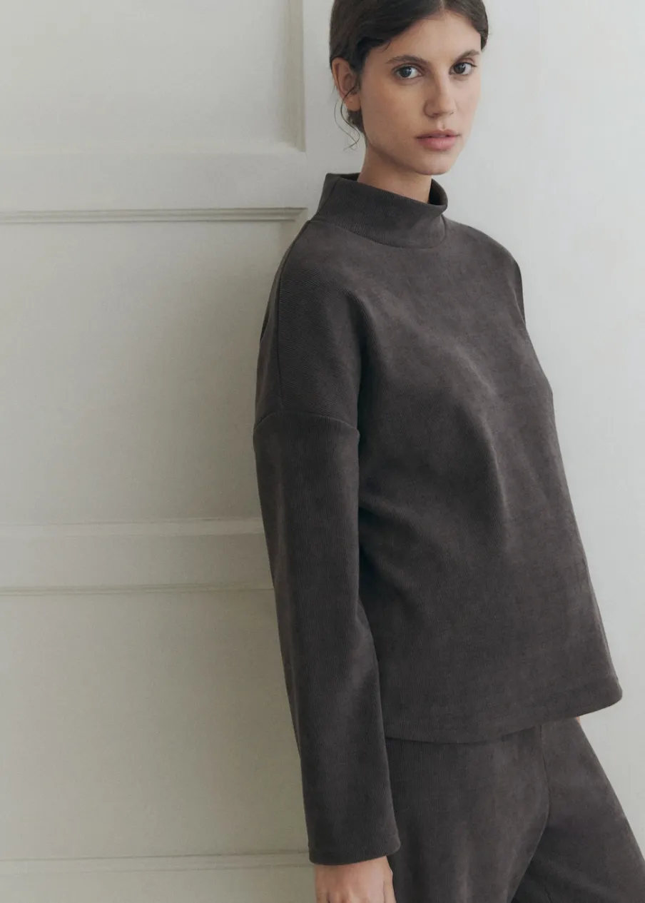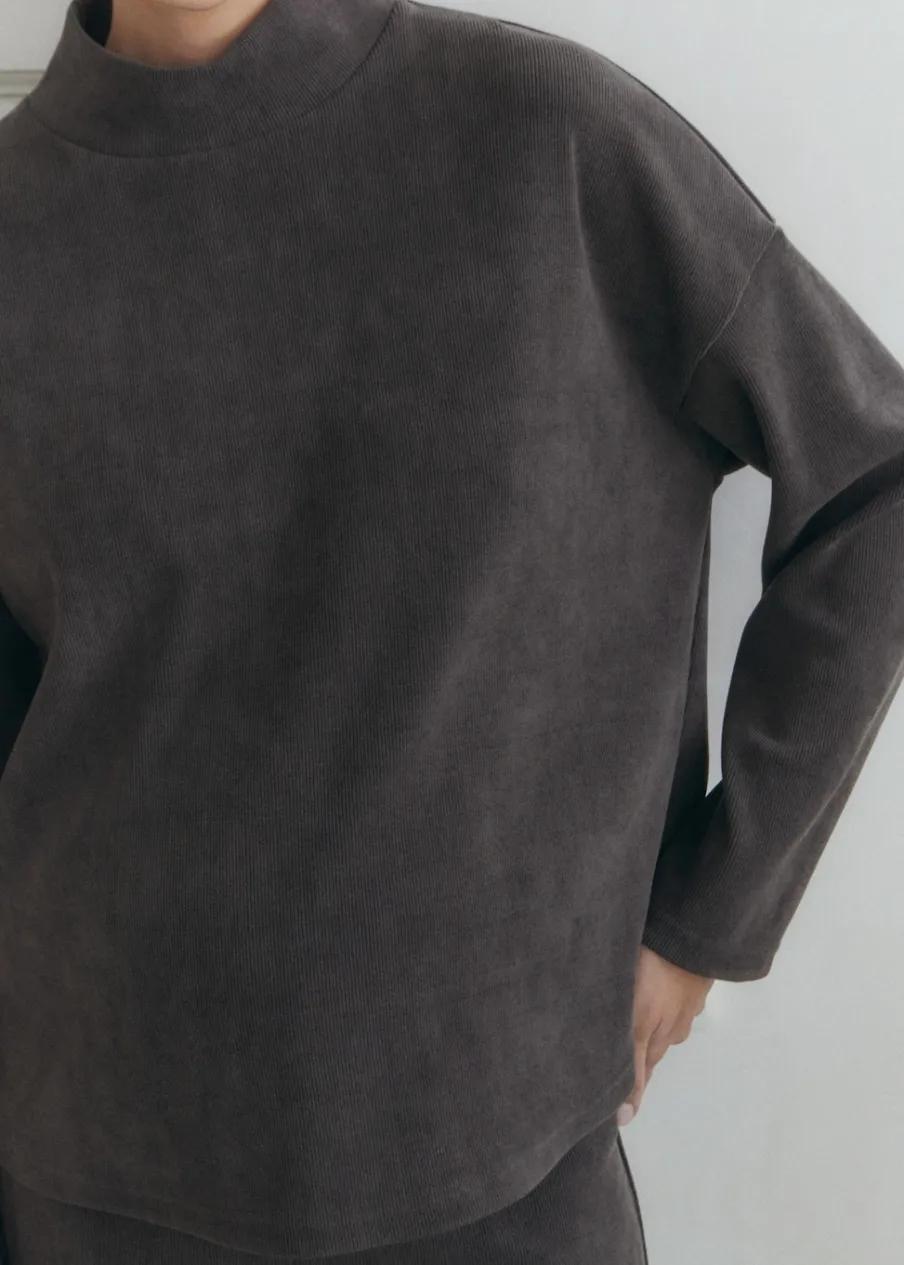 Sztruksowa tkanina. Model prosty. Półgolf. Długi rękaw. Bez zapięcia. Odzież ciążowa. Zapewnia wygodę i swobodę ruchów. Polecamy kupić zwyczajowy rozmiar. Elastyczna tkanina. Total look.