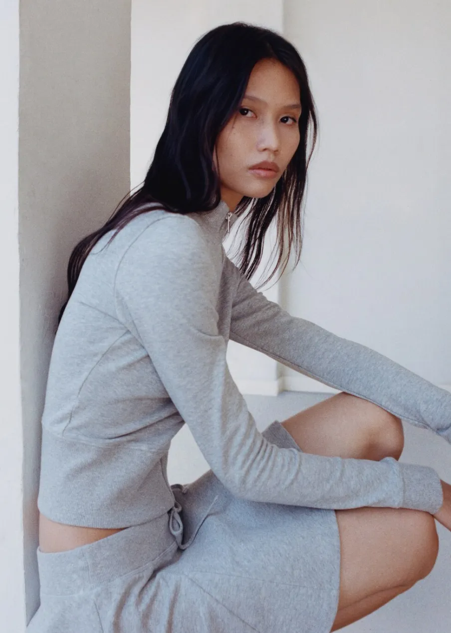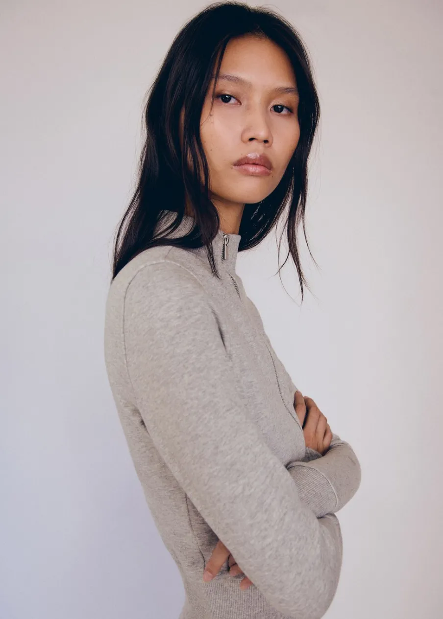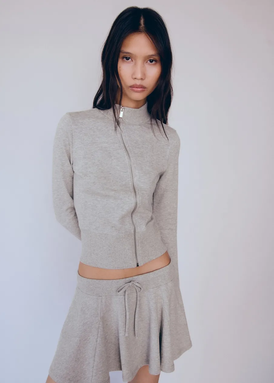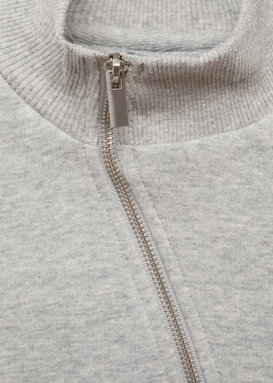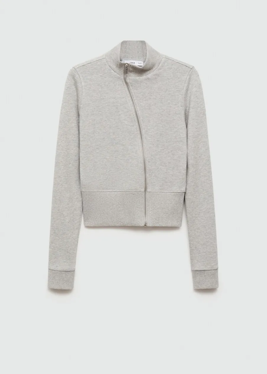 Tkanina mieszanka bawełny. Model wcięty. Okrągły dekolt. Długi rękaw. Elastyczne mankiety. Elastyczny pas. Asymetryczne zapięcie na suwak. Modelka ma 178 cm wzrostu i nosi rozmiar S/36. Total look.