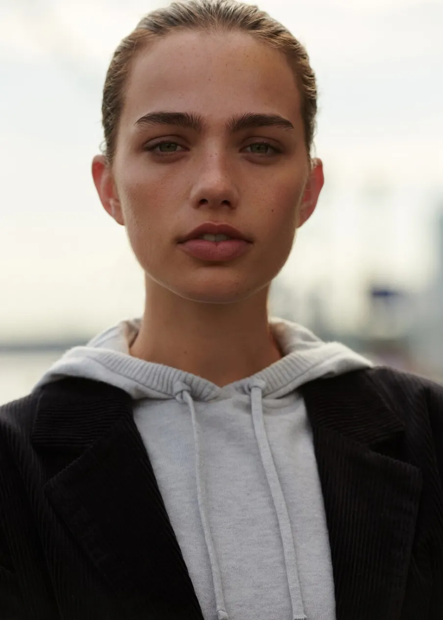 Powrót do szkoły. Model prosty. Kaptur z troczkami. Długi rękaw. Modelka ma 168 cm wzrostu i nosi rozmiar M.
