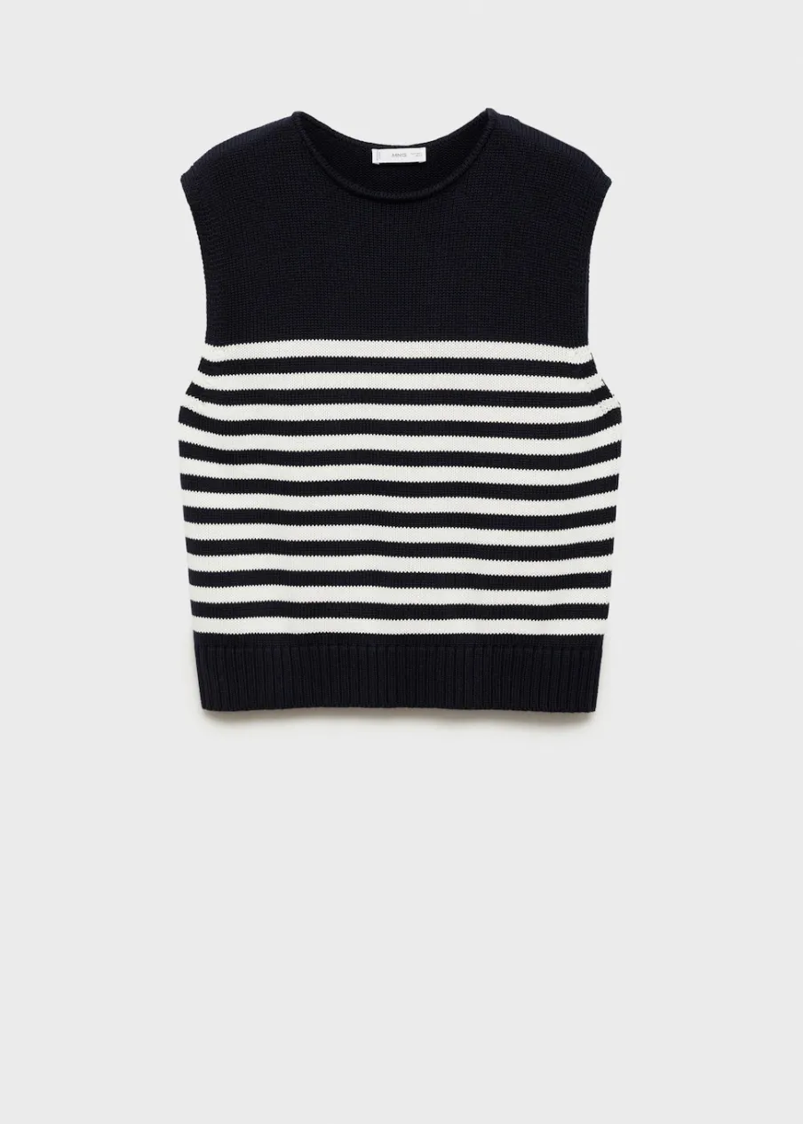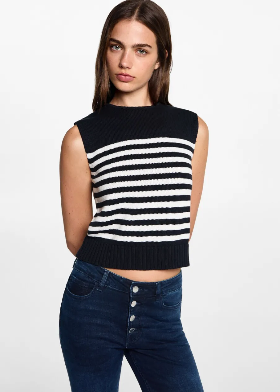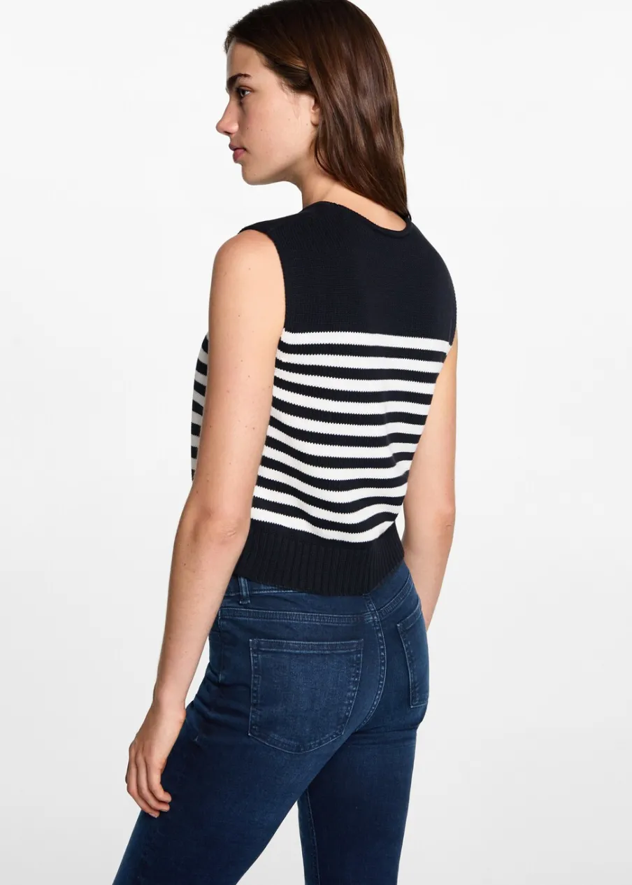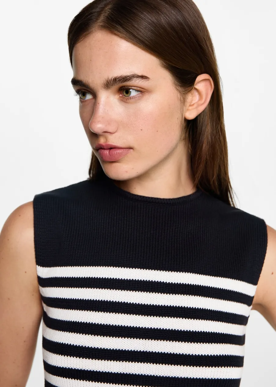 100% bomull. Dzianinowa tkanina. Model prosty. Okrągły dekolt. Bez rękawów. Modelka ma 172 cm wzrostu i nosi rozmiar M. Powrót do szkoły. Wzór w paski.