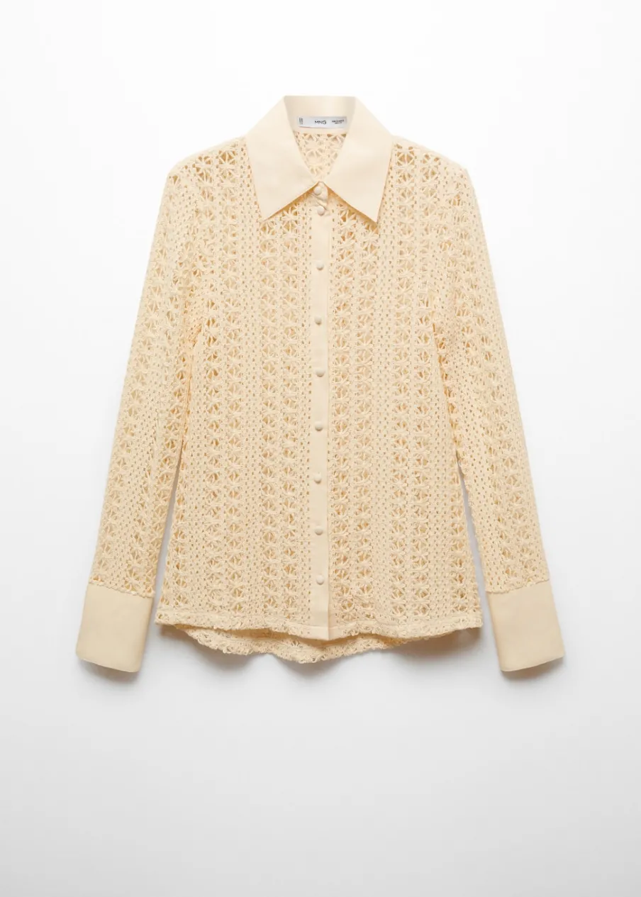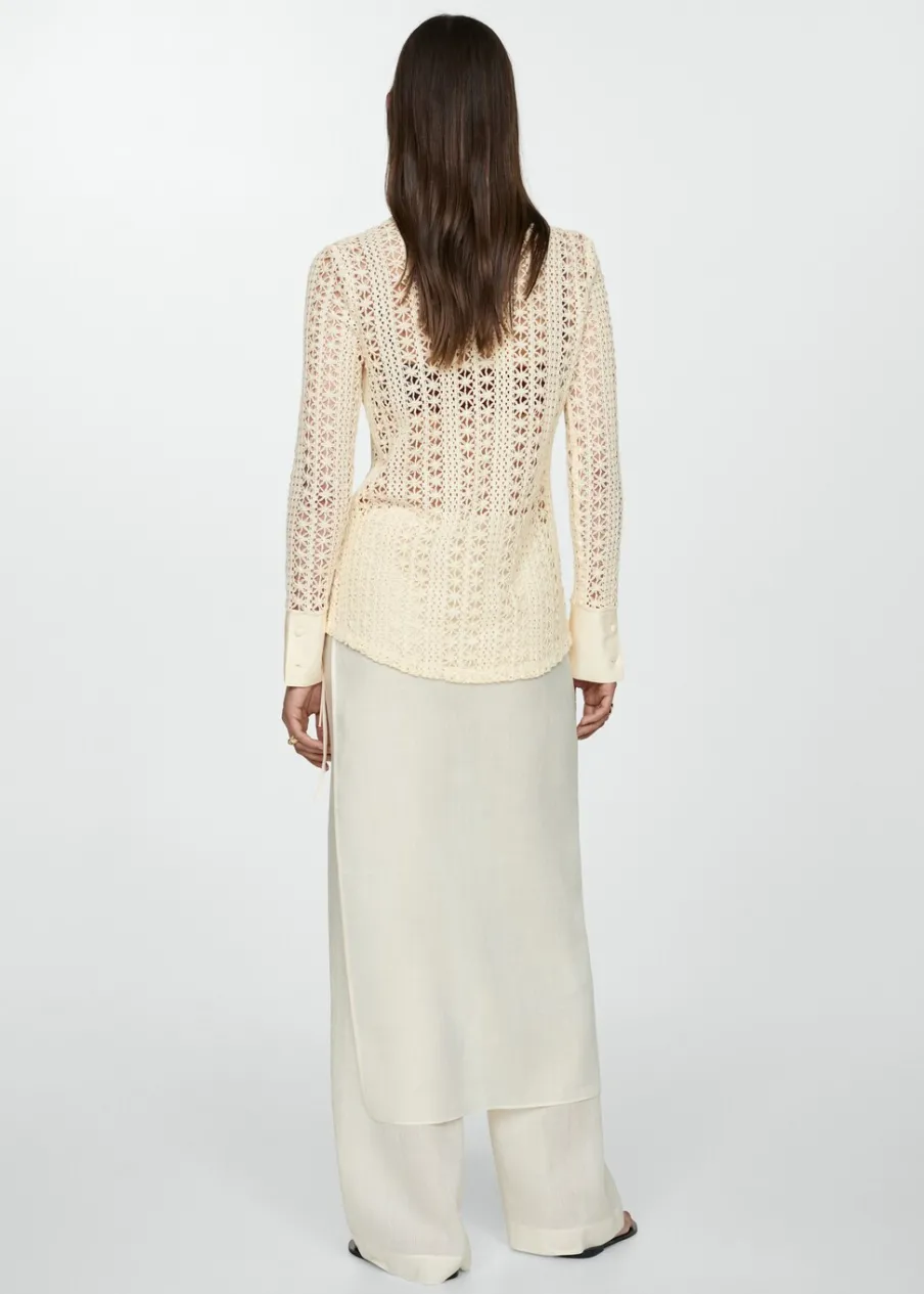 Tkanina mieszanka bawełny. Szydełkowy model. Model prosty. Koszulowy kołnierz. Długi rękaw z guzikami na mankietach. Kontrastowe wykończenia. Sezon festiwalowy. Zapięcie na guziki z przodu.